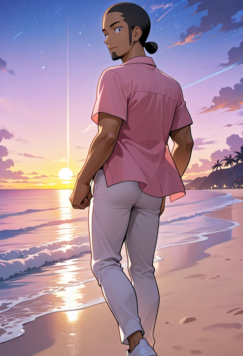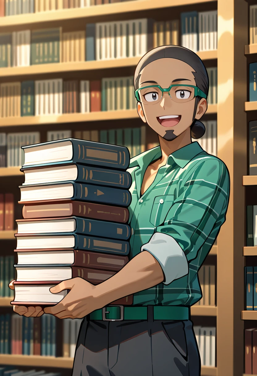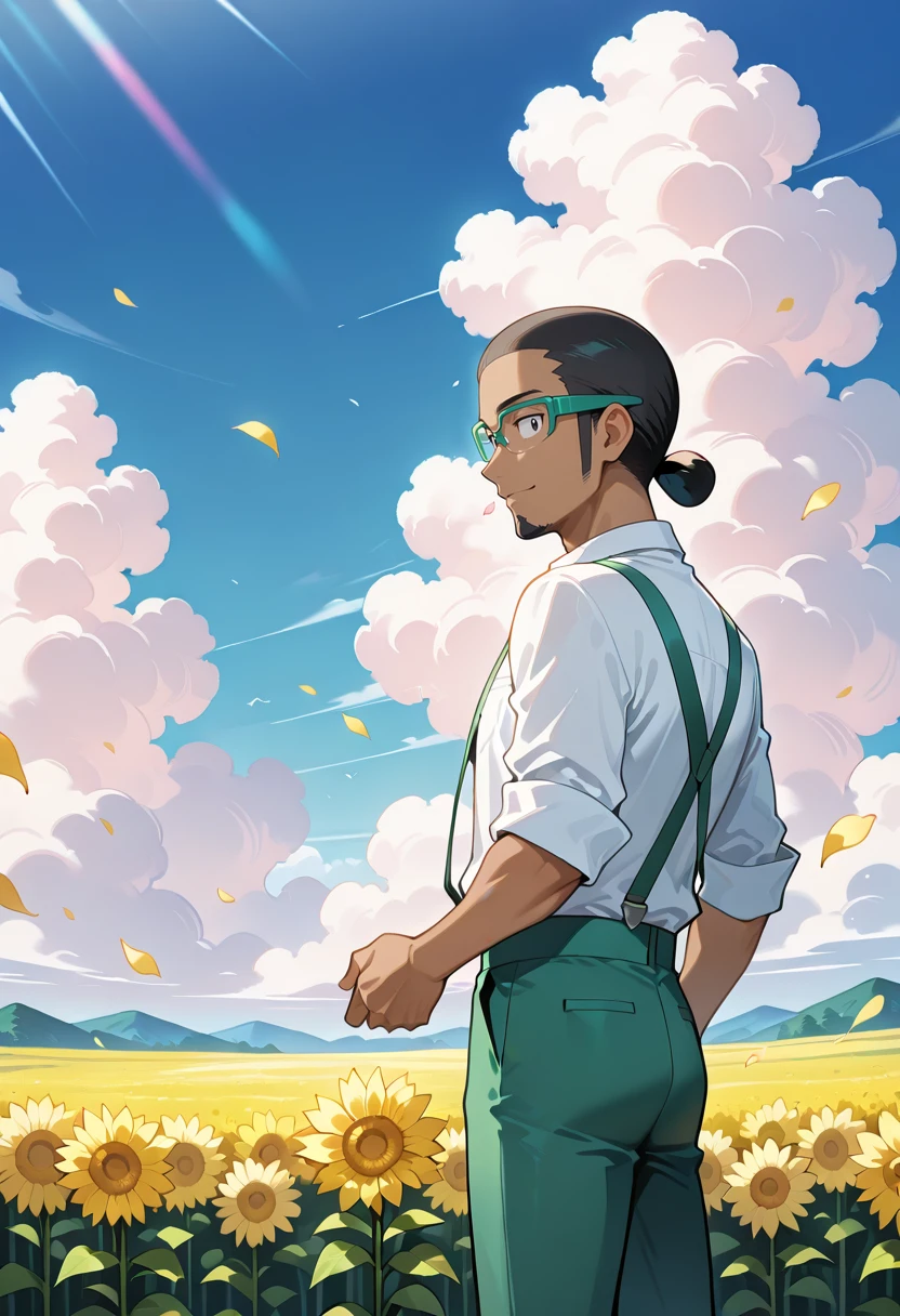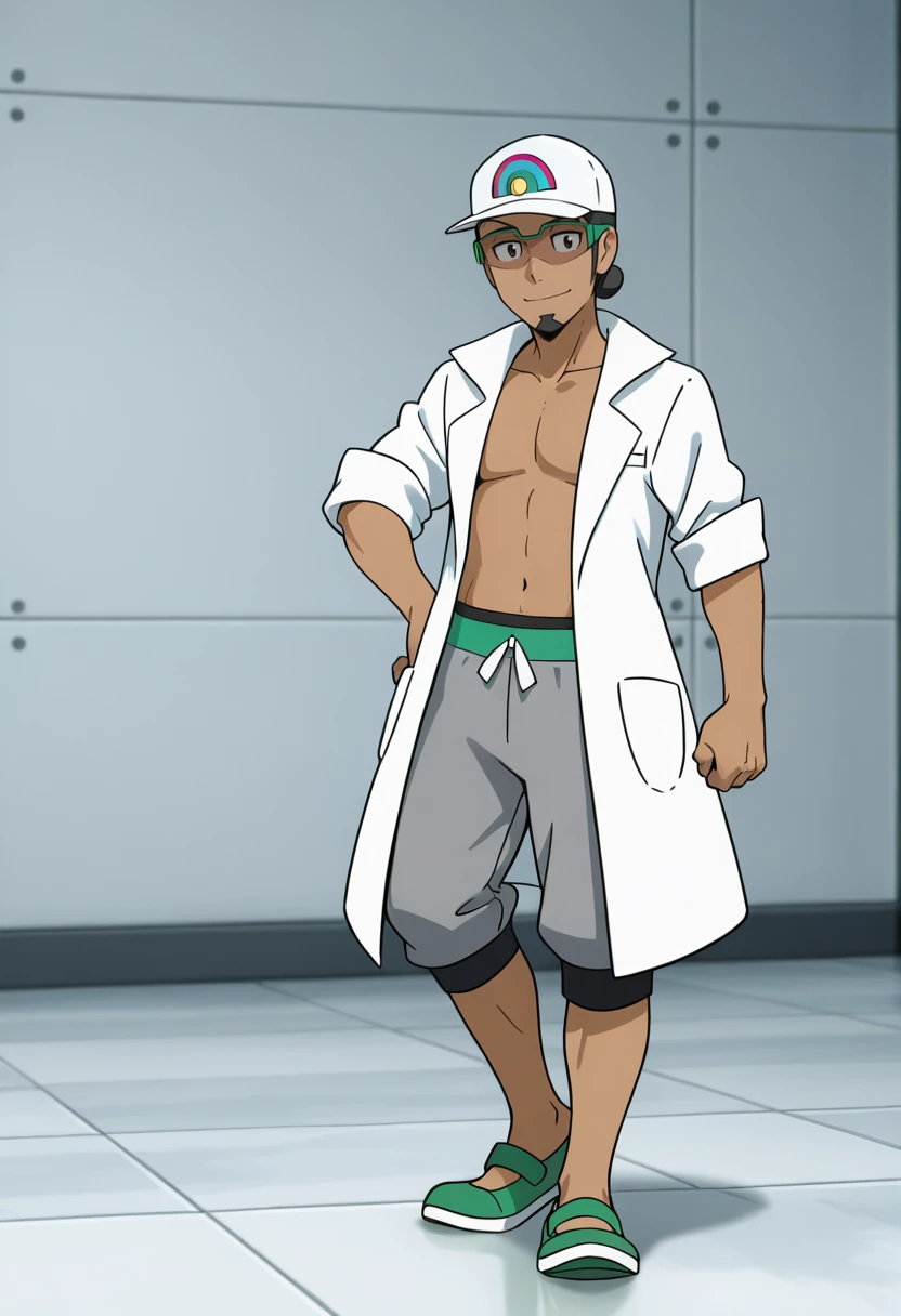 Kukui, ProfKukui, 1boy, solo, dark-skinned_male, black_hair, goatee, black_eyes, green-framed_eyewear, white_cap, logo_on_cap, rainbow_emblem, lab_coat, open_coat, grey_capri_sweatpants, green_waistband, white_drawstring, green_strap_sandals
