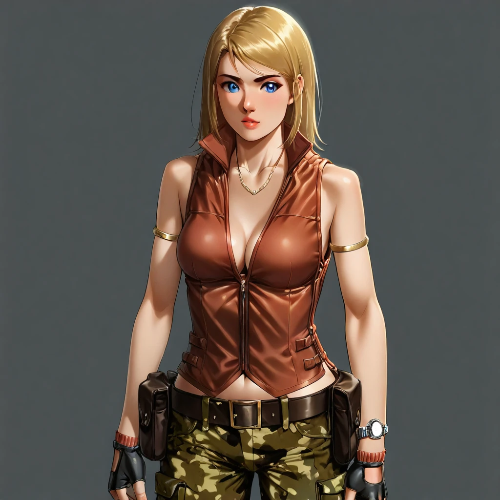 vest, camouflage pants, necklace, armlet, wristwatch, belt, pouch, fingerless gloves, boots