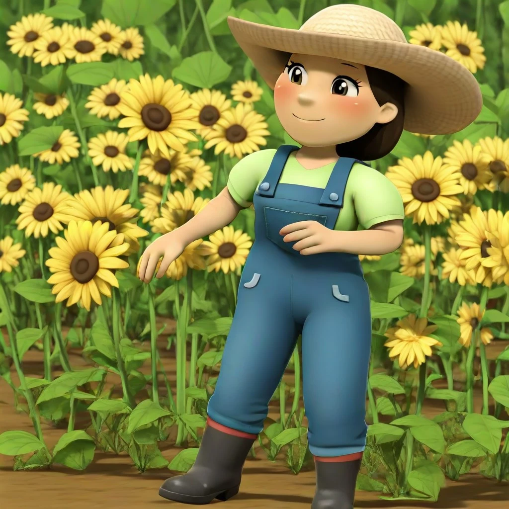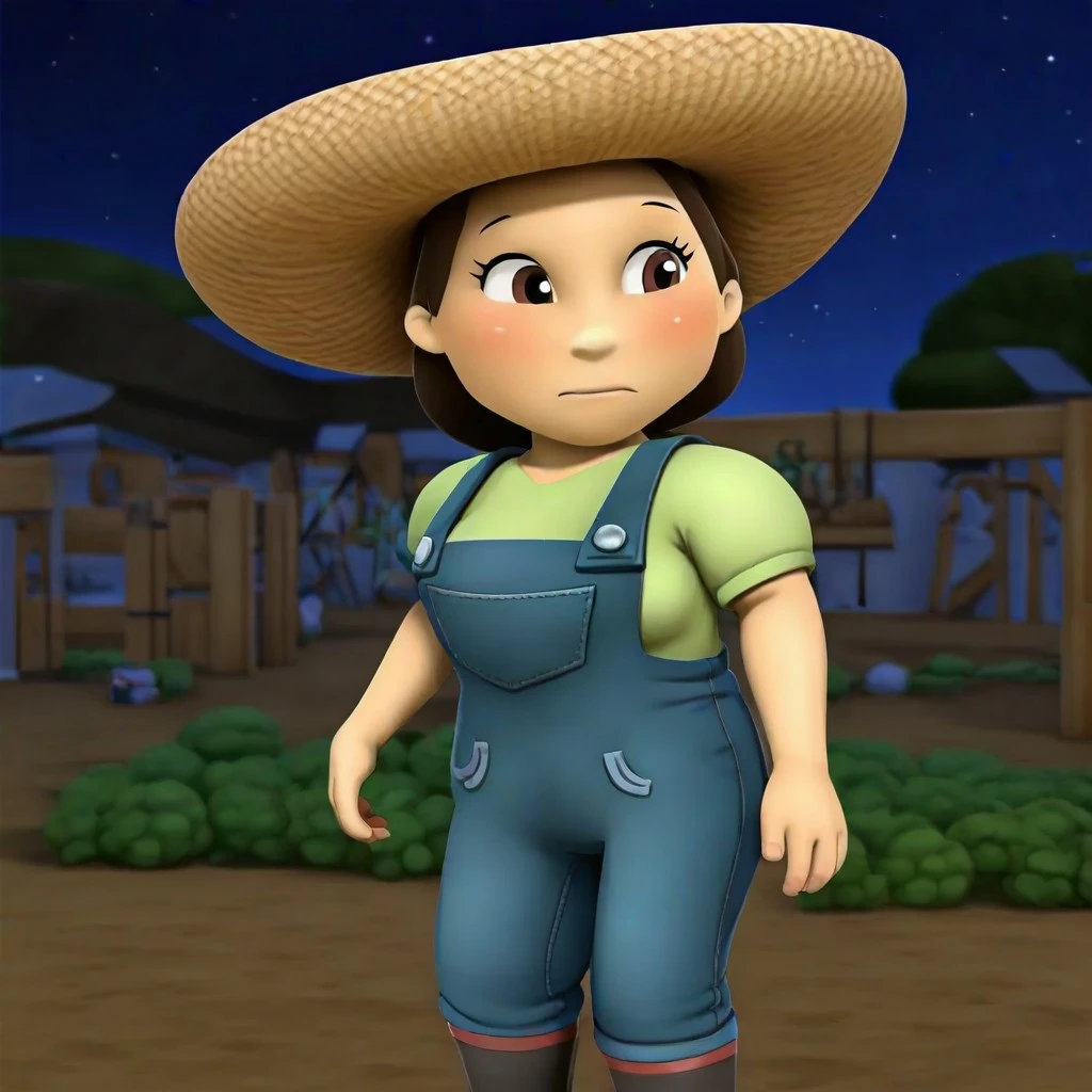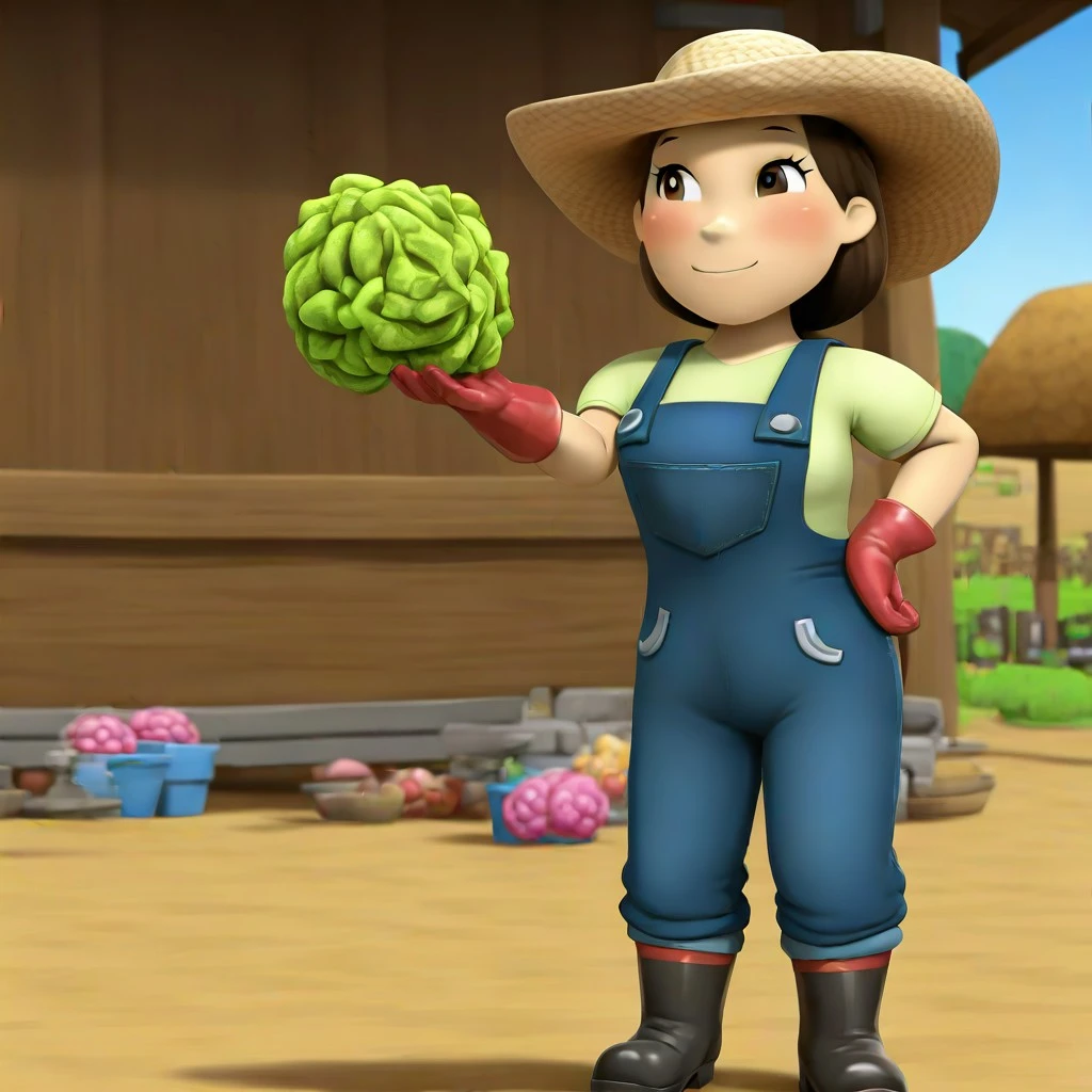 Farmer Yumi, 1girl, solo, brown eyes, brown hair, hat, scrunchies, breasts