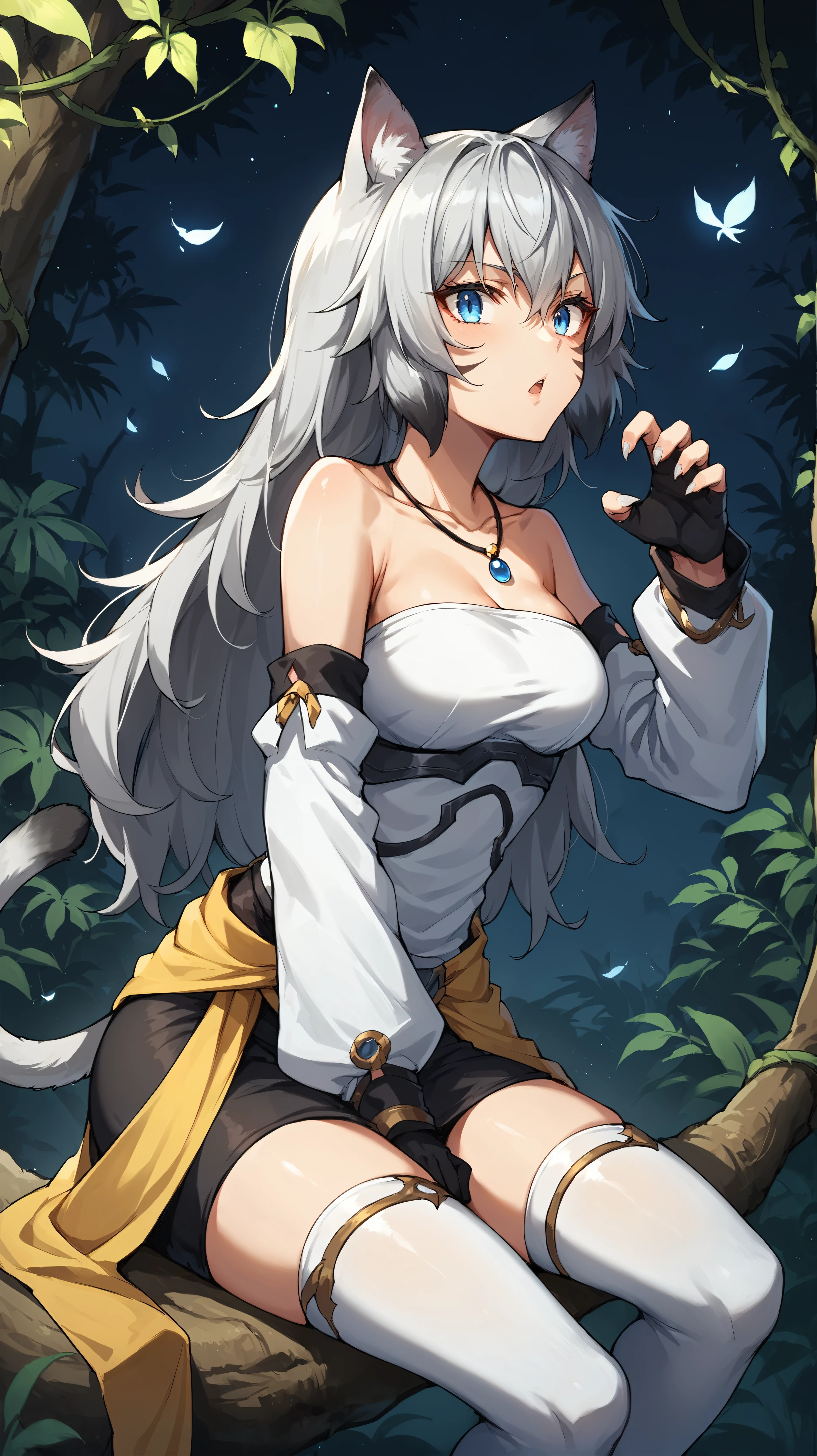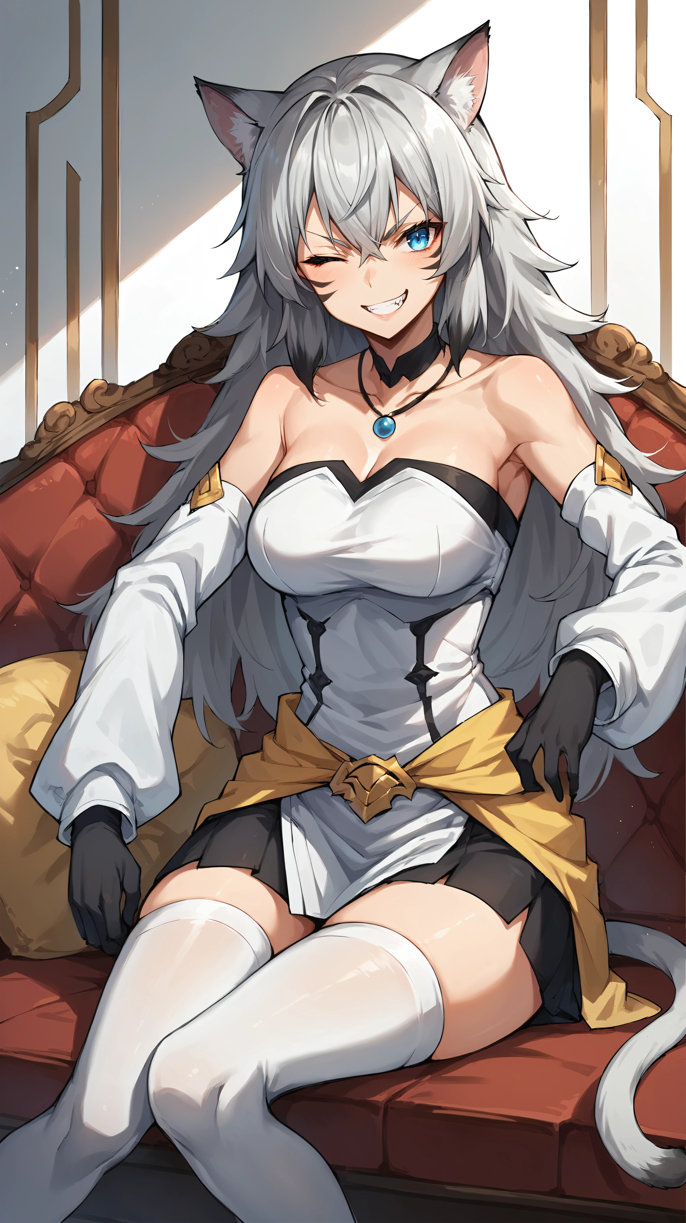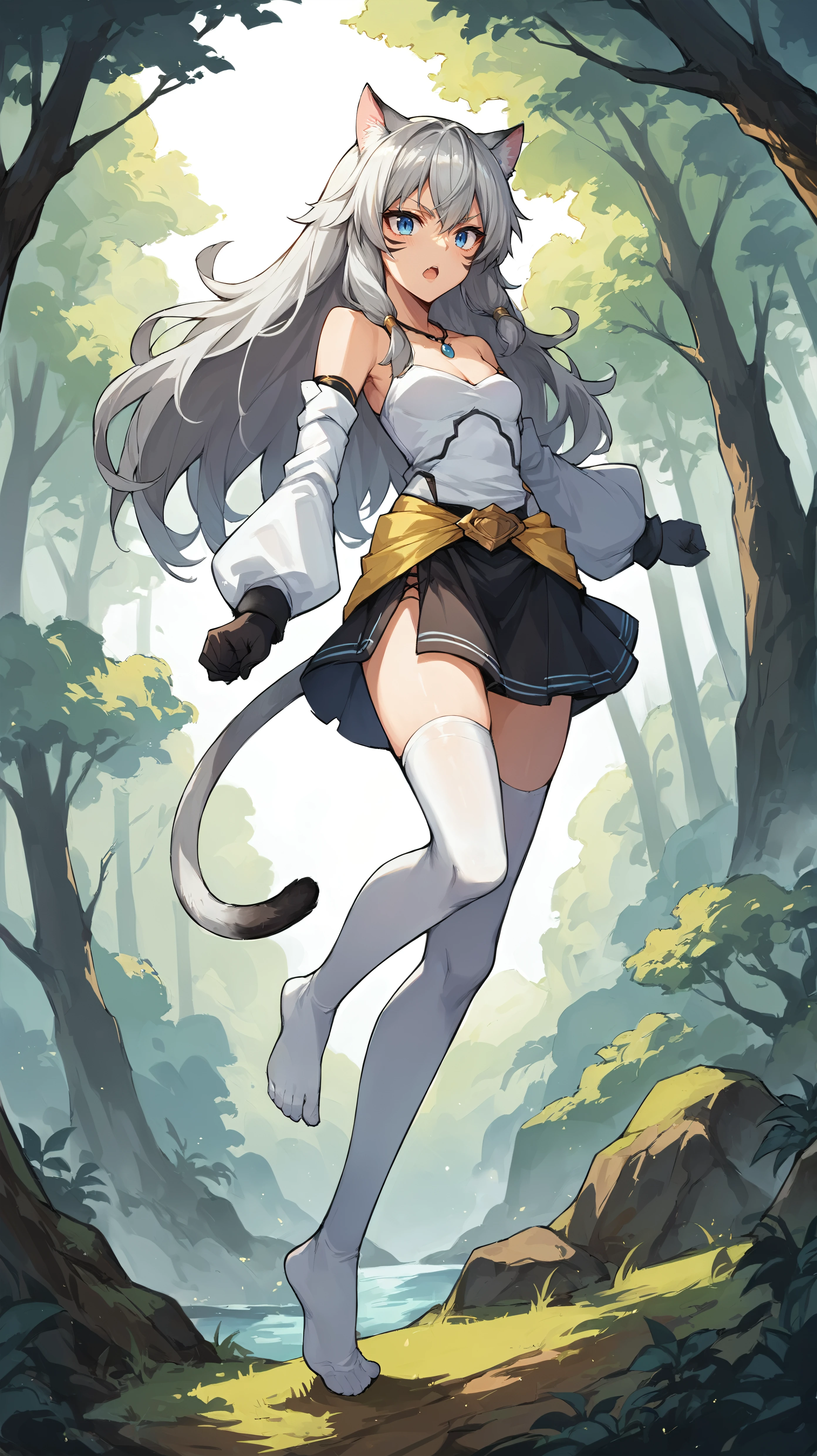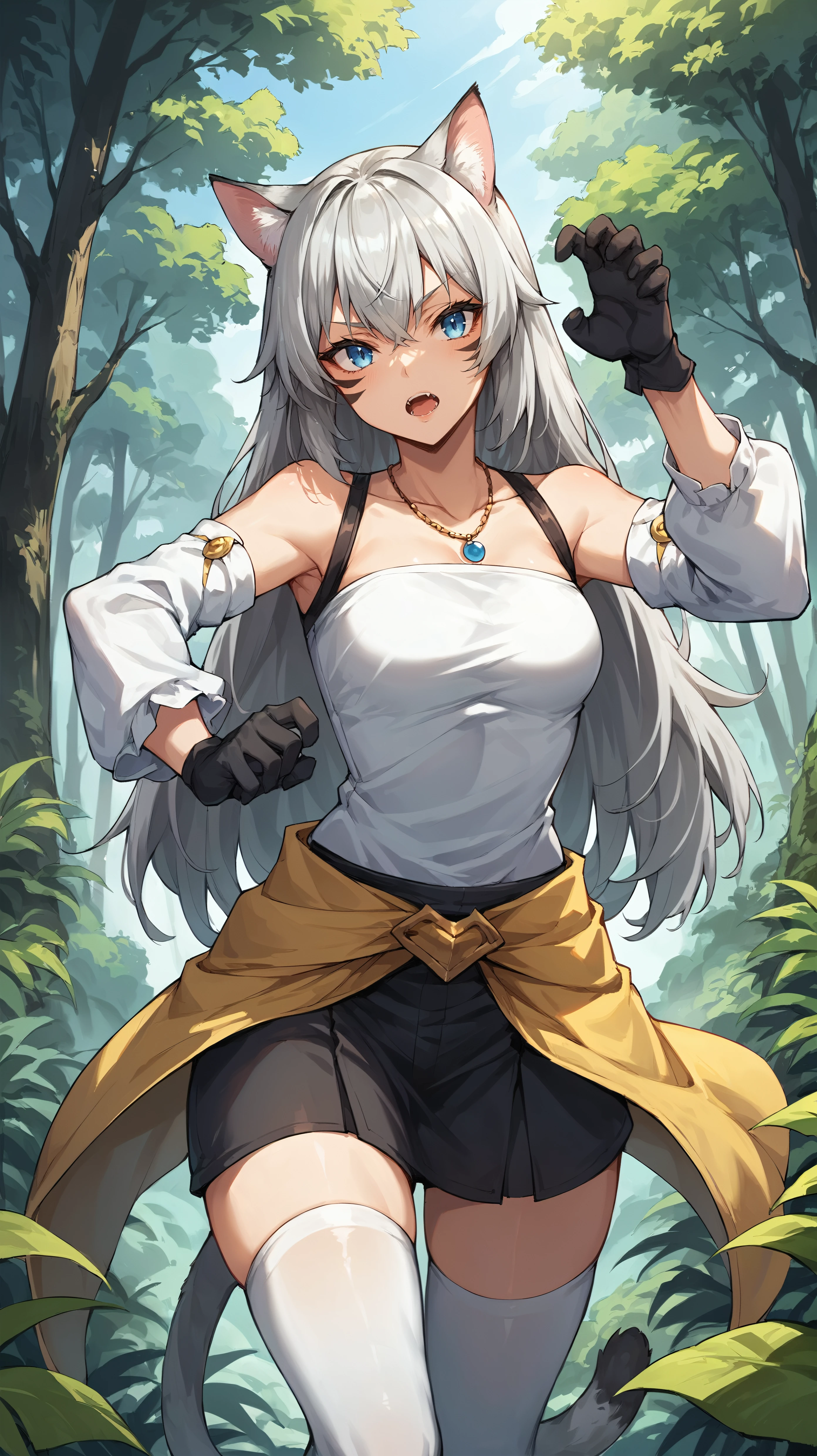 white shirt, long hair, gray hair, cat ears, blue eyes, necklace, yellow waist cape, detached sleeves, face markings, black miniskirt, (white thighhighs:1.3), cat tail, black glovesDescription