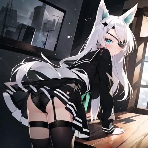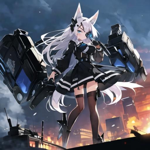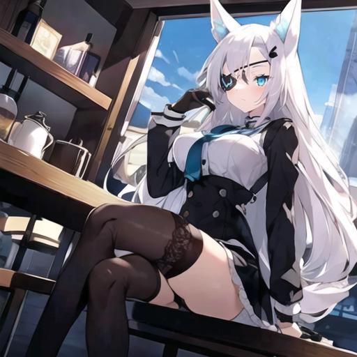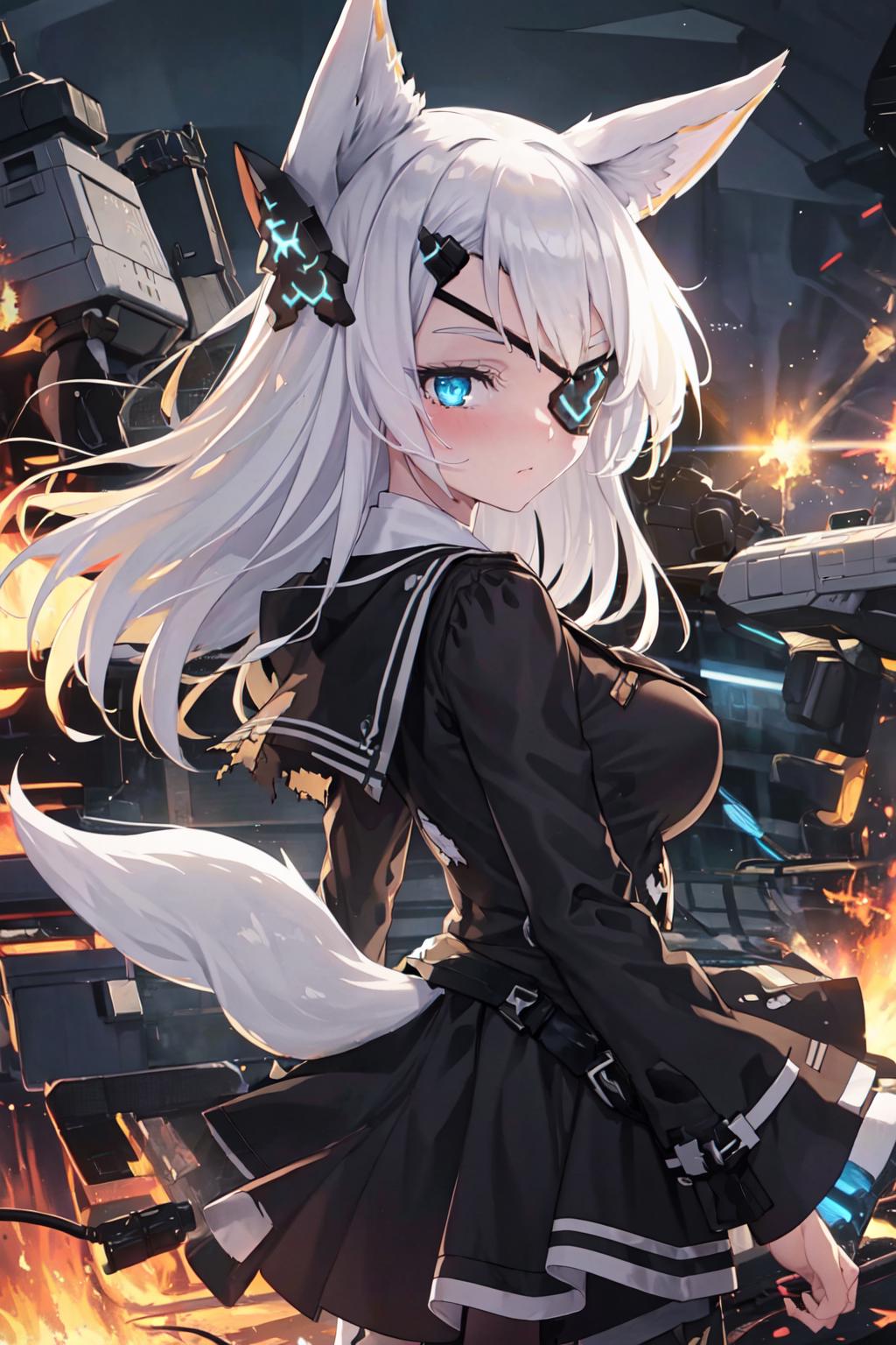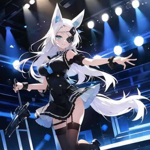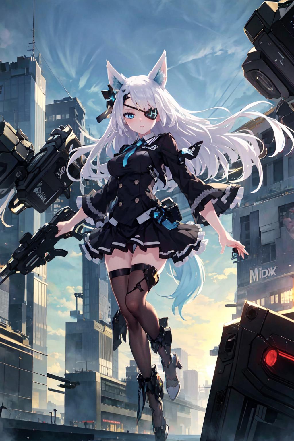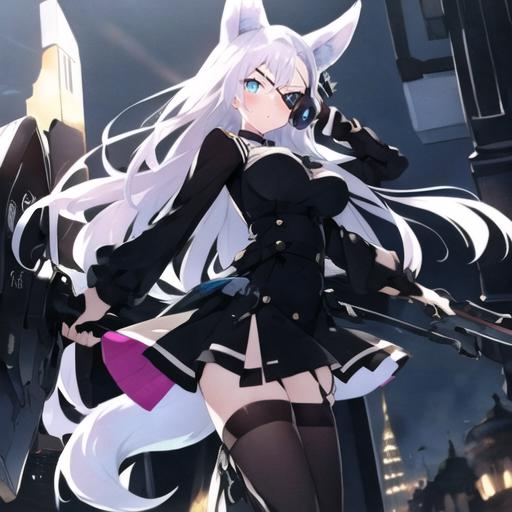 1. 1girl, solo, AG Sirius, eye patch, fox ears, fox tail, blue eyes, white hair, long hair, hair ornament, thigh highs, black skirt, medium breasts, weapon, panties,