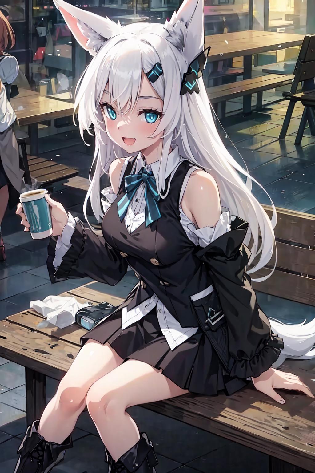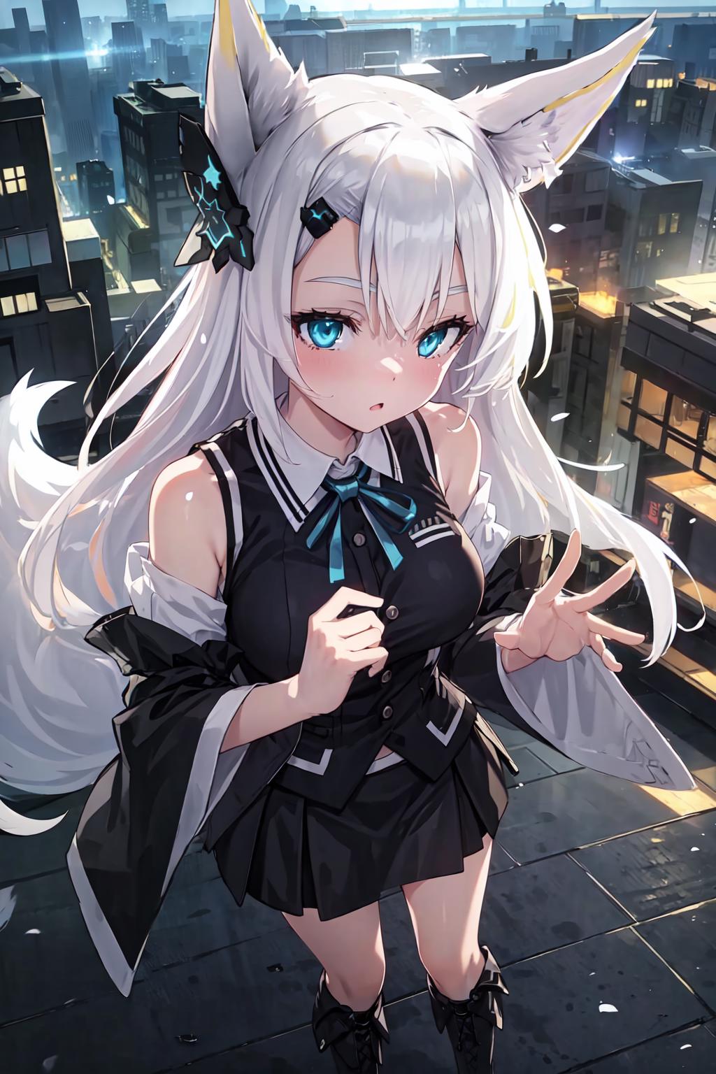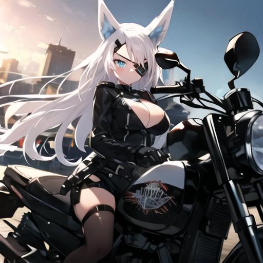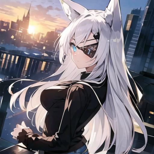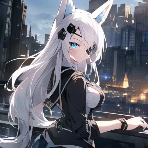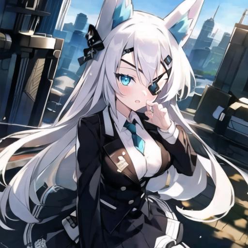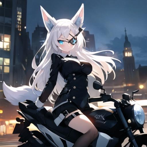 1. 1girl, solo, AG Sirius, eye patch, fox ears, fox tail, blue eyes, white hair, long hair, hair ornament, thigh highs, black skirt, medium breasts, weapon, panties,