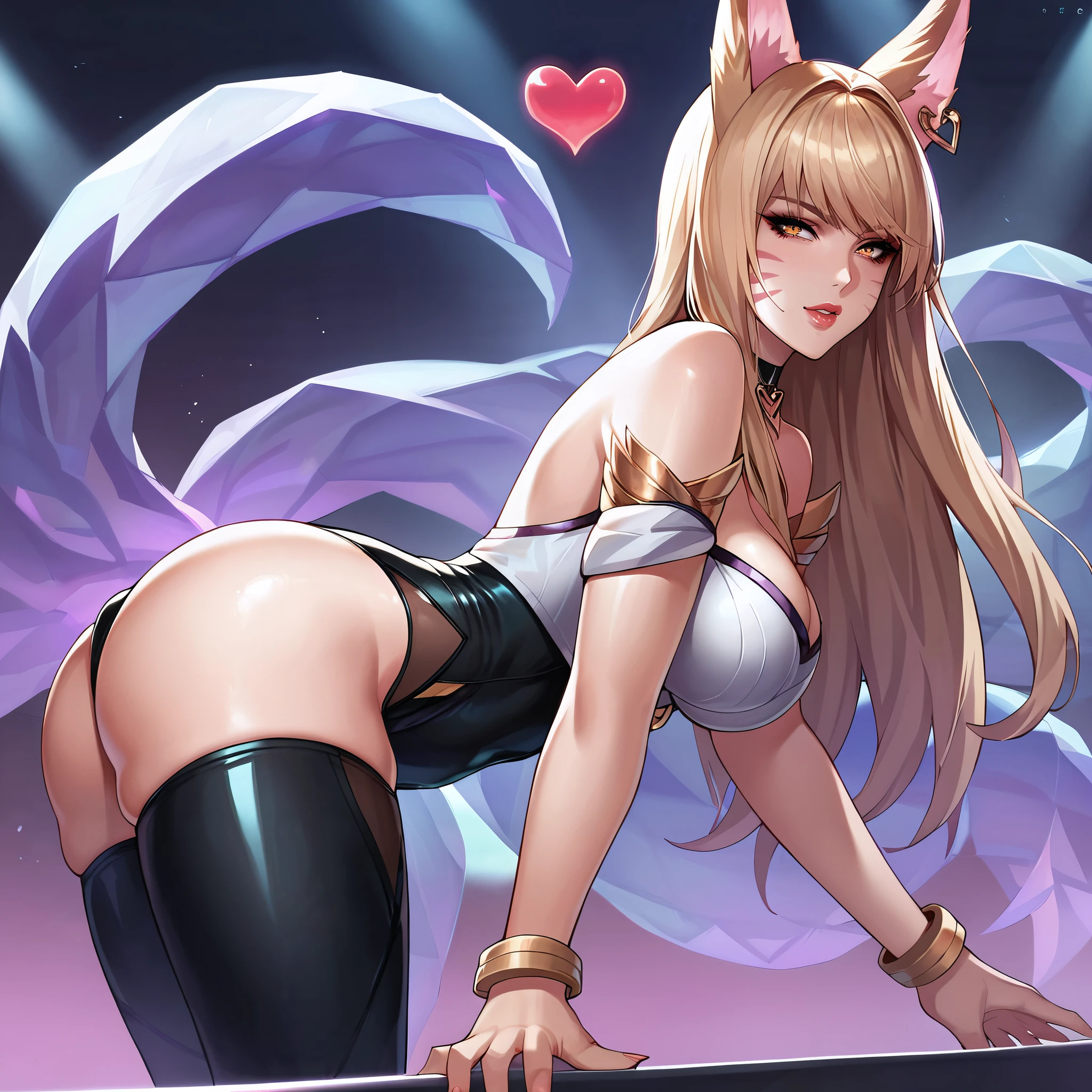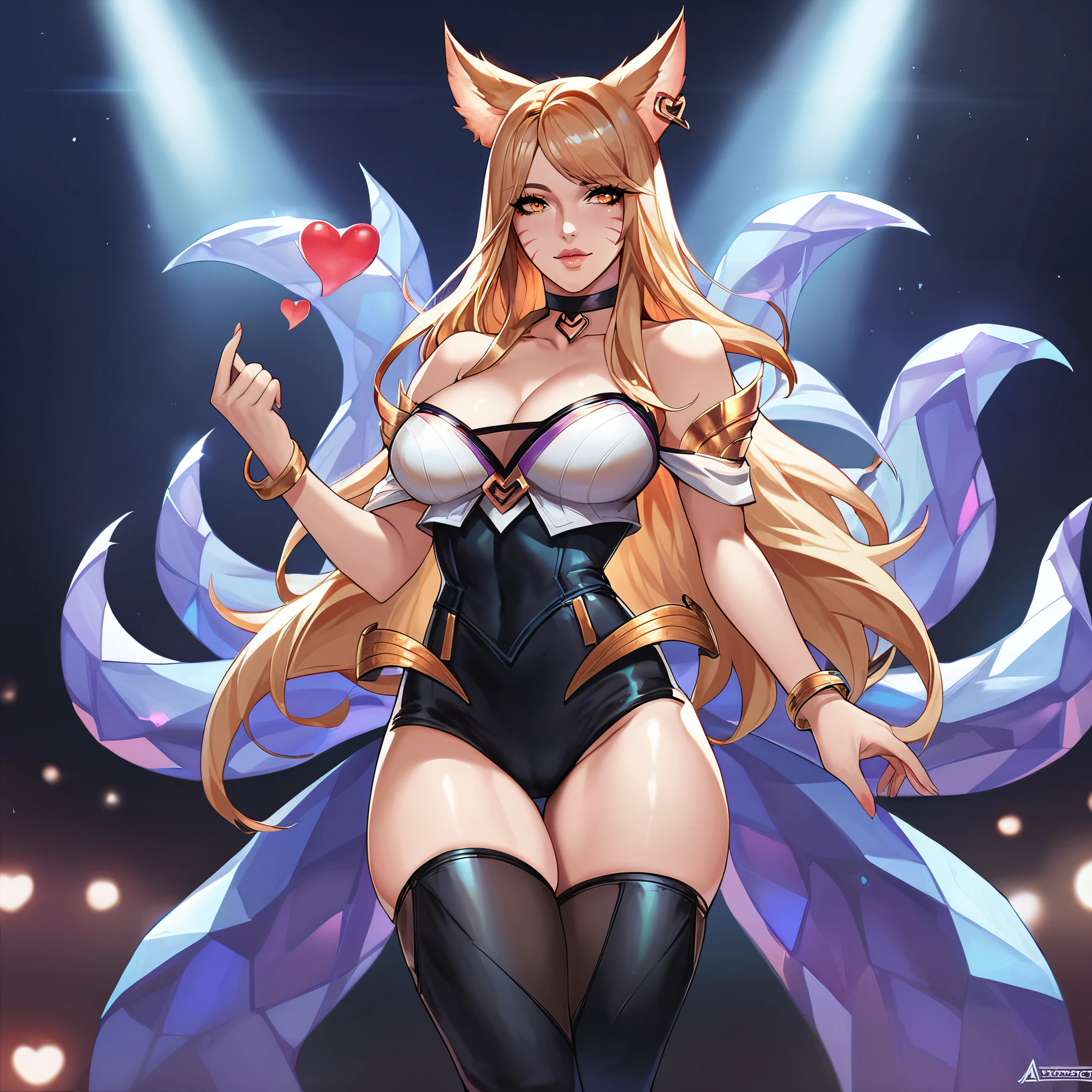 ahrikdaxl, fox ears, jewelry, whisker markings, heart choker, black thighhighs, bare shoulders, fox tail, multiple tails, bracelet, leotard, lips,