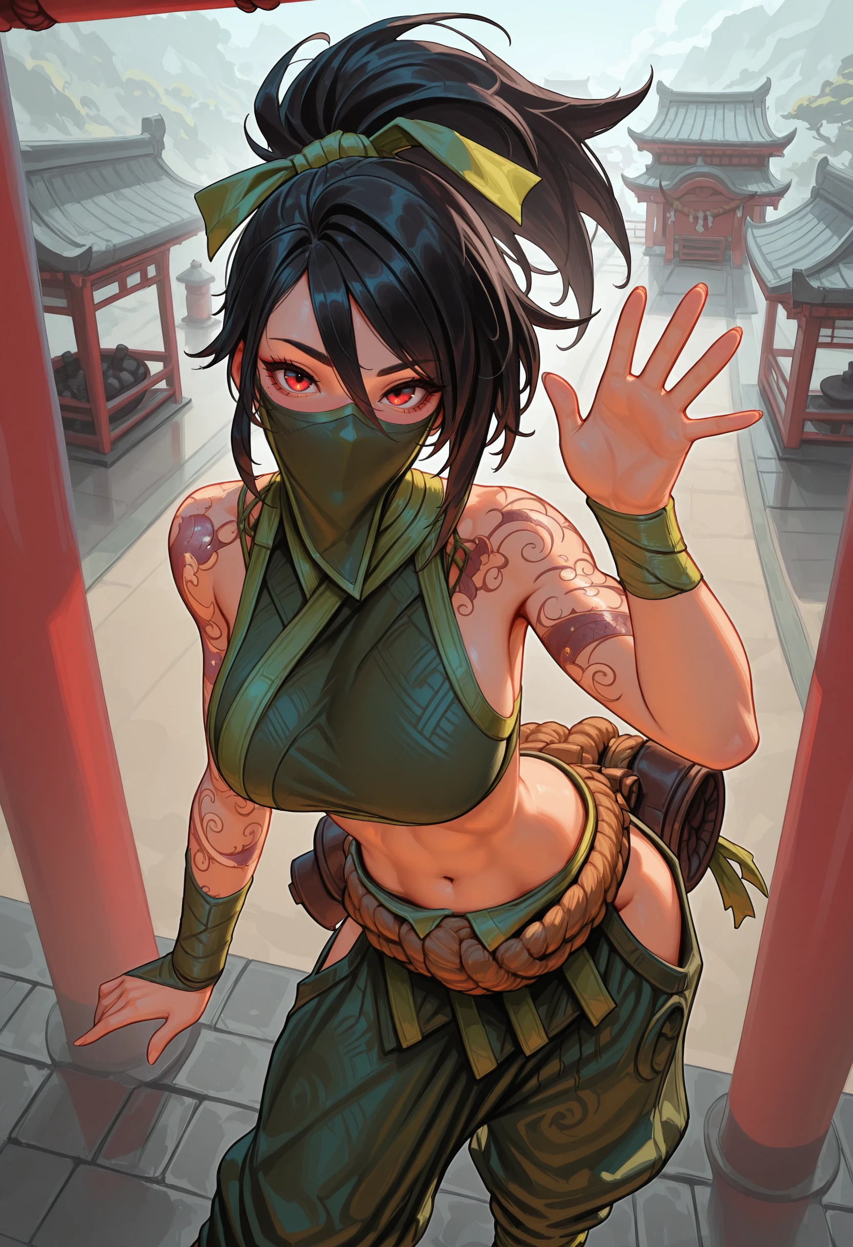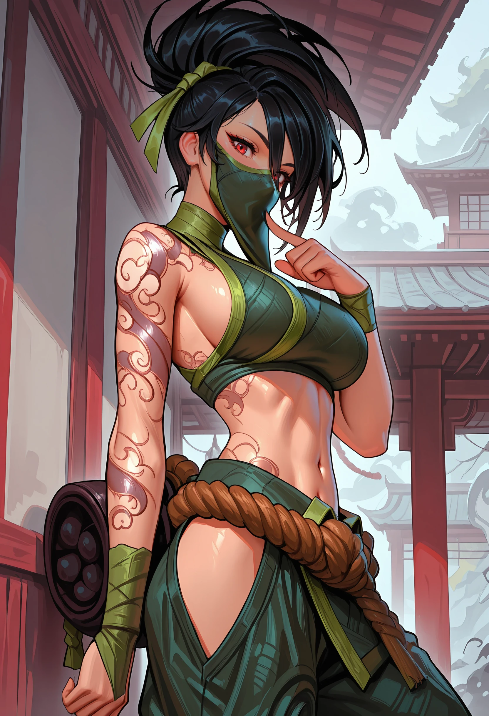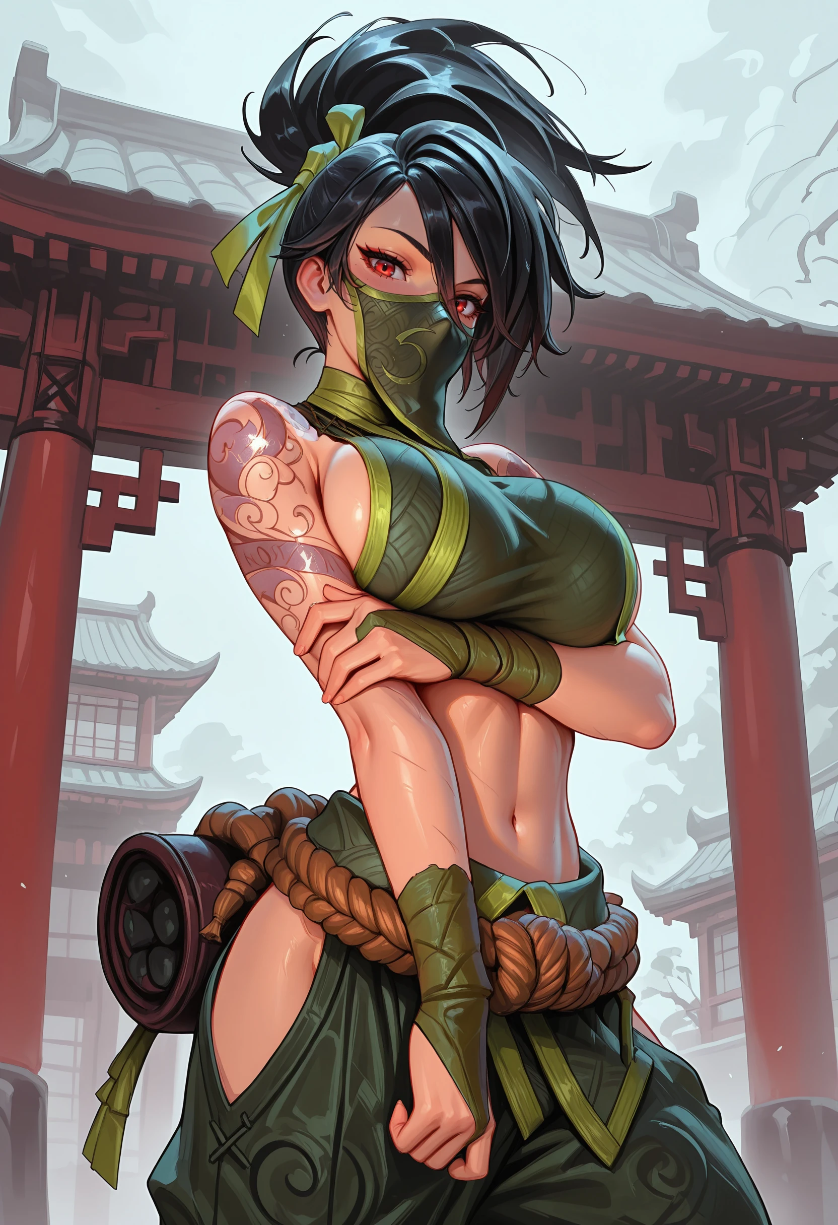 akaliil, long hair, high ponytail, black hair, red eyes, hair between eyes, hair ribbon, mouth mask, ninja, tattoo, ???? shoulders, arm tattoo, hip vent, green pants, baggy pants, green shirt, rope belt, shoulder tattoo, navel, ?????????????, sleeveless, midriff, crop top, wrist wrap, shimenawa, belt pouch,kunai, scythe, dual wielding, holding weapon, back tattoo,I use V12 WAI-NSFW-illustrious-SDXL checkpoint for my images.