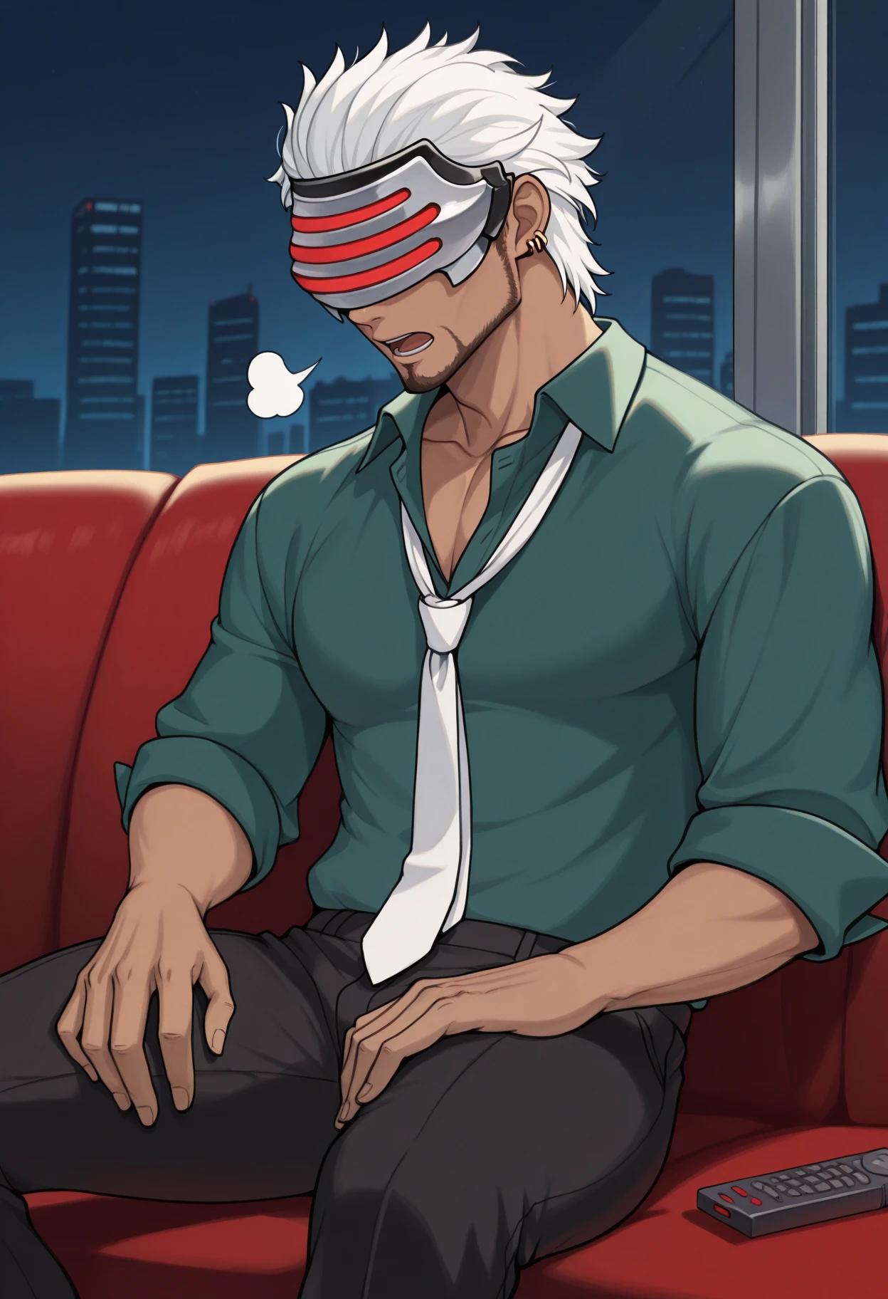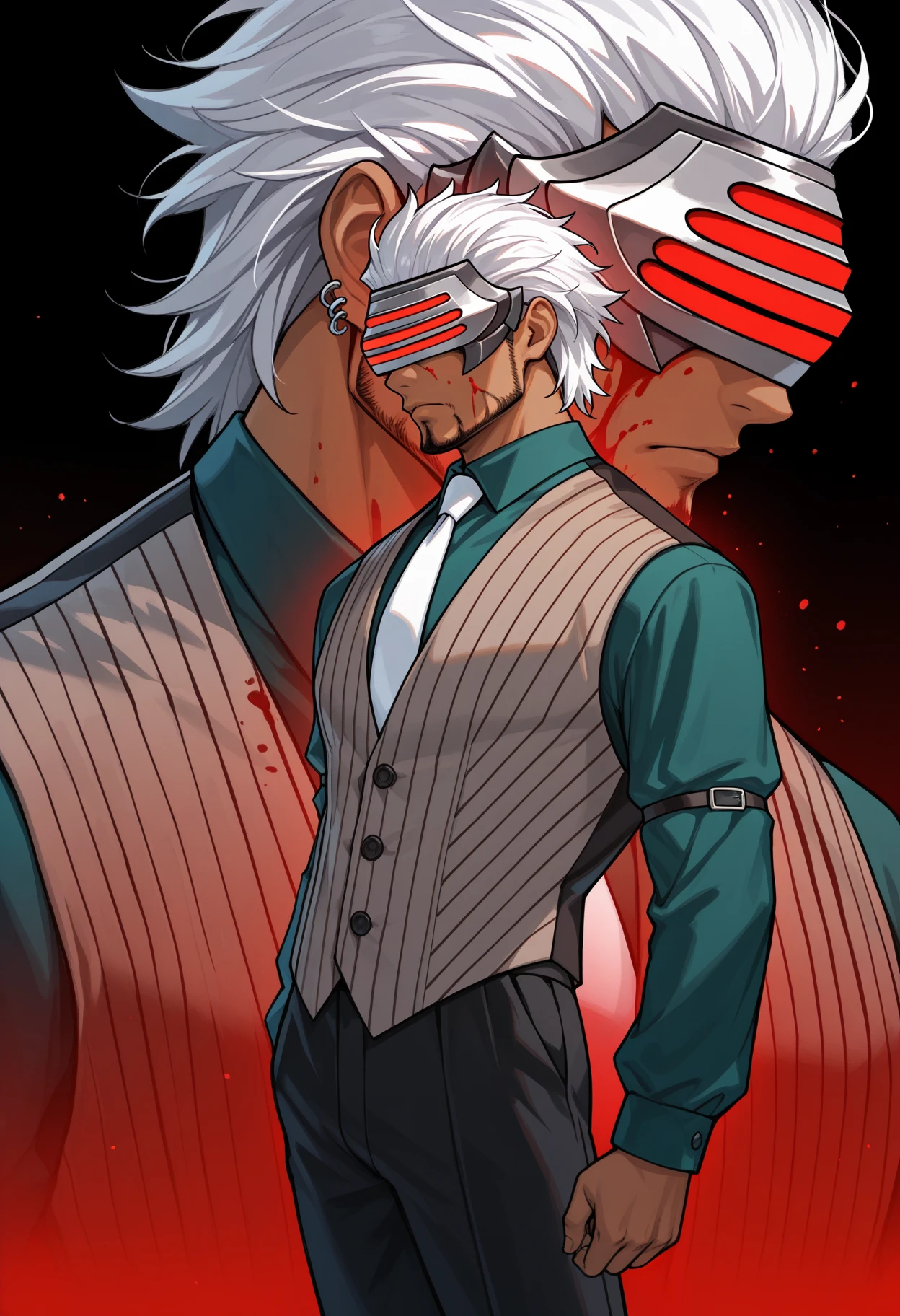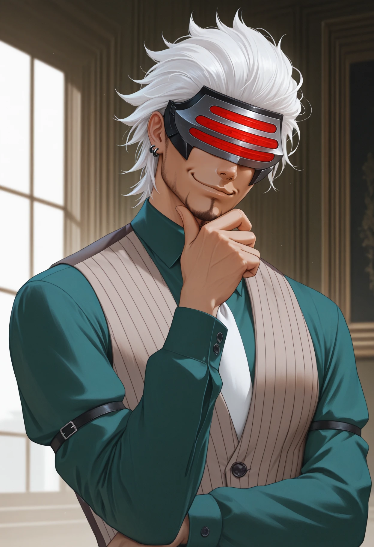 gdAA, white hair, short hair, mask, covered eyes, dark-skinned male, beard, single earring, collared shirt, green shirt, long sleeves, pinstripe vest, white necktie, sleeve garter, black pants
