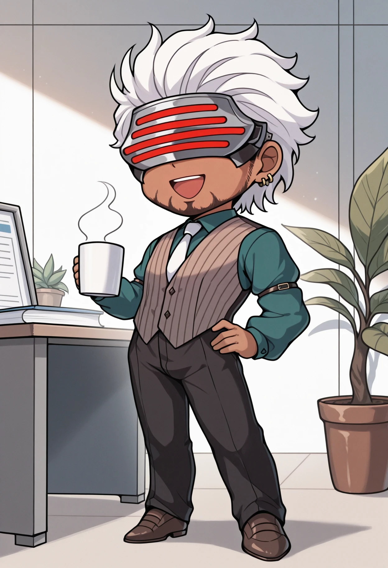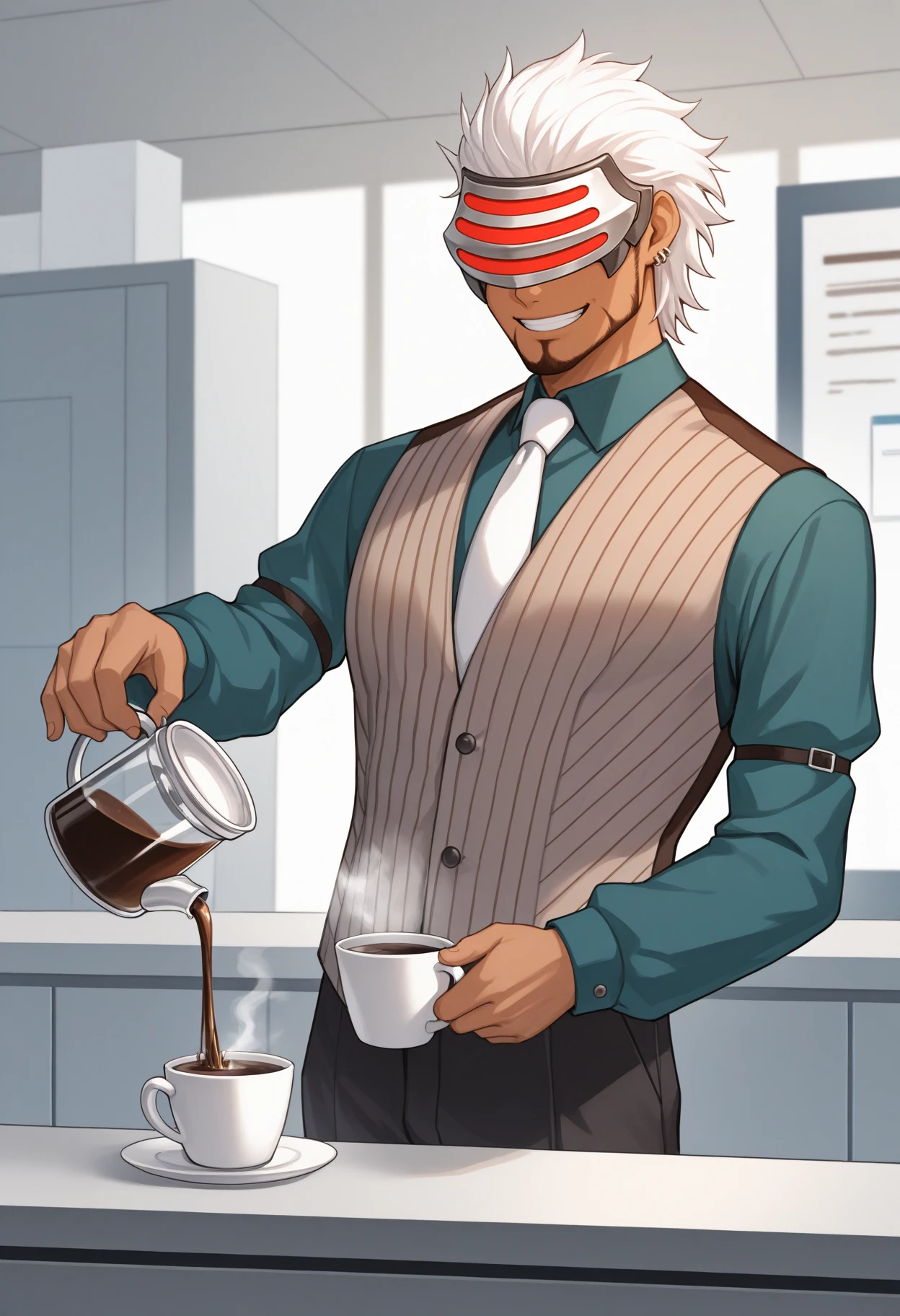 Default appearance: gdAA, white hair, short hair, mask, covered eyes, dark-skinned male, beard, single earring, collared shirt, green shirt, long sleeves, pinstripe vest, white necktie, sleeve garter, black pants