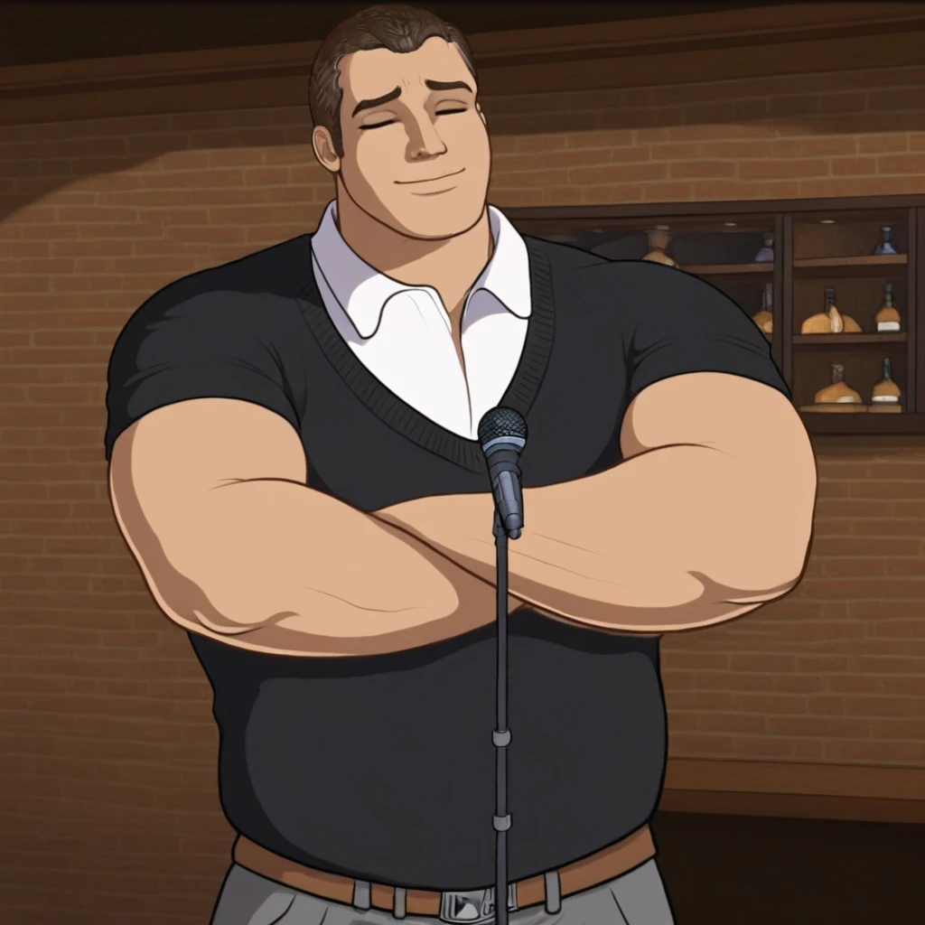 Amos, 1boy, hairy, smile, male focus, solo, stocky, blue eyes, burly male, grey pants, black shirt, brown hair, pectorals, short hair, bara