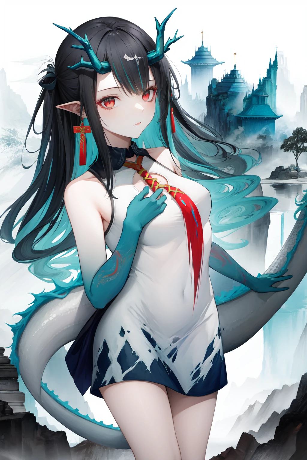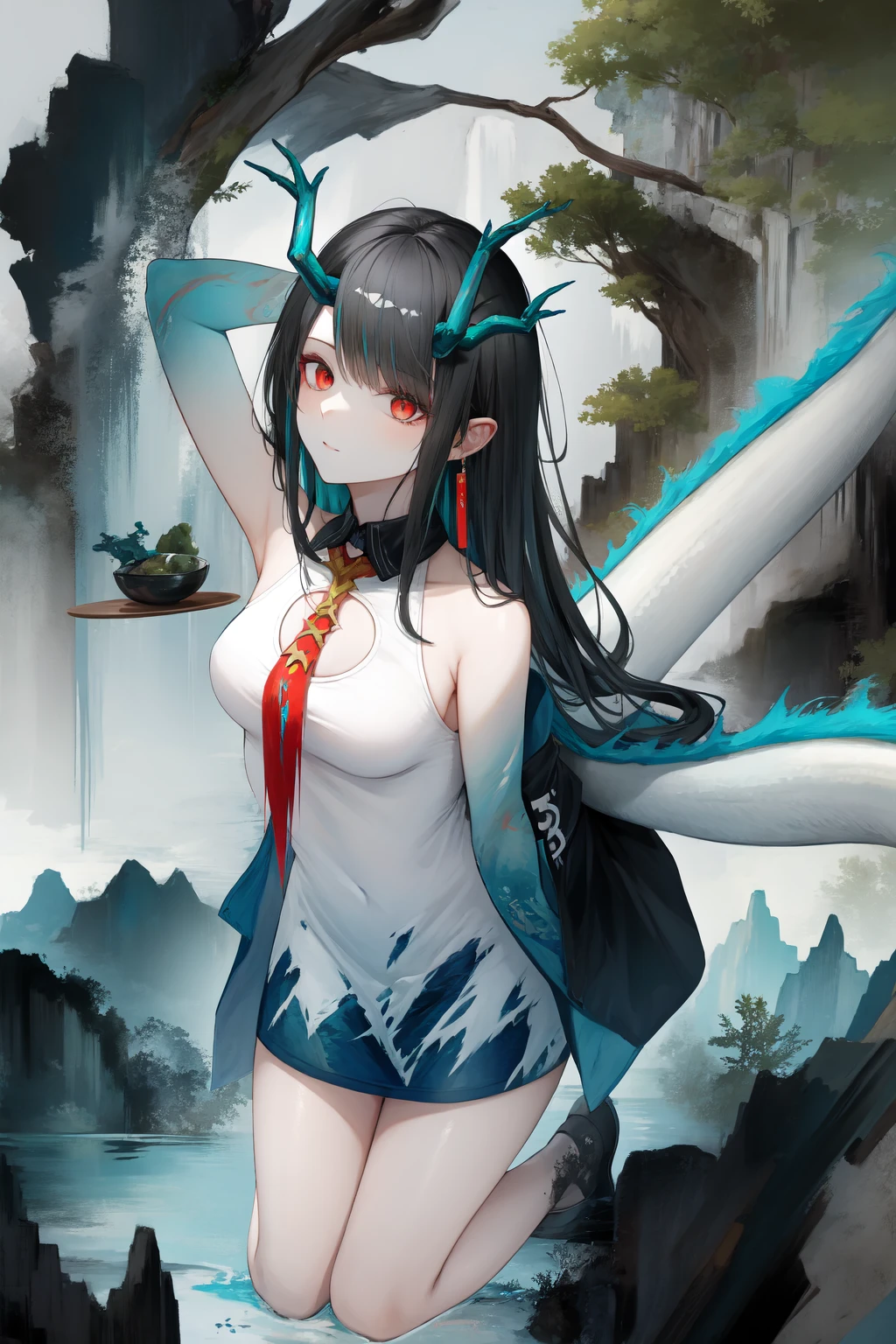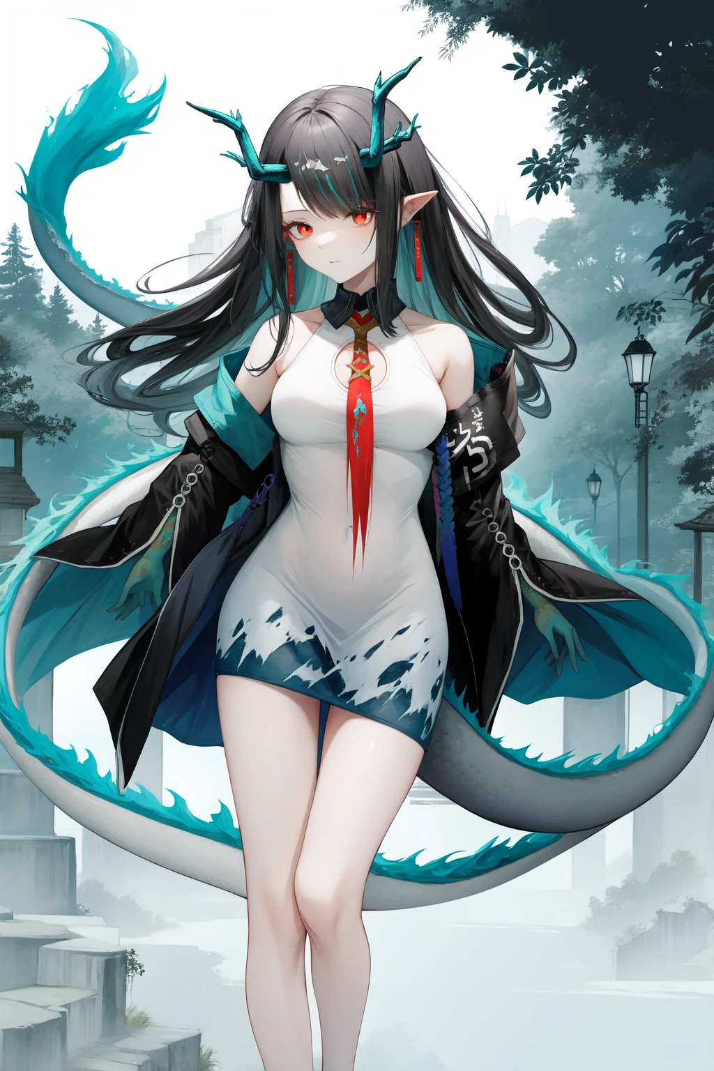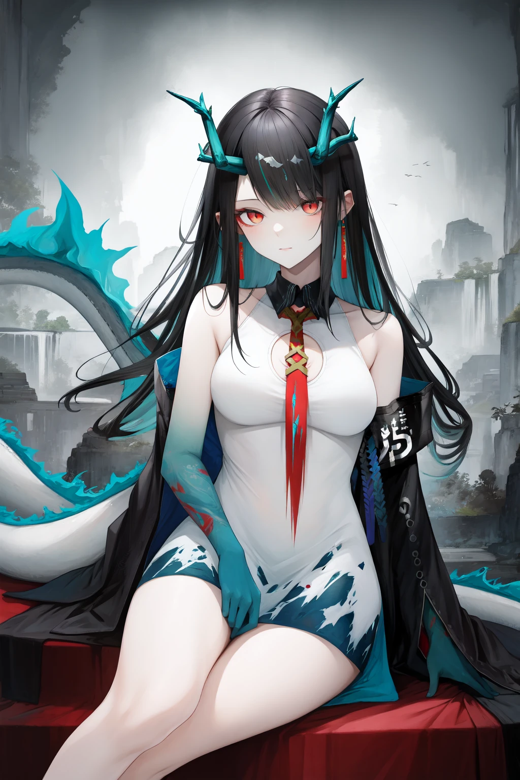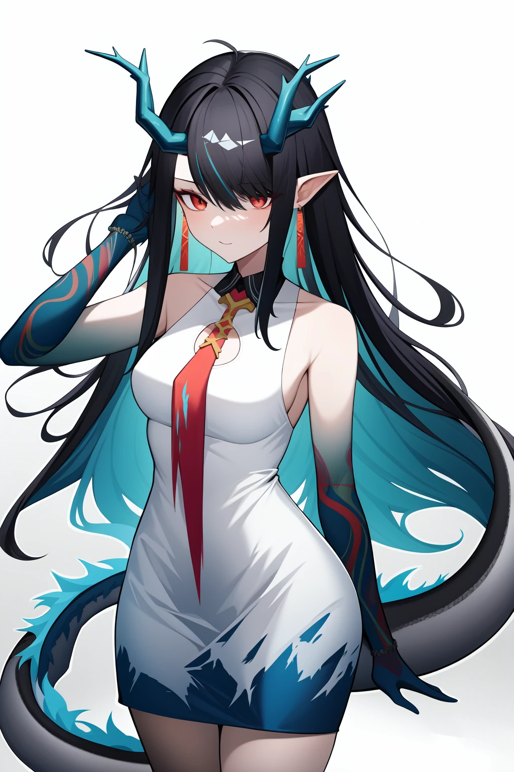 dusk \\\(arknights\\\),horns,dusk \(arknights\),long hair,black hair,dragon horns,multicolored hair,red eyes,dress,colored skin,earrings,dragon girl,tail,sleeveless,dragon tail,red necktie,white dress,colored skin,