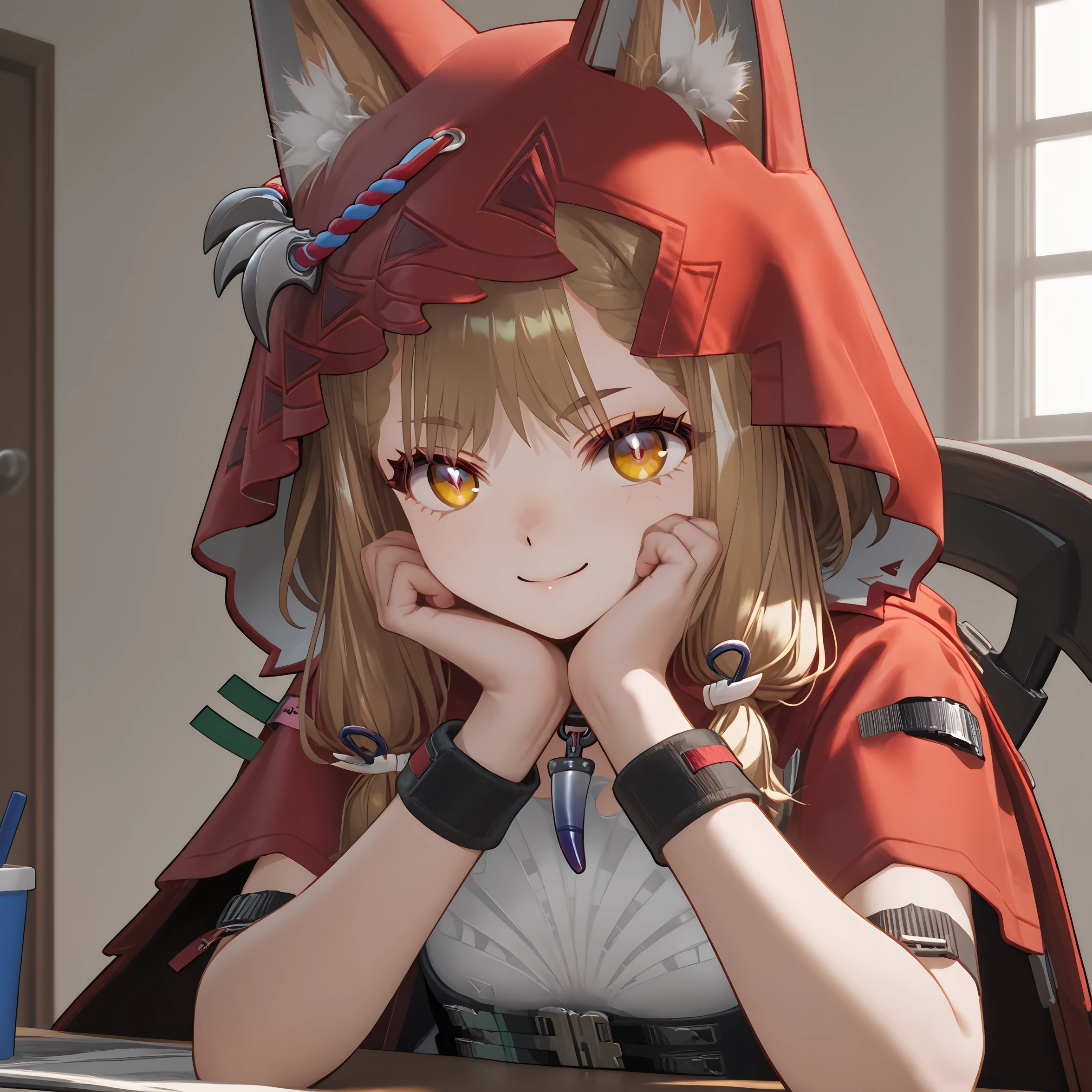 masterpiece, best quality, very aesthetic, newest, hires, Rossi, 1girl, solo, smile, blush, looking at viewer, closed mouth, upper body, black gloves, simple background,For full-body shots, you can try adding full body or boots.