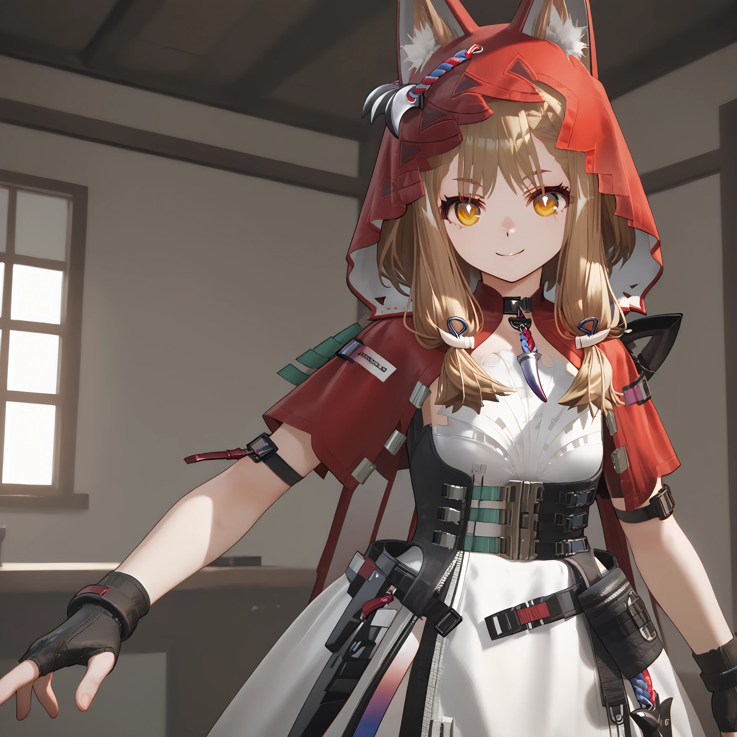 masterpiece, best quality, very aesthetic, newest, hires, Rossi, 1girl, solo, smile, blush, looking at viewer, closed mouth, upper body, black gloves, simple background,全身可尝试添加full body, boots 等。