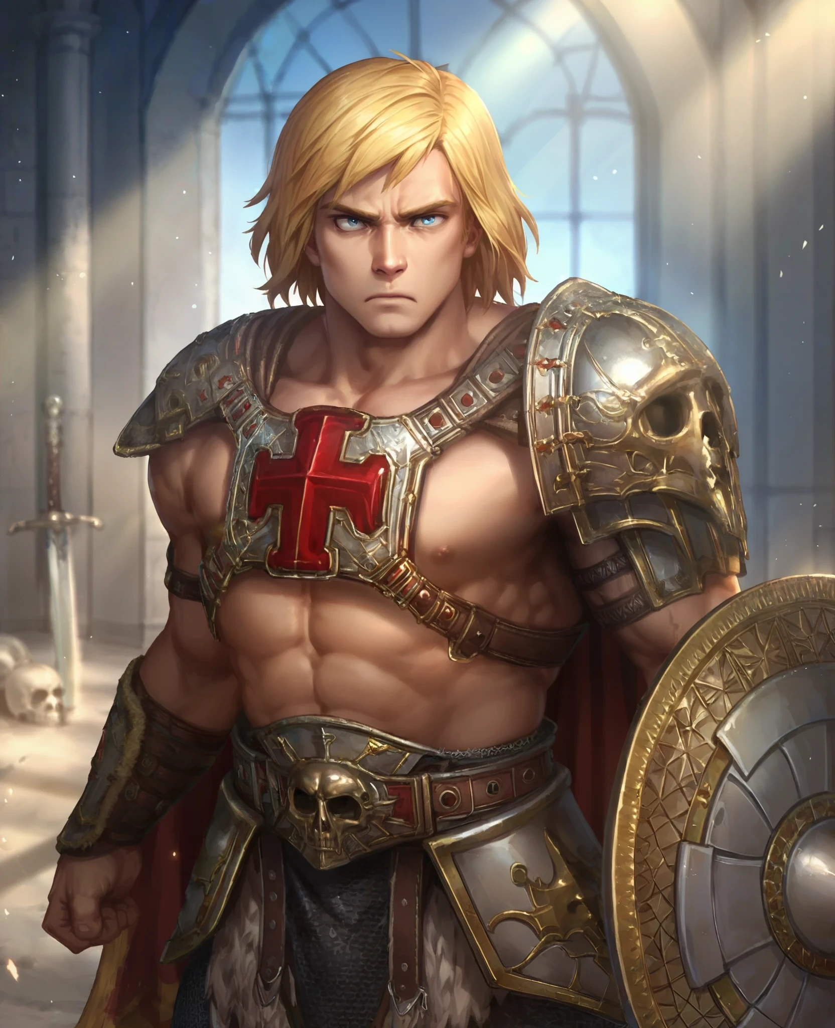 He-ManRSL, 1boy, medium hair, blonde hair, blue eyes, muscular, manly