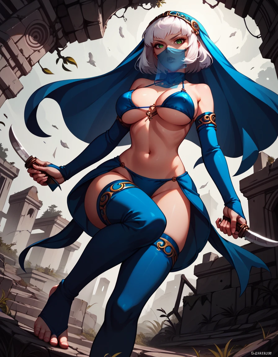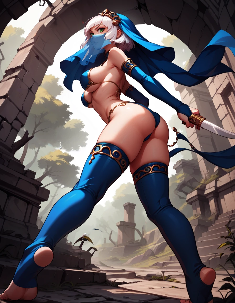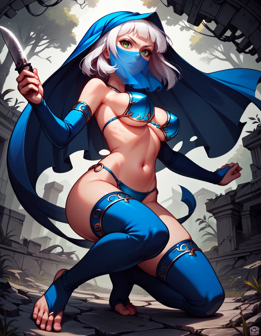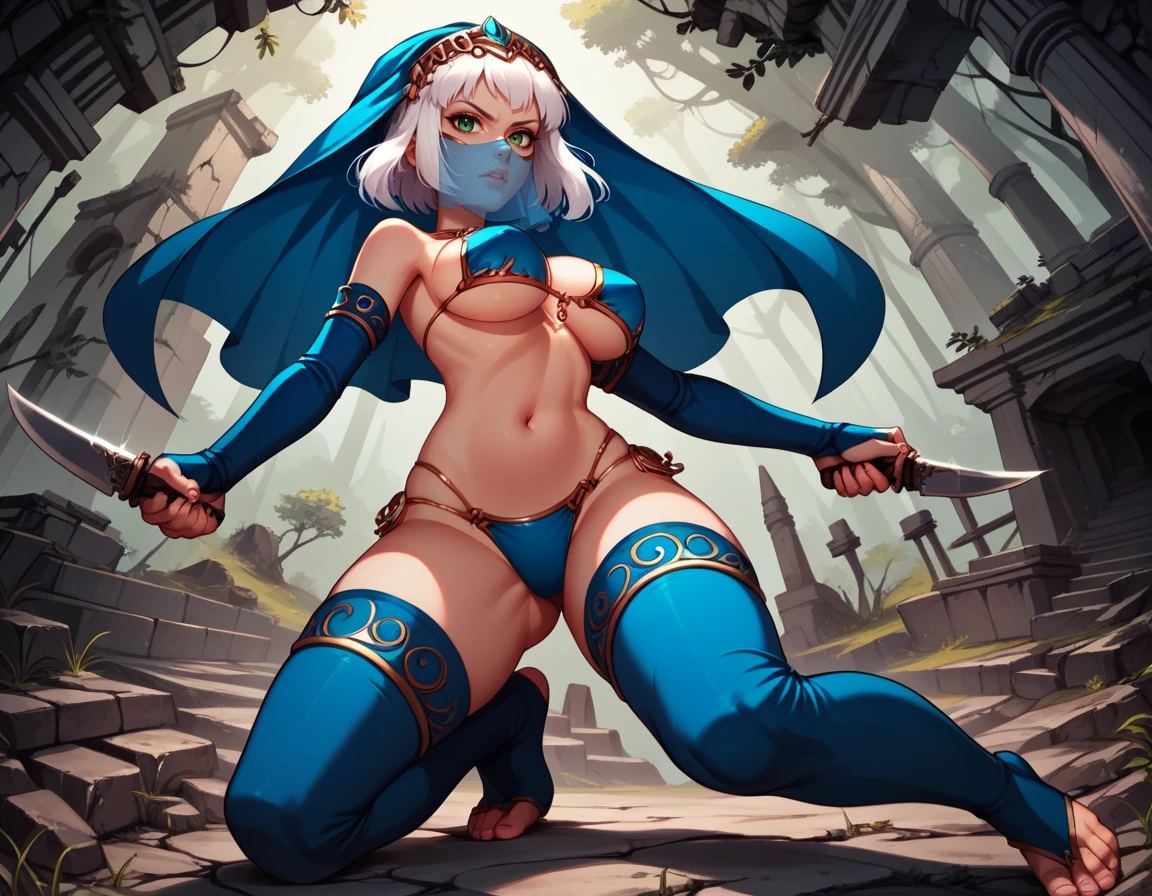 veil, mouth mask, toeless legwear, bridal gauntlets, detached blue thighhighs, bikini armor,
