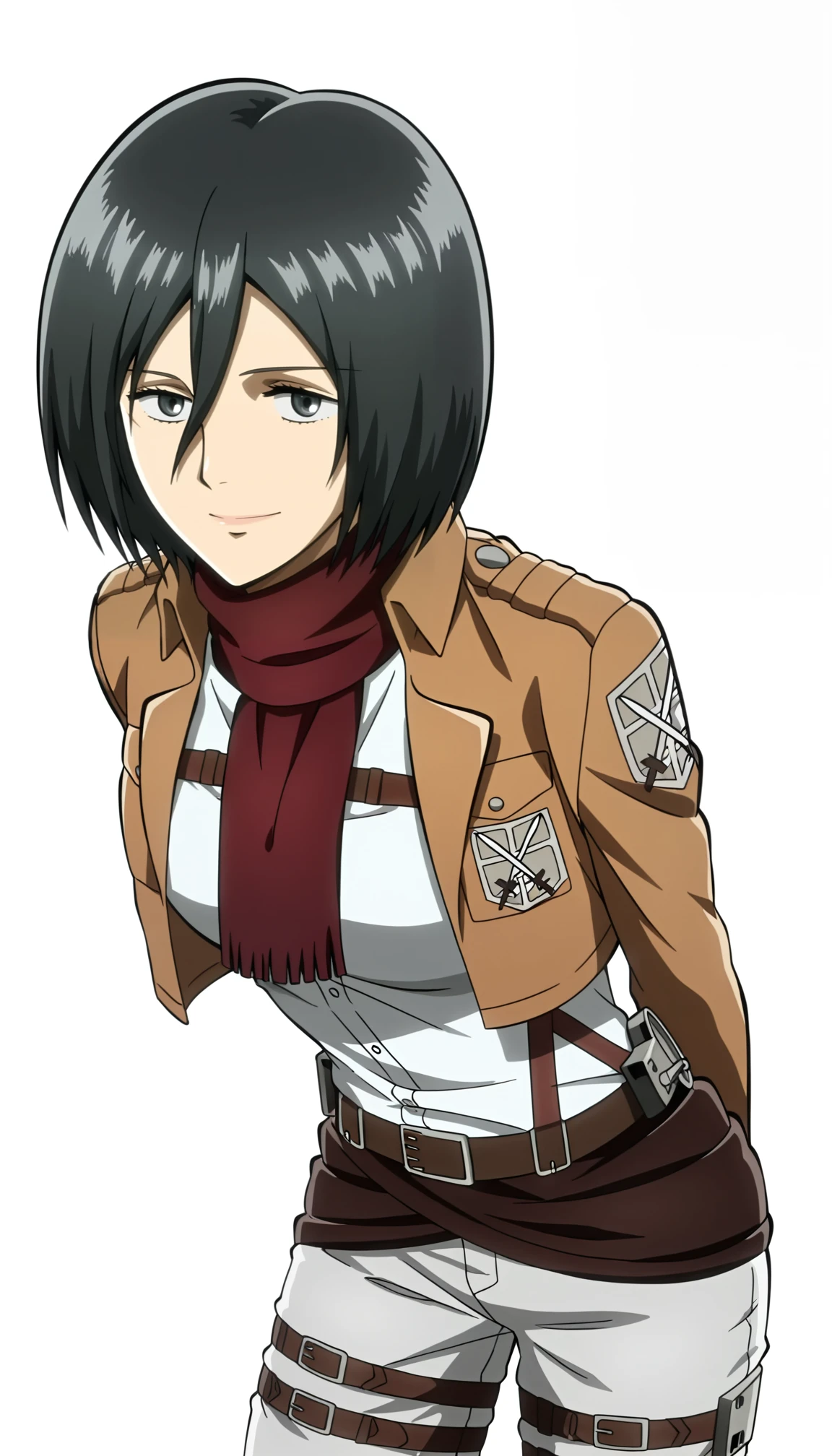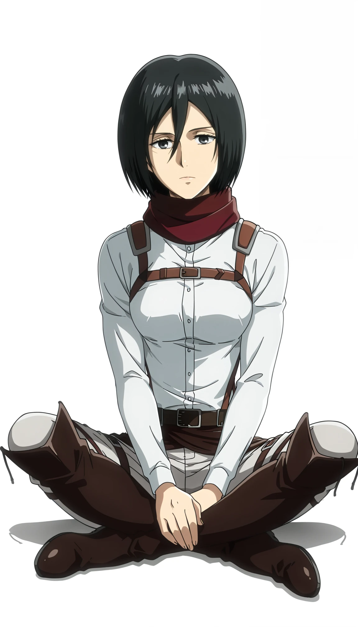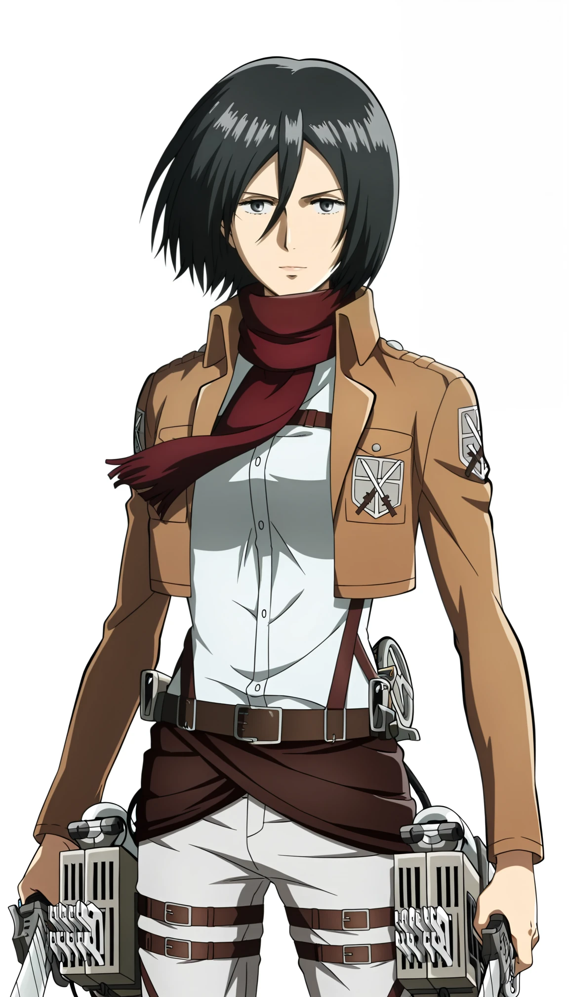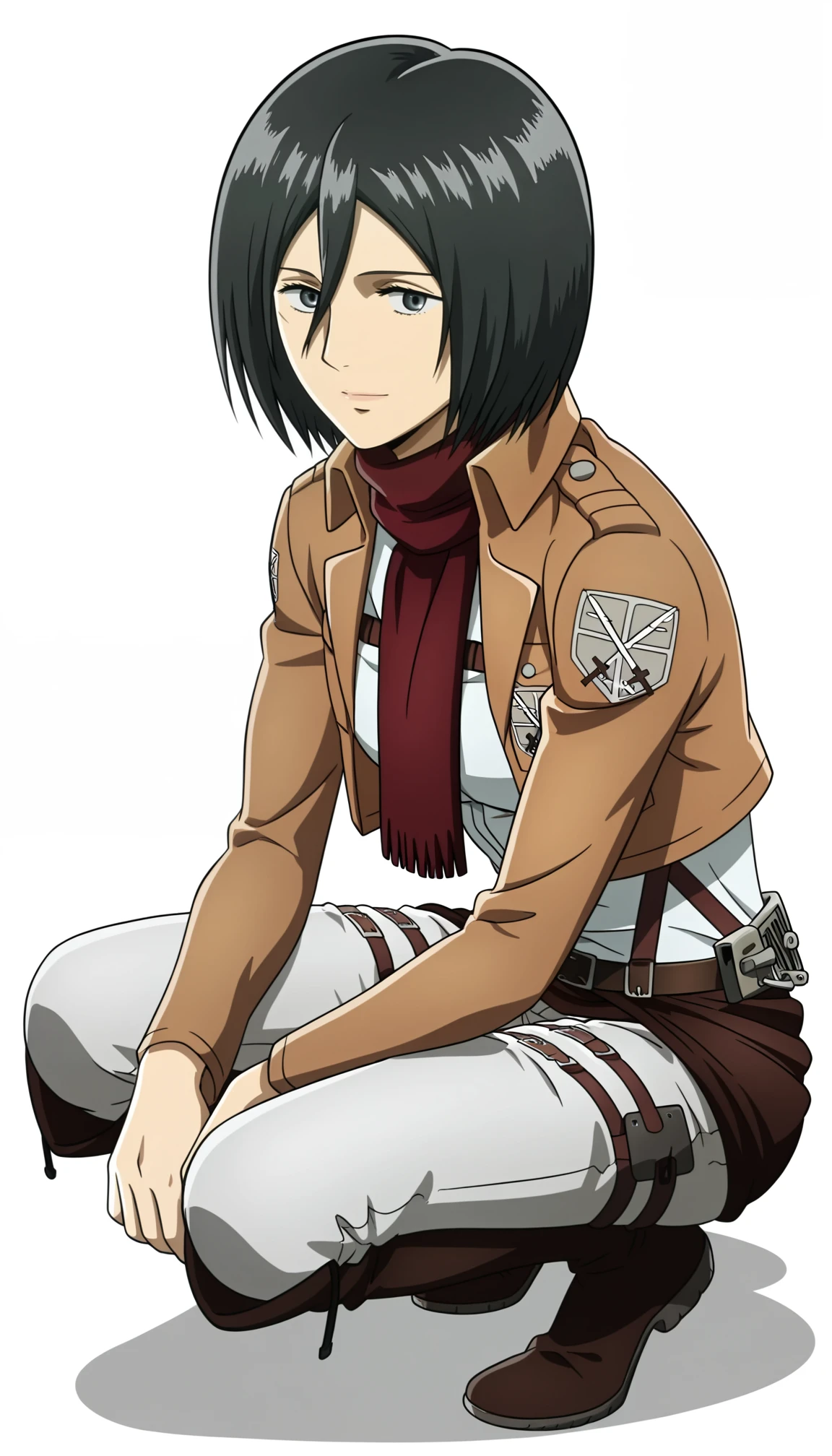 mikasa ackerman, 1girl, short hair, hair between eyes, black hair, scarf, paradis military uniform, jacket, open jacket, shirt, training corps (emblem), belt, pants, thigh strap, black footwear, knee boots
