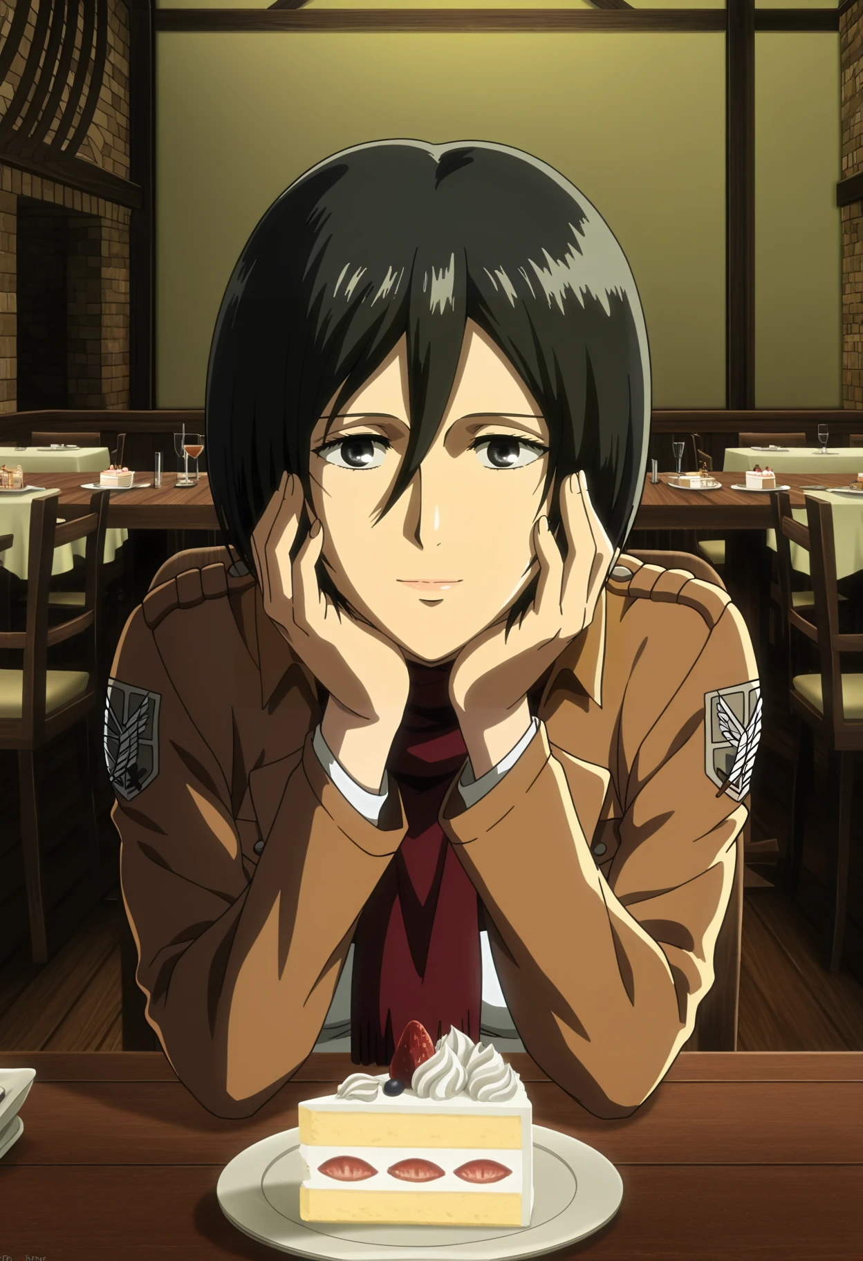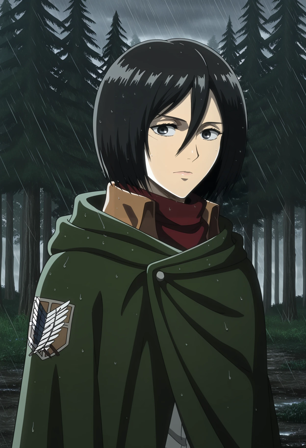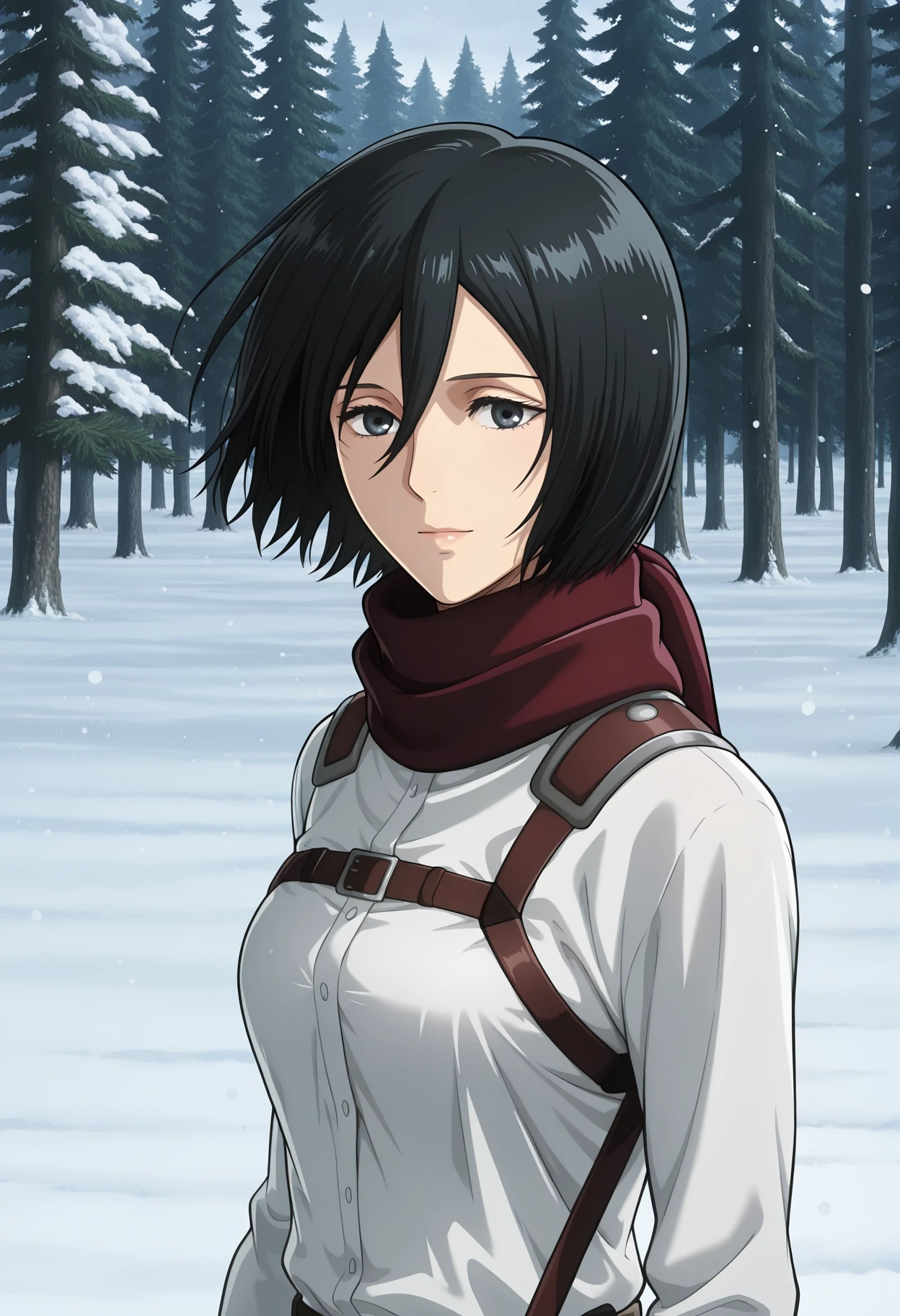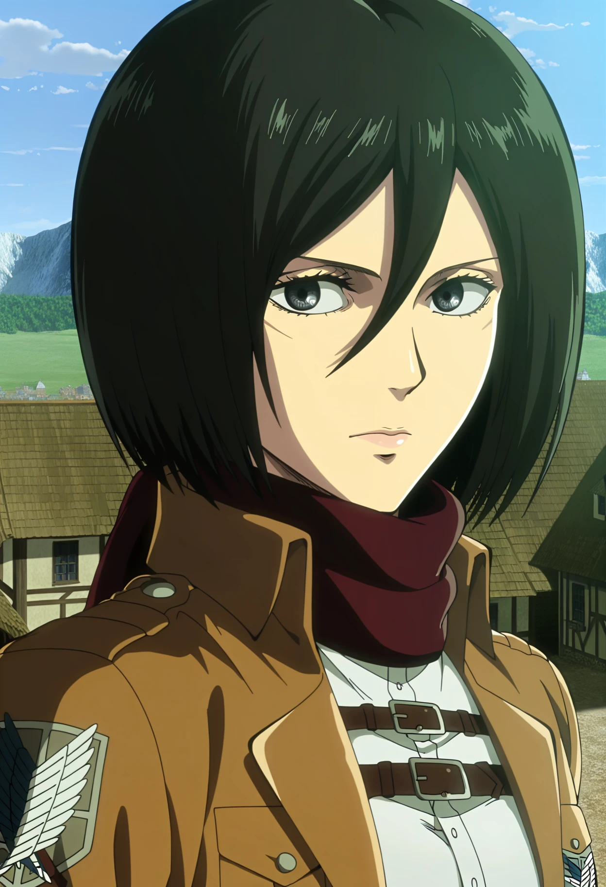 mikasa ackerman, 1girl, short hair, hair between eyes, black hair, scarf, paradis military uniform, jacket, open jacket, shirt, training corps (emblem), belt, pants, thigh strap, black footwear, knee boots