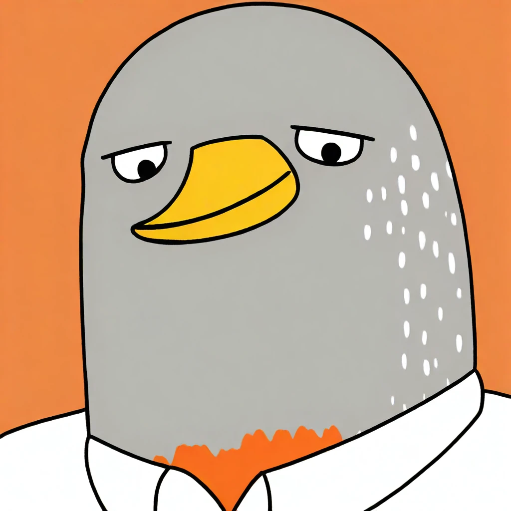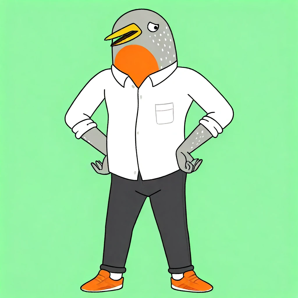 SpeckleTB, furry, avian, two-tone fur, yellow beak, white shirt, black pants, orange shoes
