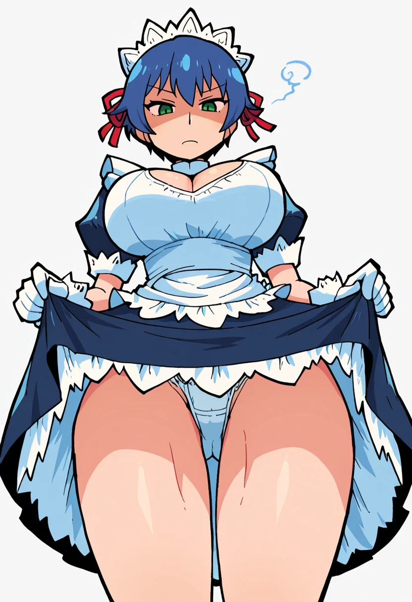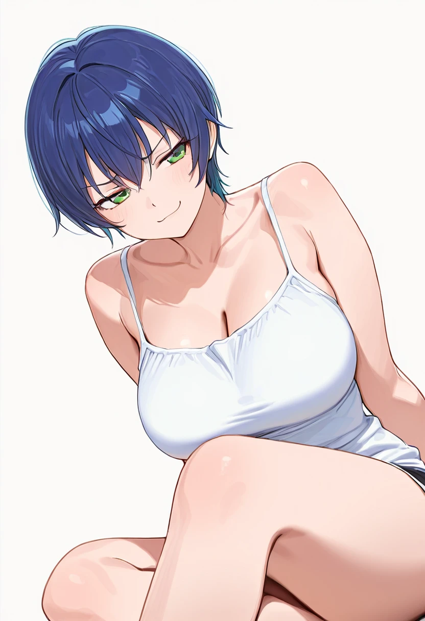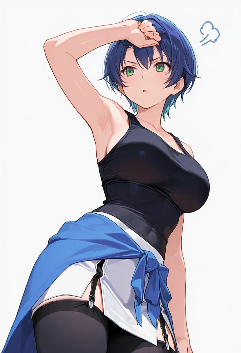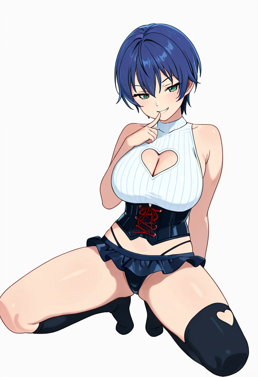 sachie_cnr, 1girl, blue hair, short hair,green eyes, large breasts,👗Default Outfit