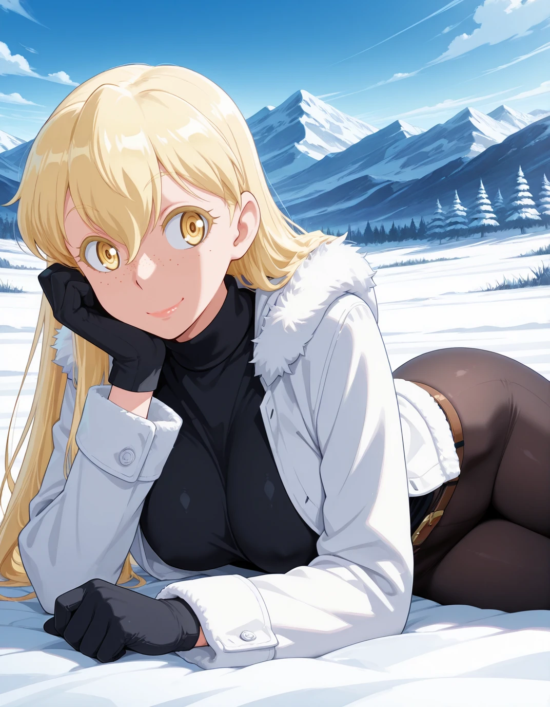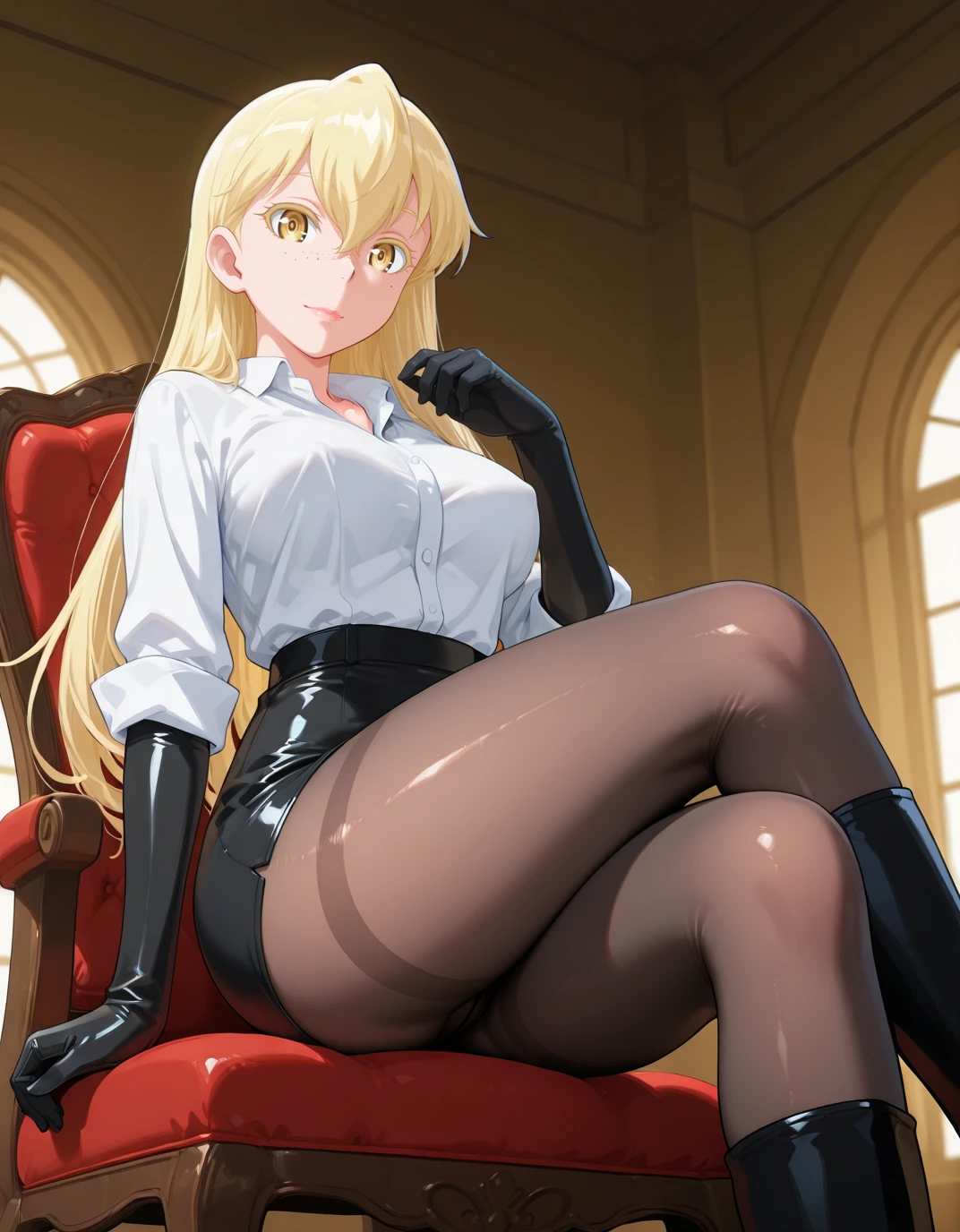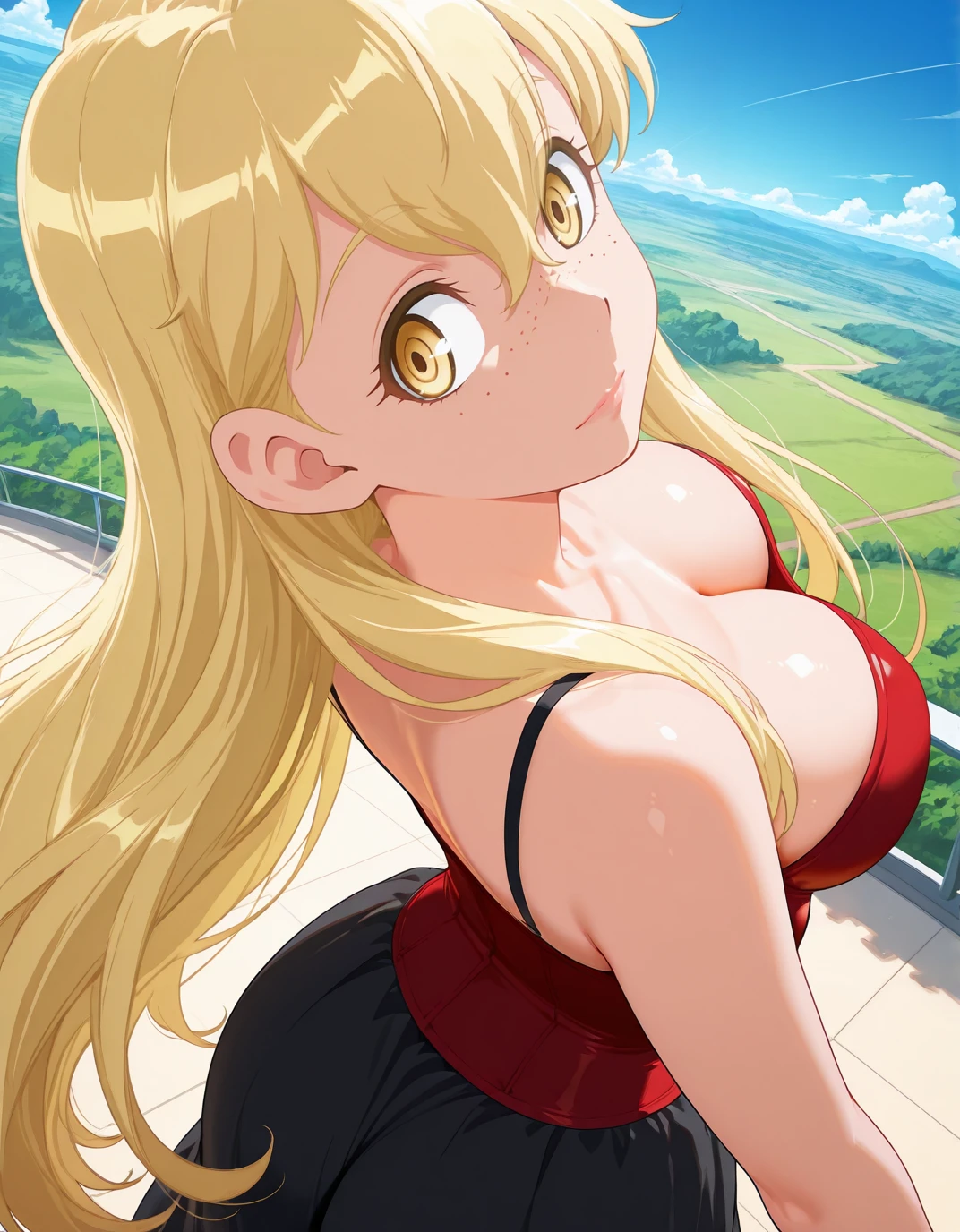 Basic trigger words: ( freckles:1.2), blonde hair, long hair, hair between eyes, dark yellow eyes, thin lips, large natural breasts