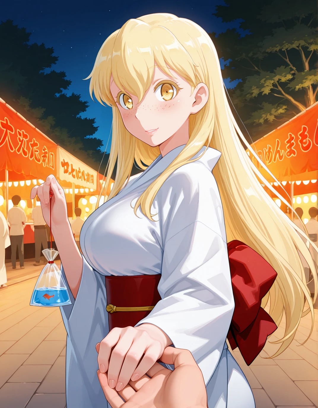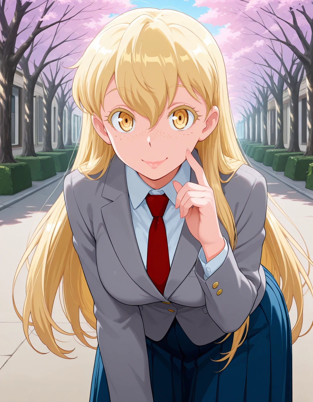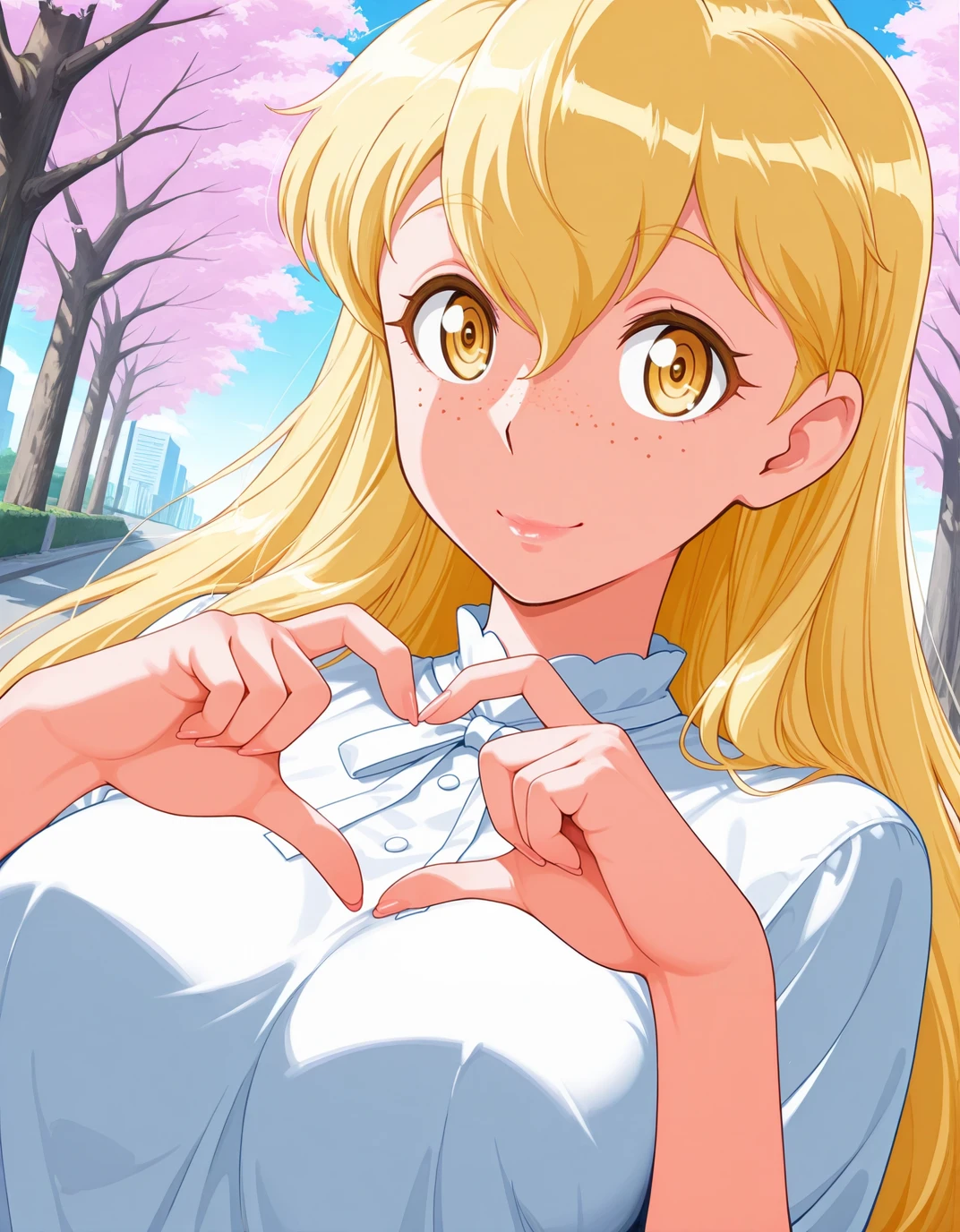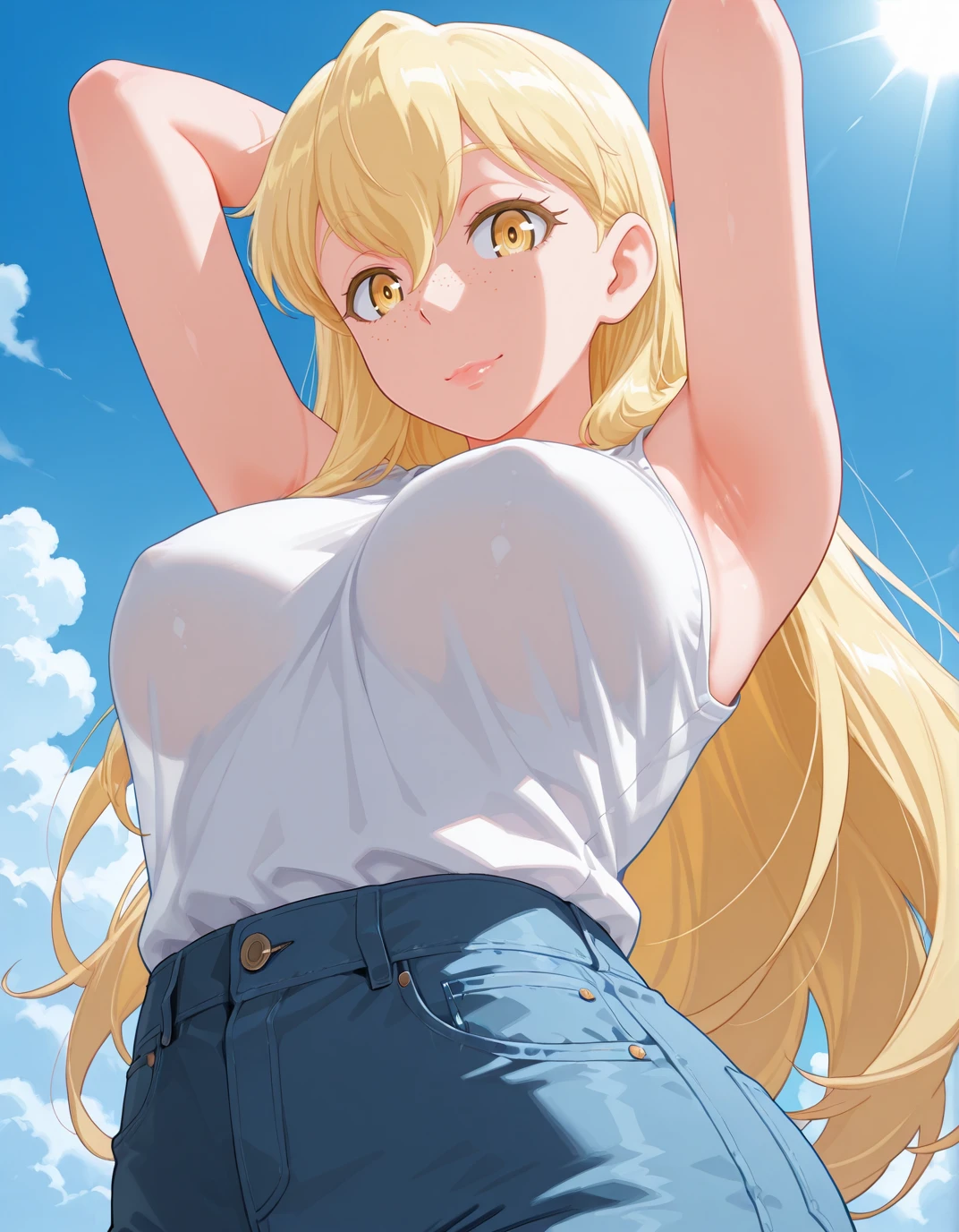 Basic trigger words: ( freckles:1.2), blonde hair, long hair, hair between eyes, dark yellow eyes, thin lips, large natural breasts