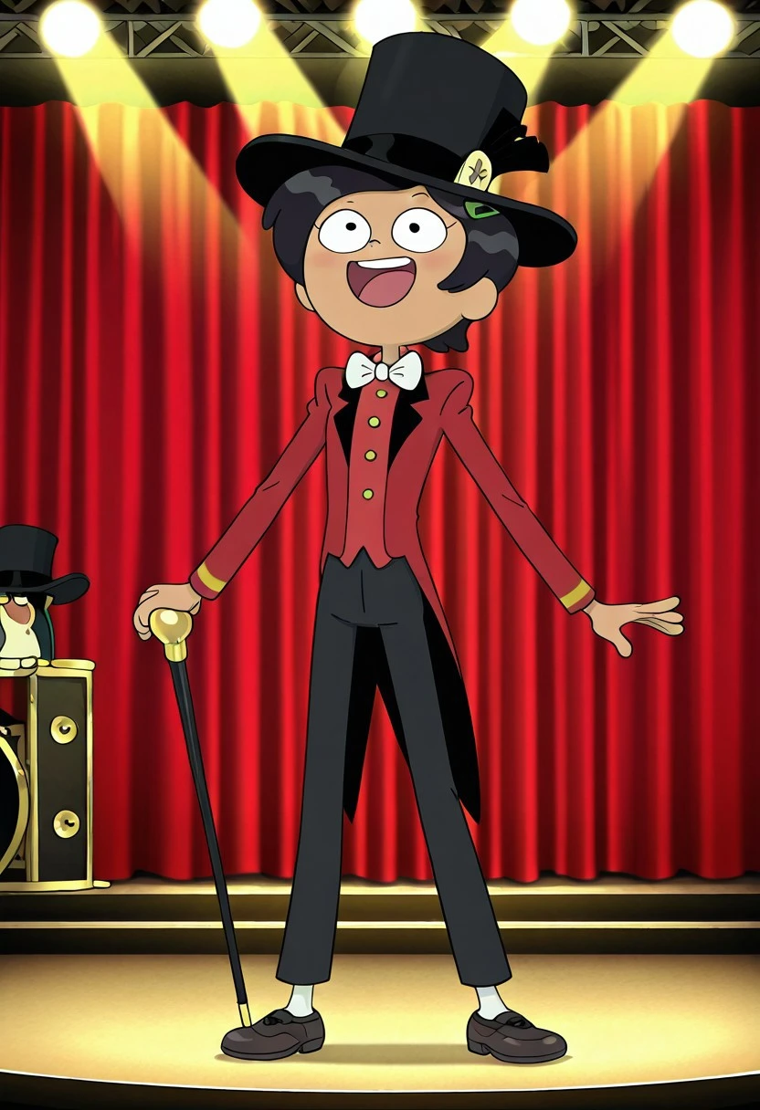 Marcy's performance outfit,top hat, jumpsuit, red performance shirt, long performance dress, black jeans, performance cane, white stockings, dress shoes