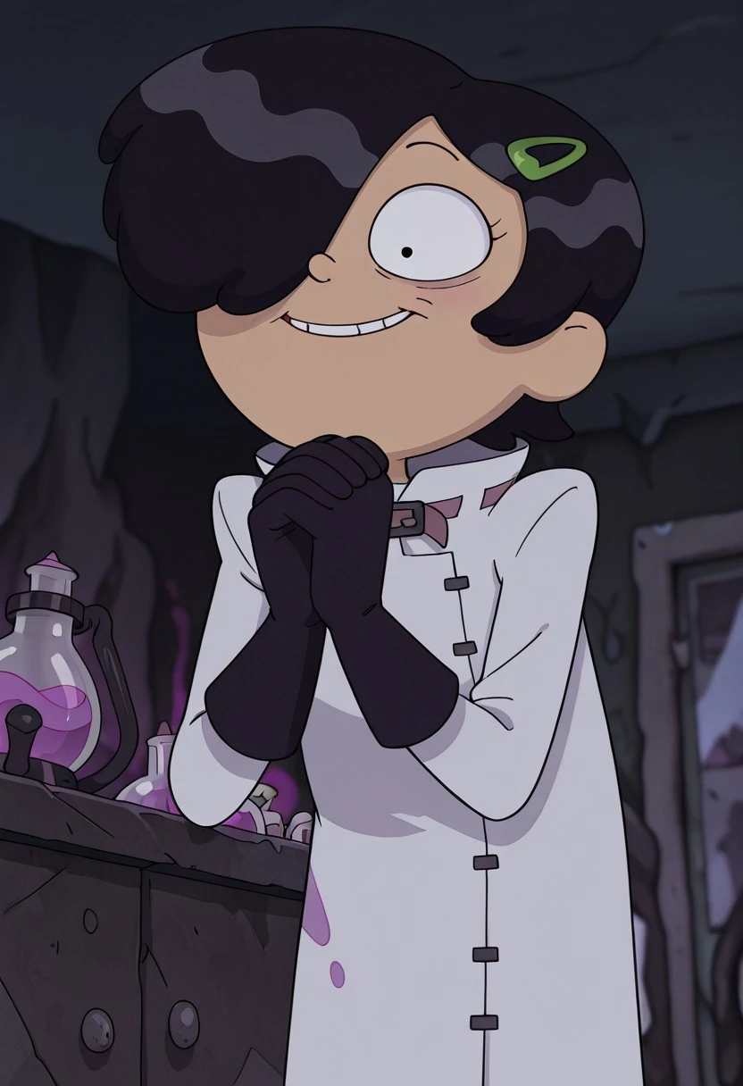 Marcy's scientist outfit,Mad scientist's lab coat, hair over one eye, gloves, black scientist's gloves, black boots,