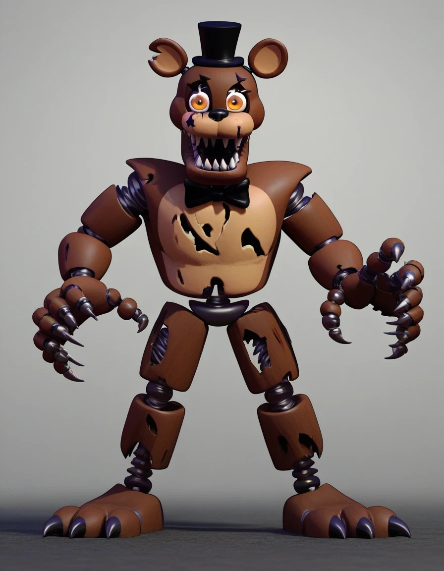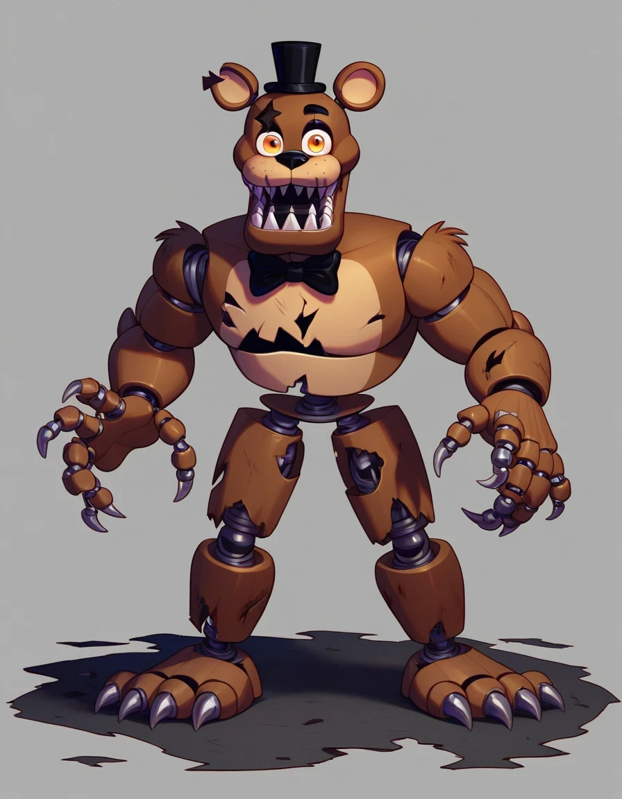 Nightmare_FreddyFNAF, 1boy, hat, bow, teeth, bowtie, no humans, sharp teeth, mini hat, top hat, furry male, bear ears, orange eyes, Animatronic, withered body, claws, exposed endoskeleton, damaged, heavily, damaged, horror (theme)