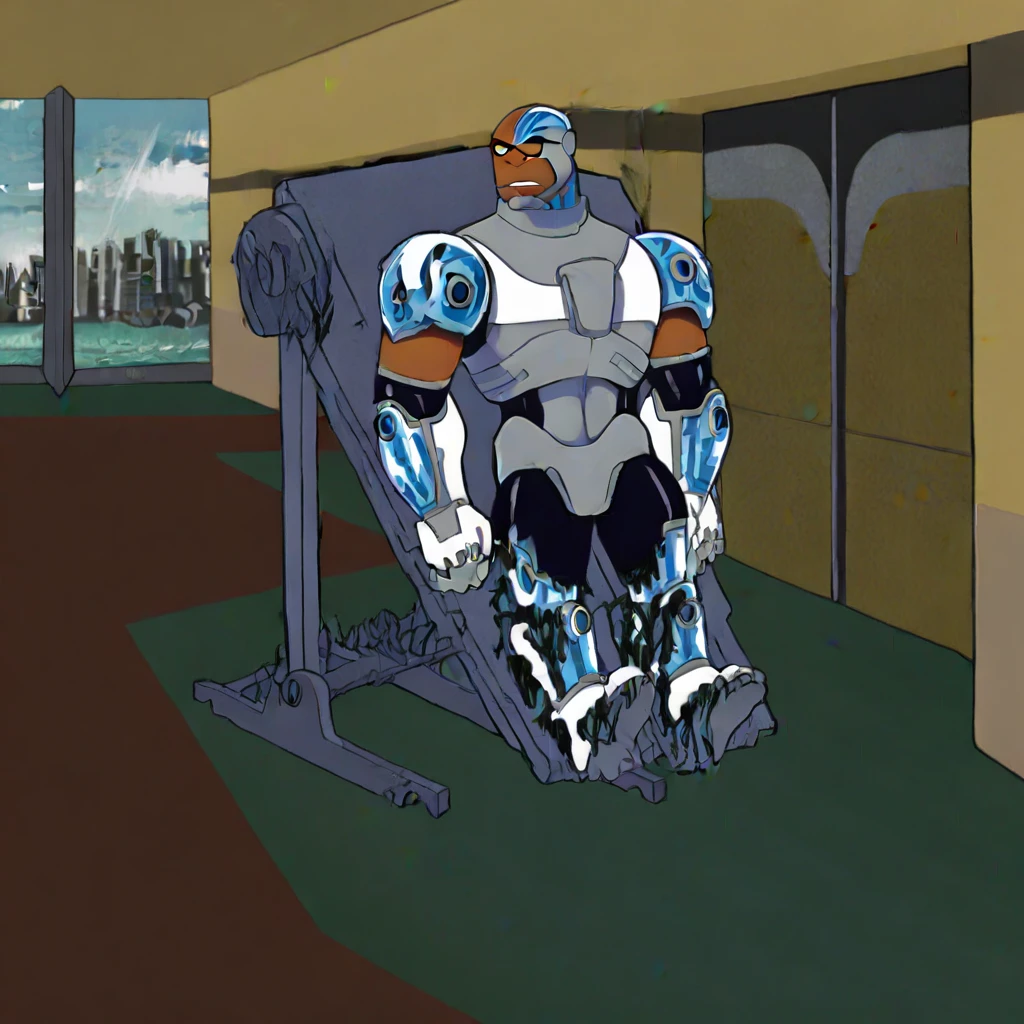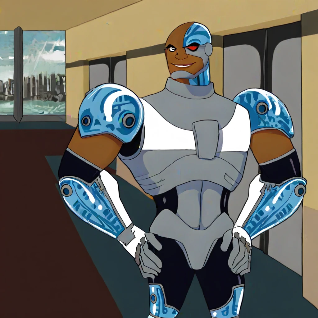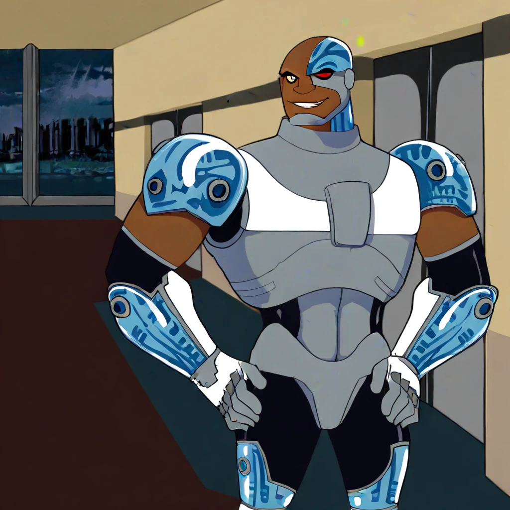 1man. dark skin, red left eye, Cyborg outfit, bald
