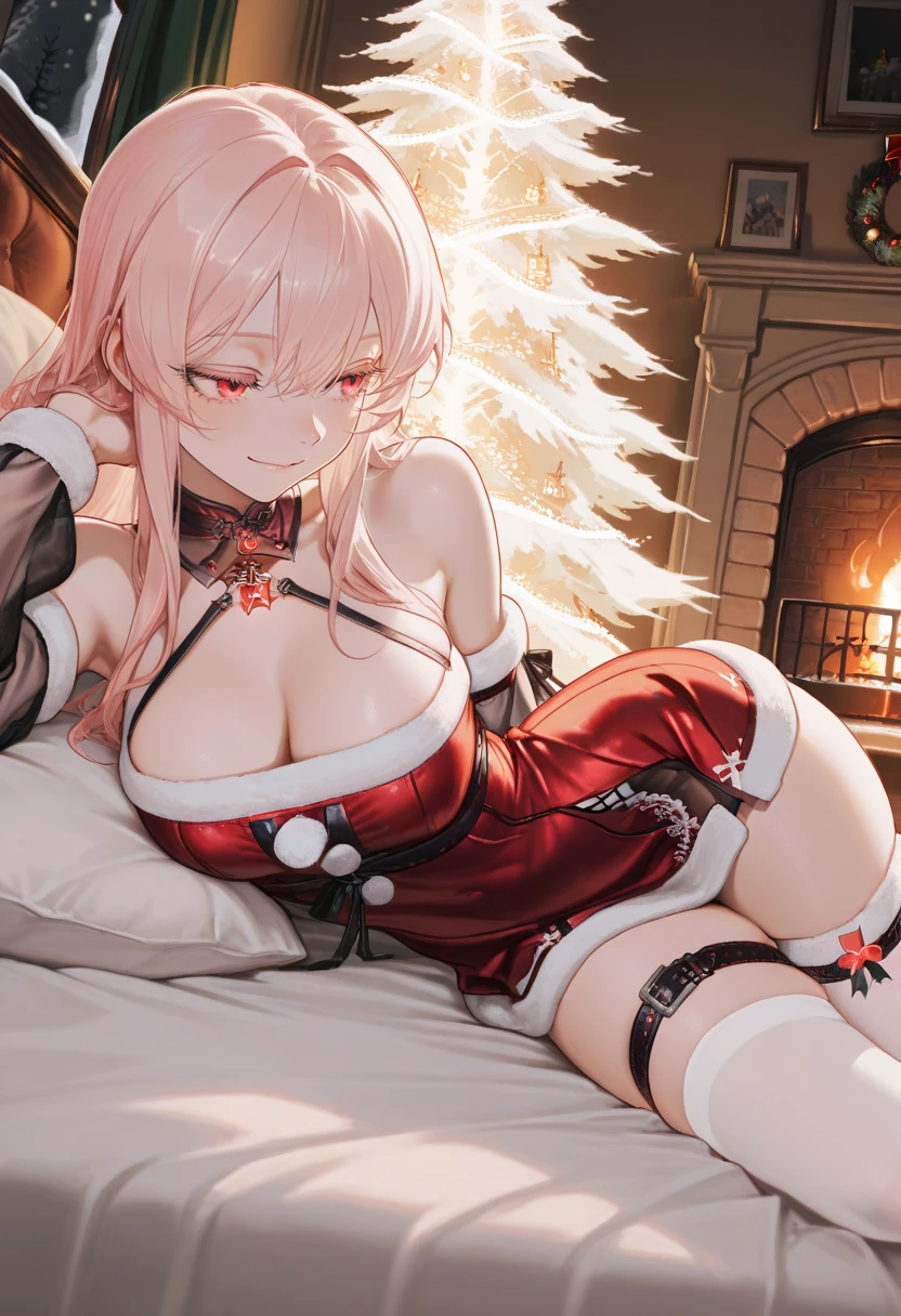 s4nt4, red dress, detached sleeves, thigh strap, white thighhigh, single thighhigh, red heels,