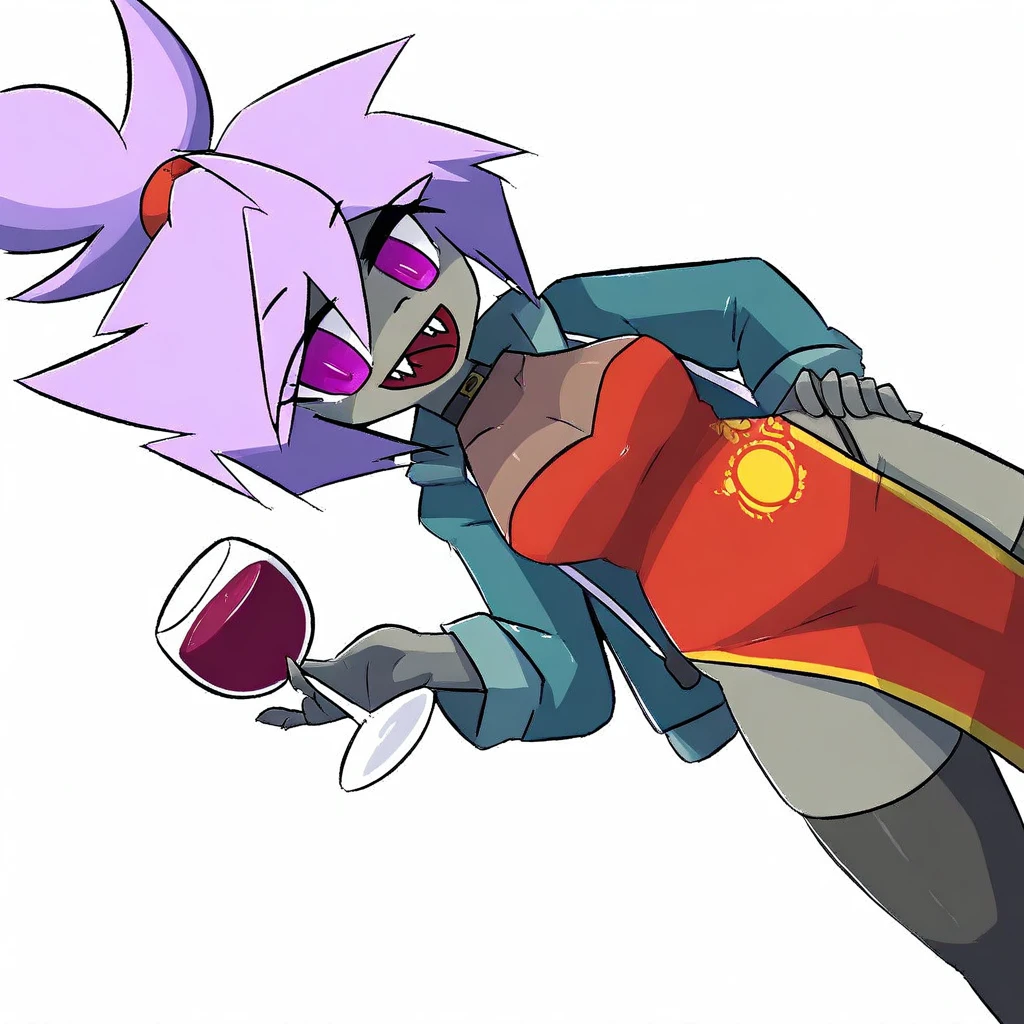 "amazing quality, best detail, newest, smooth line art, 1girl, solo, light-gray skin, sharp pointy teeth, bright magenta eyes, messy spiky lavender hair with high top-knot, red chinese dress with yellow circle patterns, blue , dark grey thigh-highs, curvy body, fluffy tail" "amazing quality, best detail, newest, smooth line art, 1girl, solo, light-gray skin, sharp pointy teeth, bright magenta eyes, messy spiky lavender hair with high top-knot, blue off-shoulder sweater dress, long sleeves, layered blue skirt, dark grey thigh-highs, gray paws, curvy body, fluffy tail"
