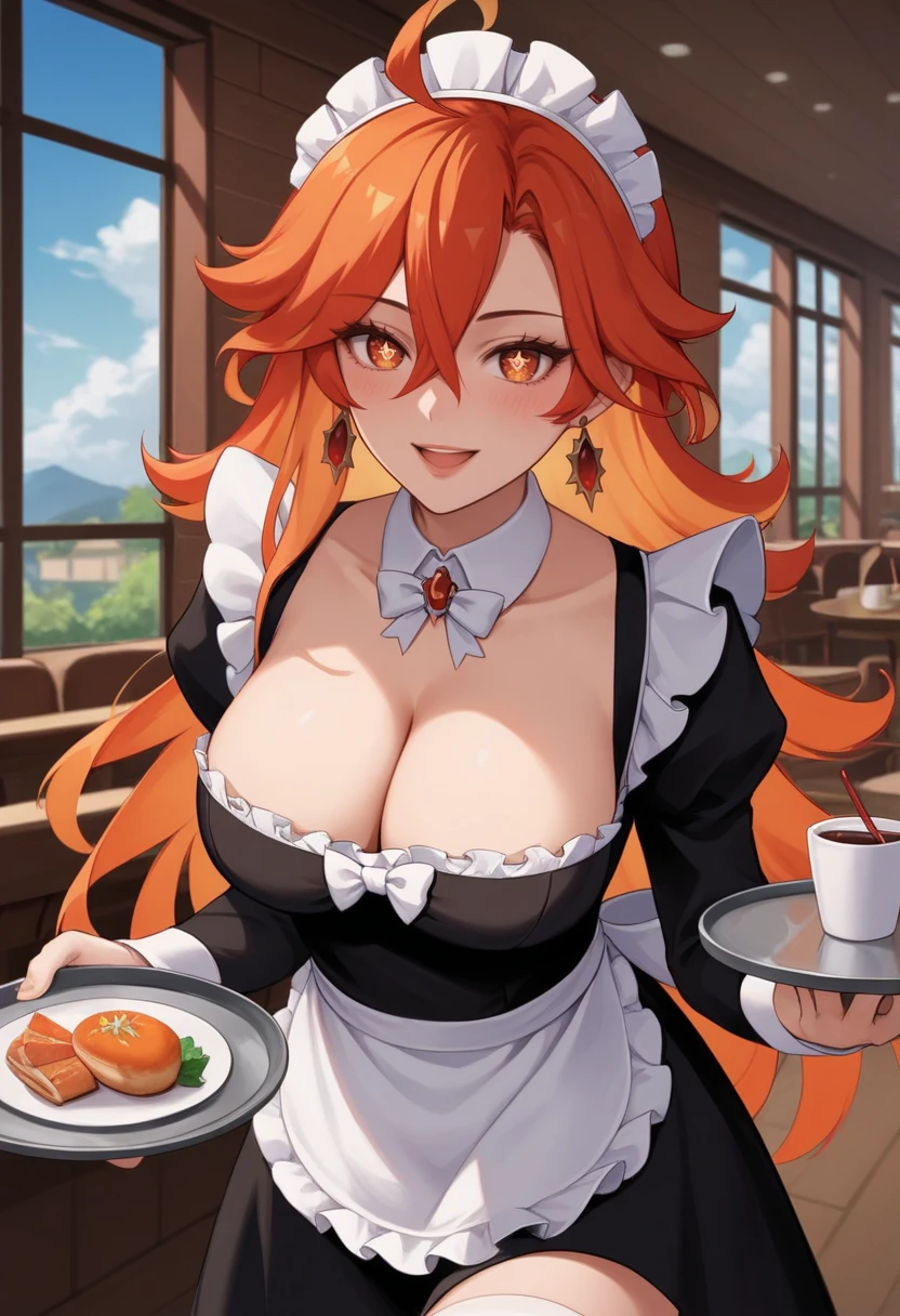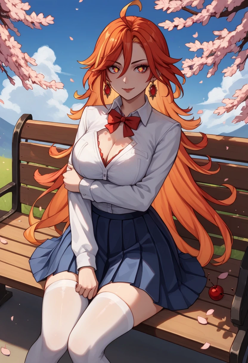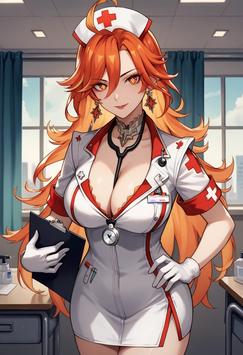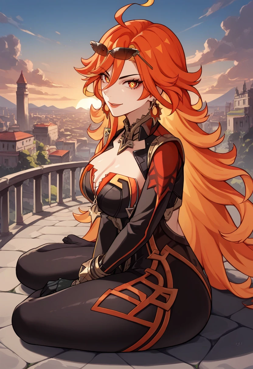 Outfit: ["mavuikadwnsty, sun-shaped pupils, orange hair, jewelry, earrings, multicolored hair, red hair, ahoge, black gloves, two-tone hair, hair between eyes. black bodysuit, sunglasses, tinted eyewear"]