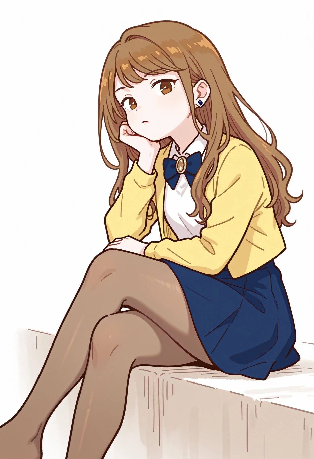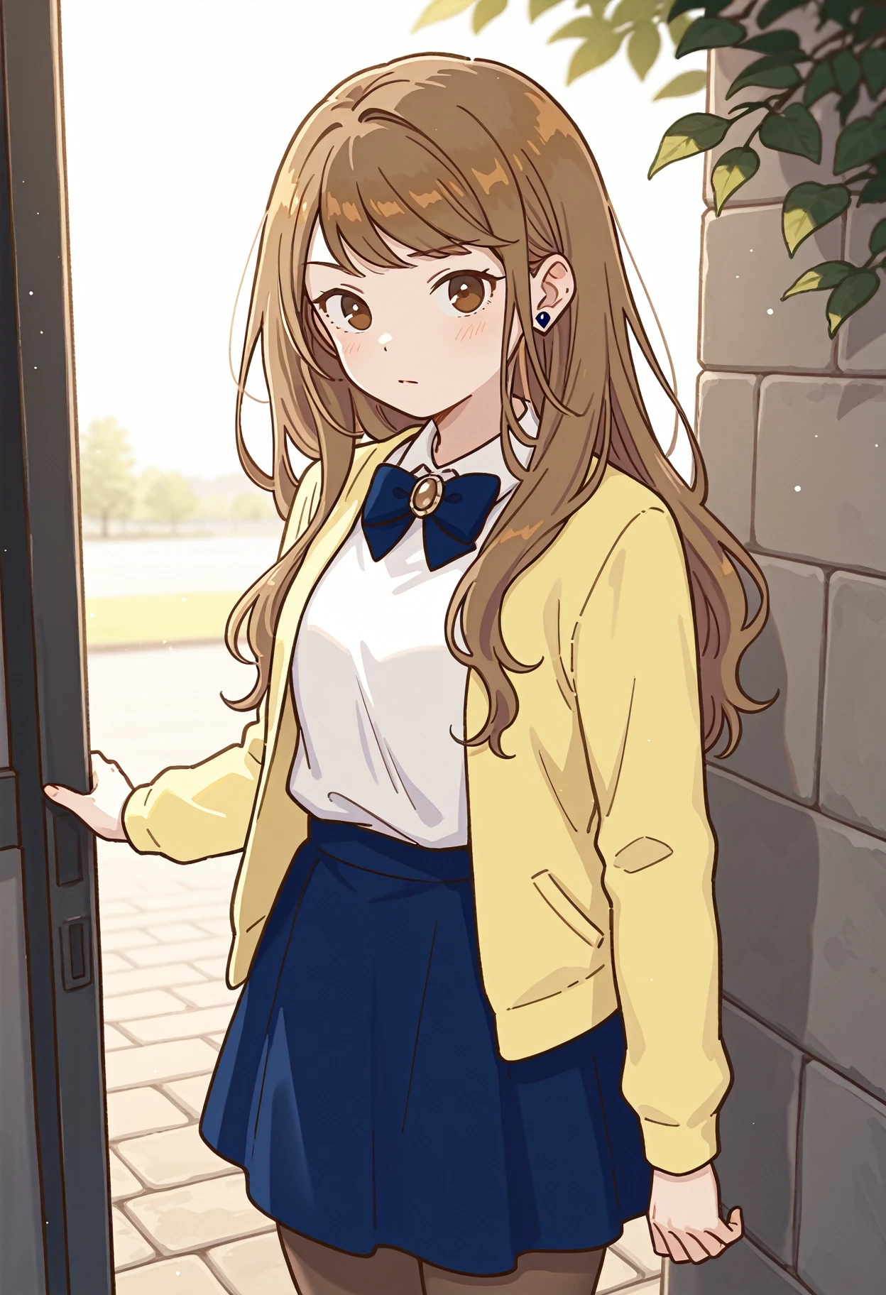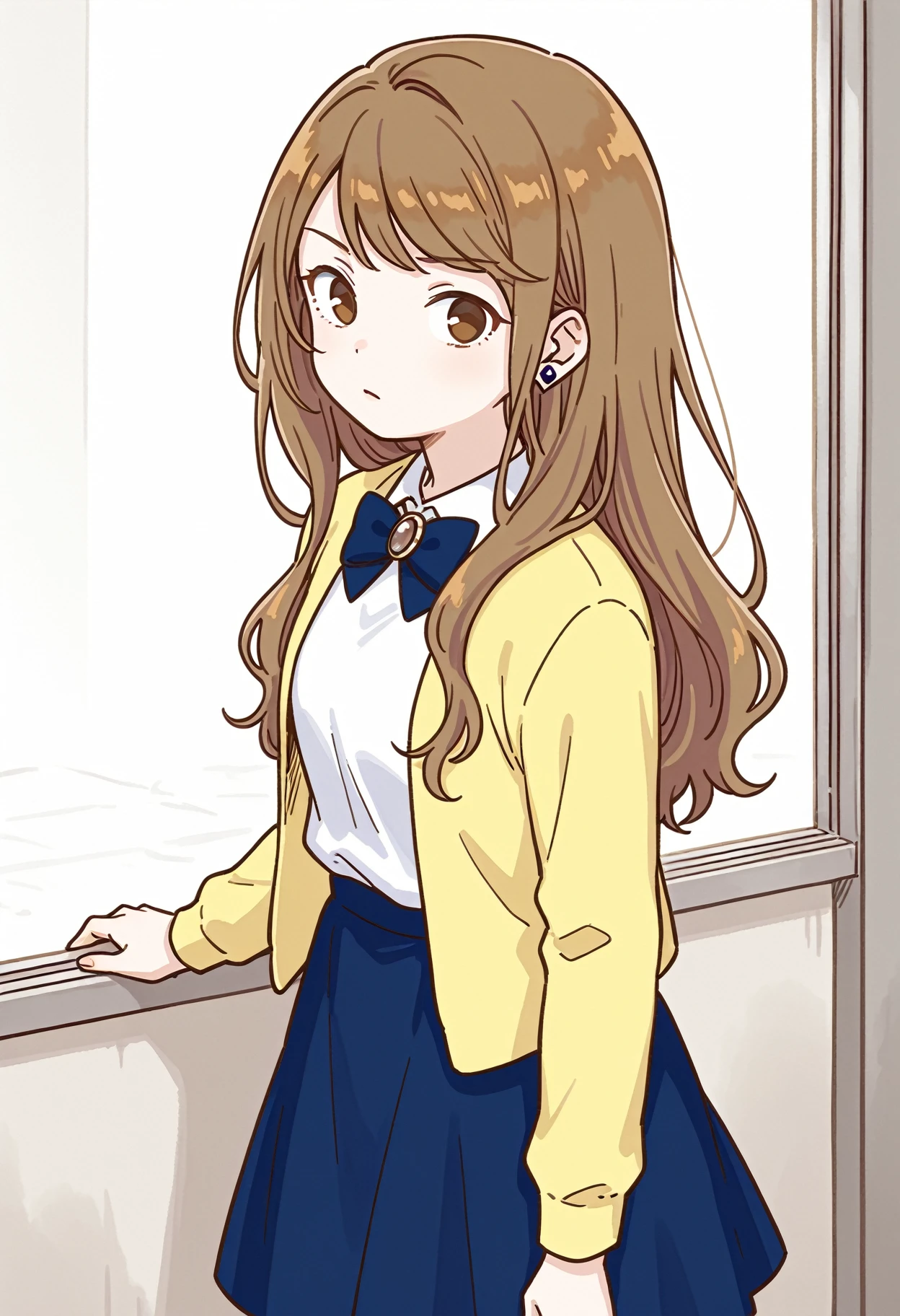 1girl, solo, brown hair, long hair,brown eyes, bow, bowtie, blue bow, blue bowtie. shirt, white shirt, collared shirt, jacket, yellow jacket, ,earrings, skirt, blue skirt, mary janes optional : pantyhose, white socks,
