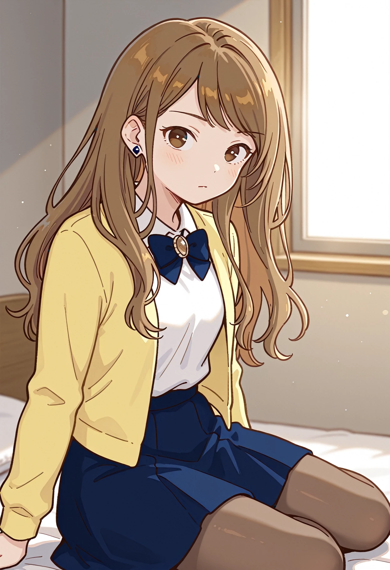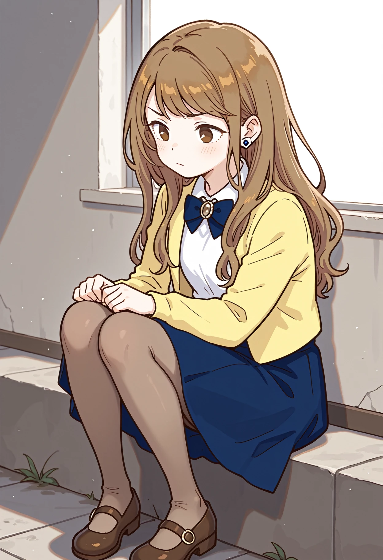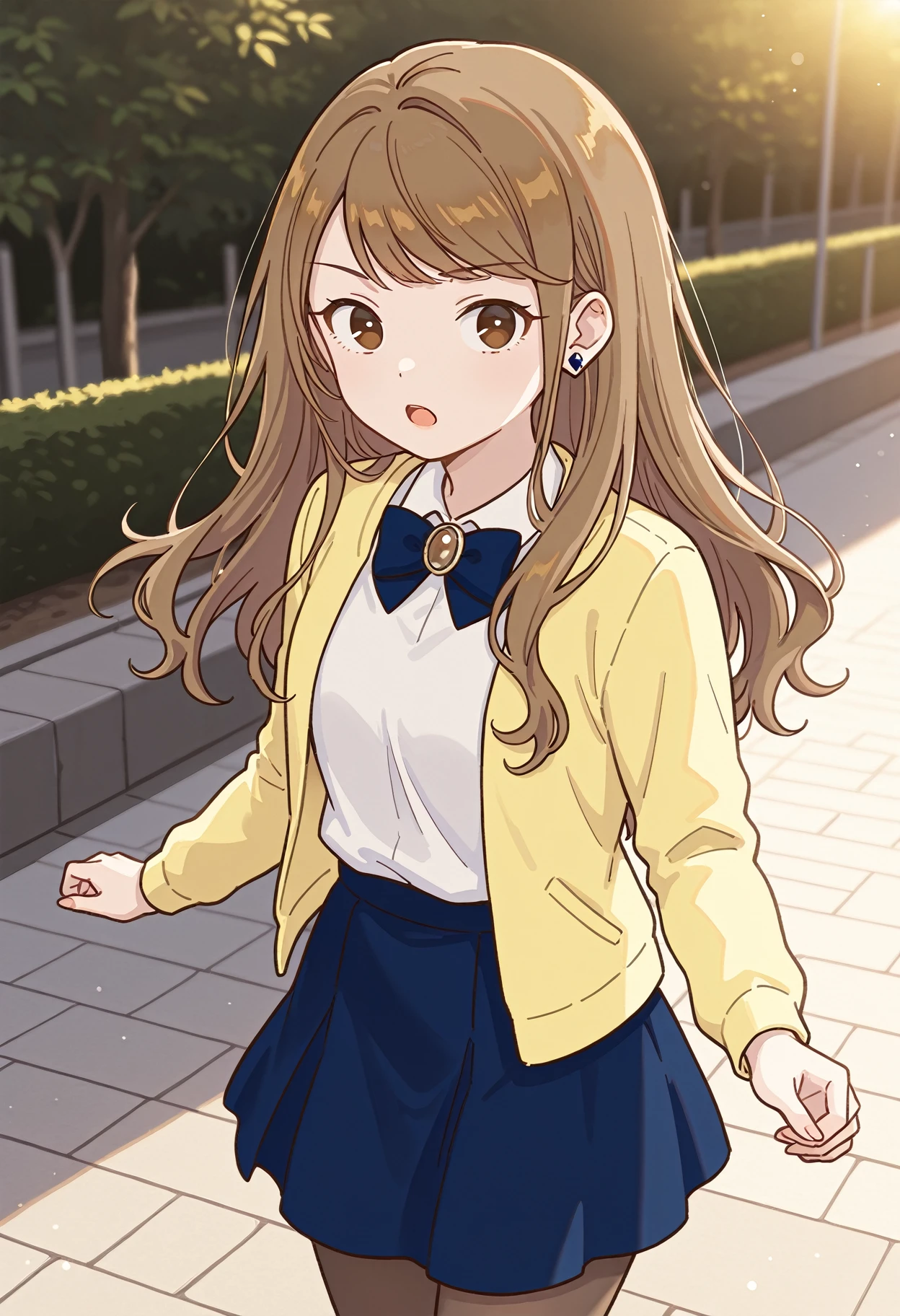 1girl, solo, brown hair, long hair,brown eyes, bow, bowtie, blue bow, blue bowtie. shirt, white shirt, collared shirt, jacket, yellow jacket, ,earrings, skirt, blue skirt, mary janes optional : pantyhose, white socks,
