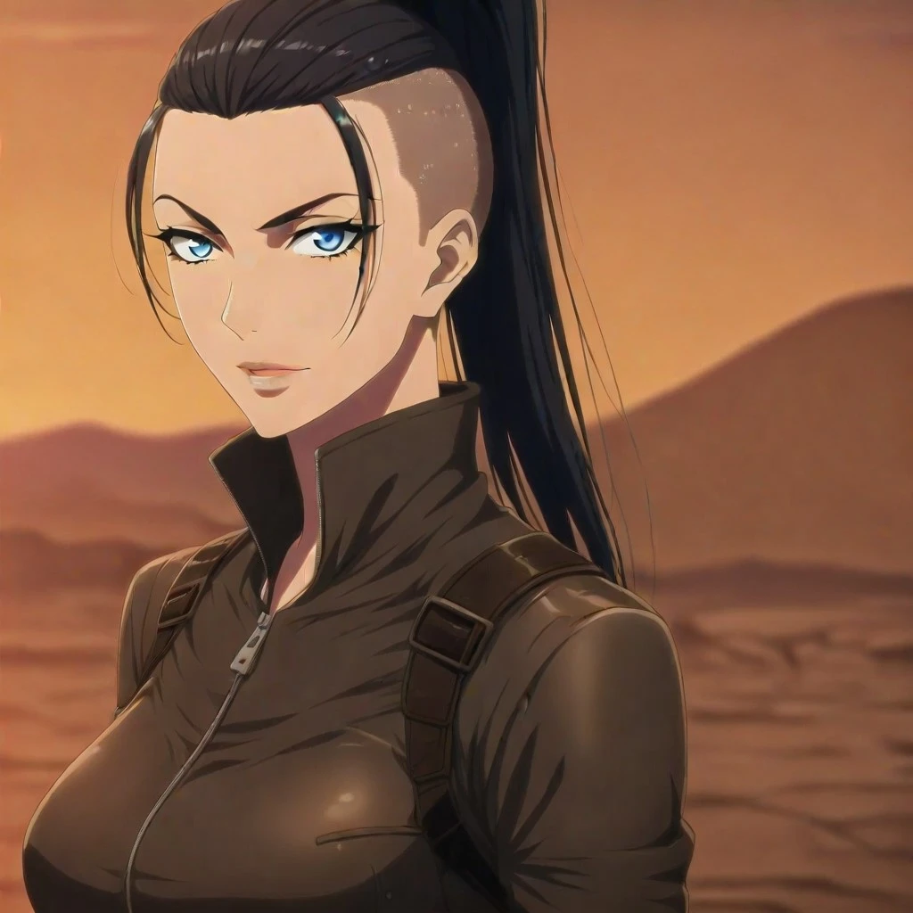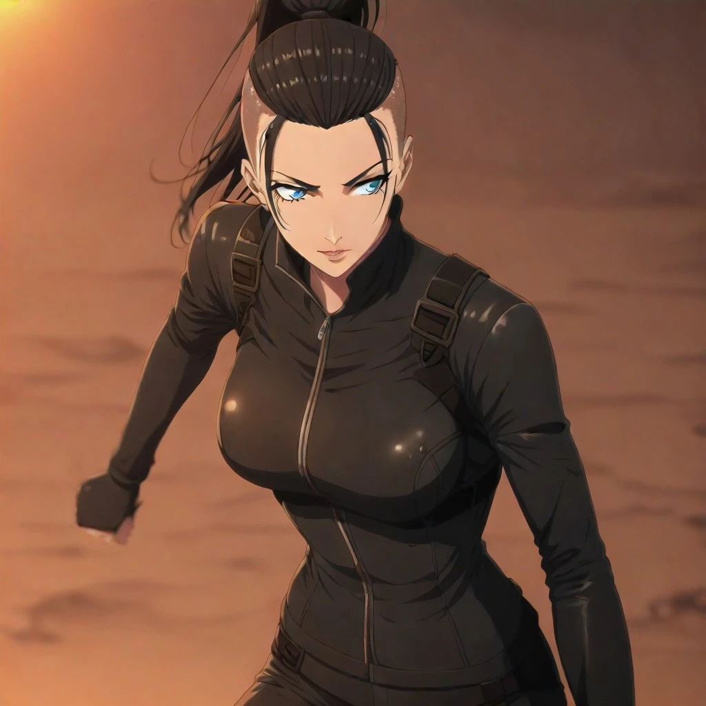 "young woman, undercut hairstyle with shaved sides, long black hair tied in high ponytail, sharp blue eyes, pale skin, slim athletic build, anime style"