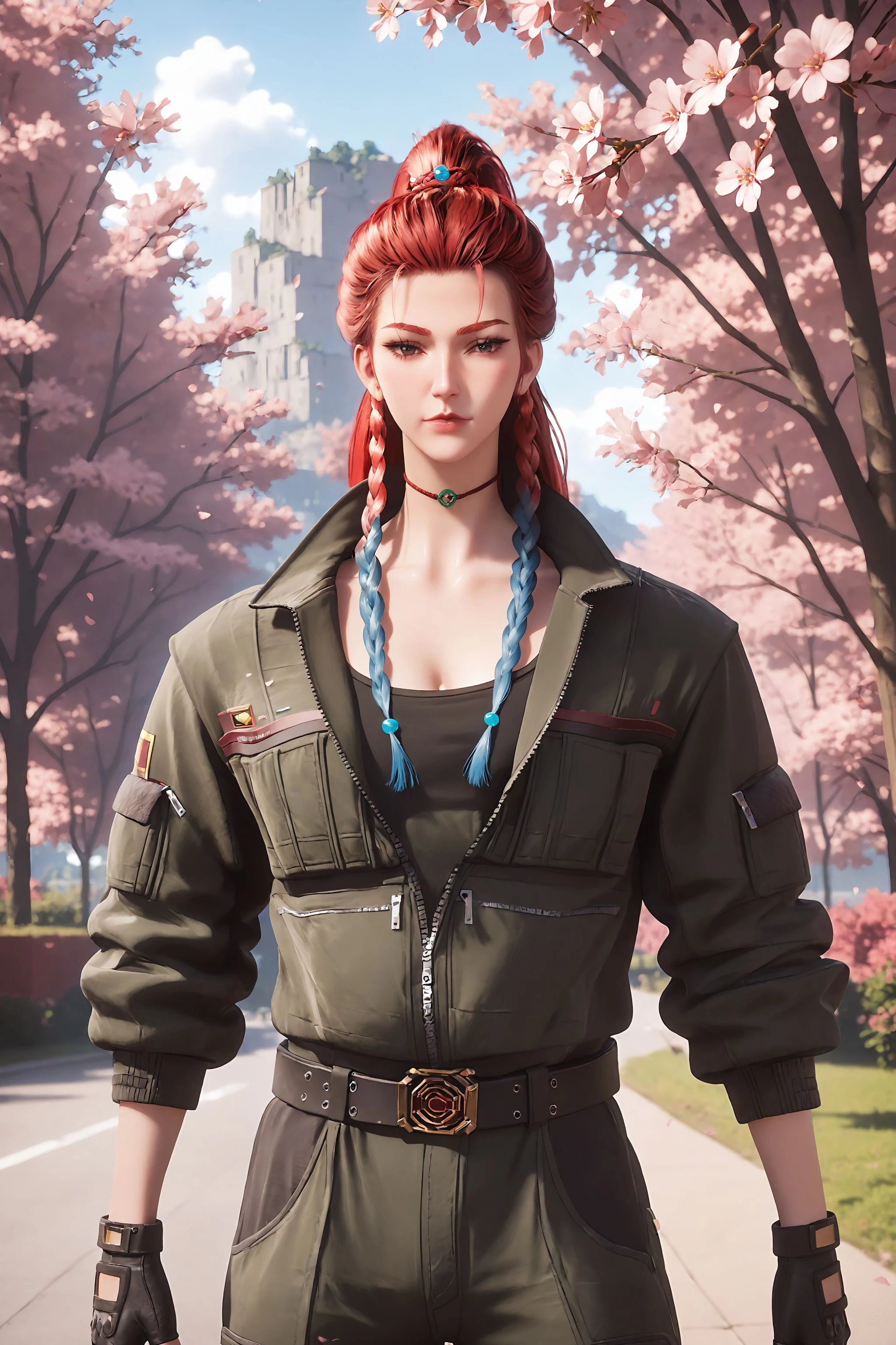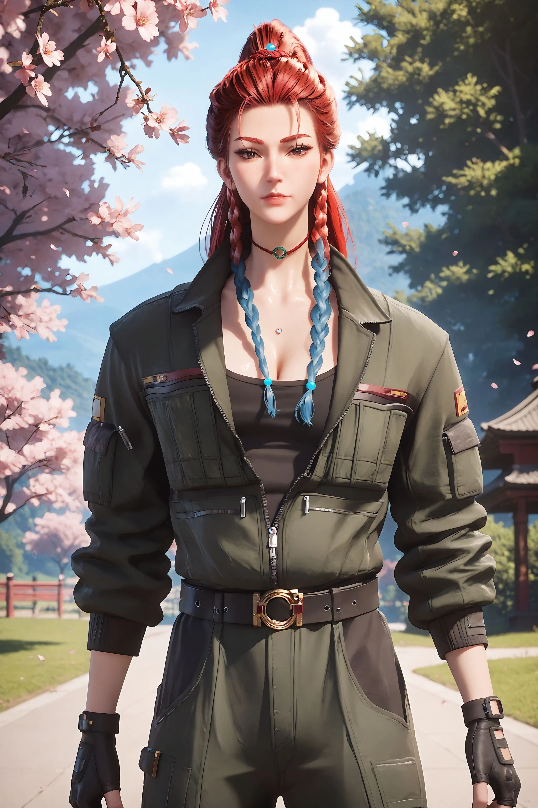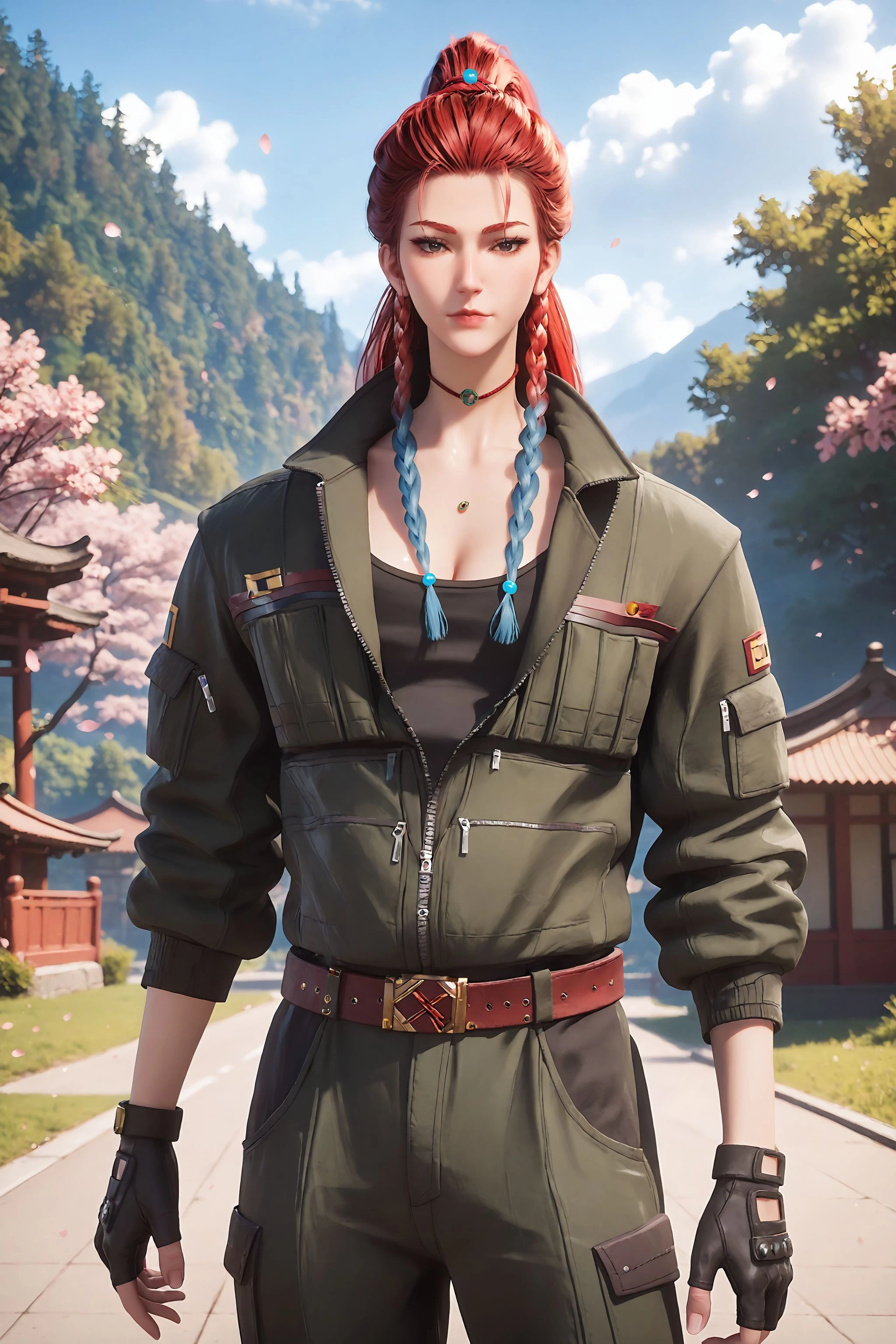 1girl, solo, red hair, gloves, fingerless gloves, long hair, braid, sheath, multicolored hair, jacket, ponytail, black gloves, belt, blue hair