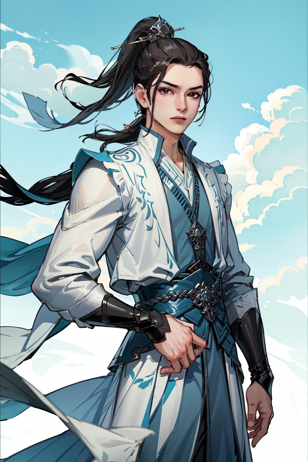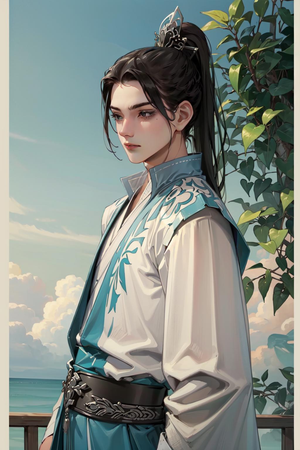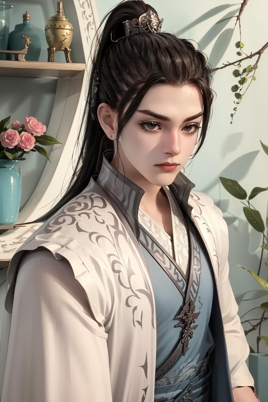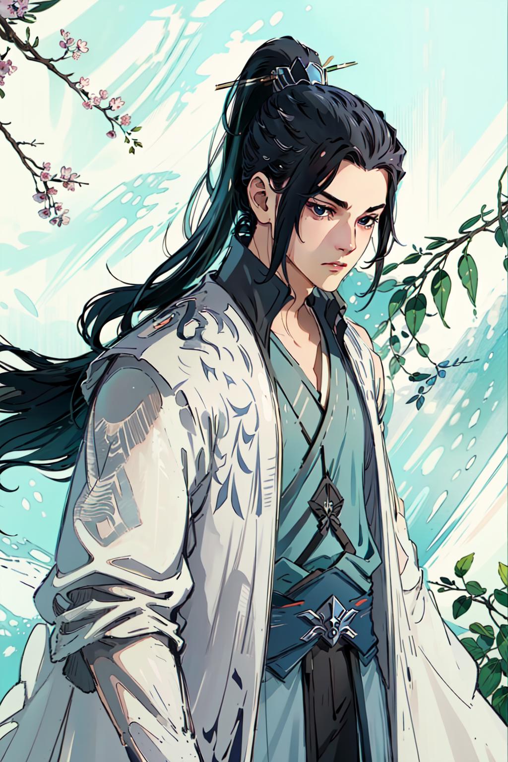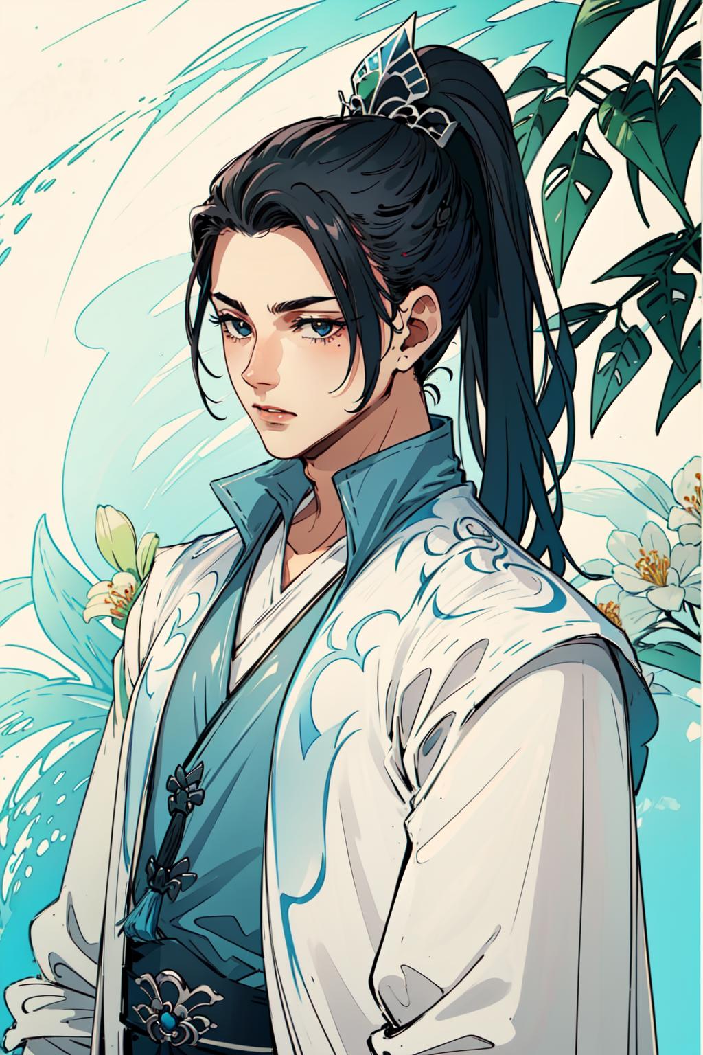 tags: liu qingge, 1boy, male focus, chinese clothes, ponytail, hair ornament