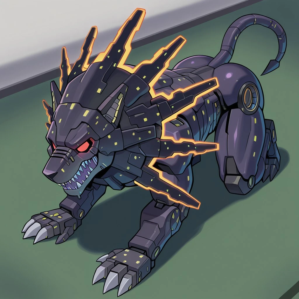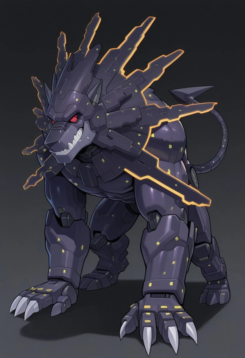 GospelMMBT,feral,wolf,canine,robot,male,solo,red eyes,sharp teeth,tail,purple-grey body,white claws