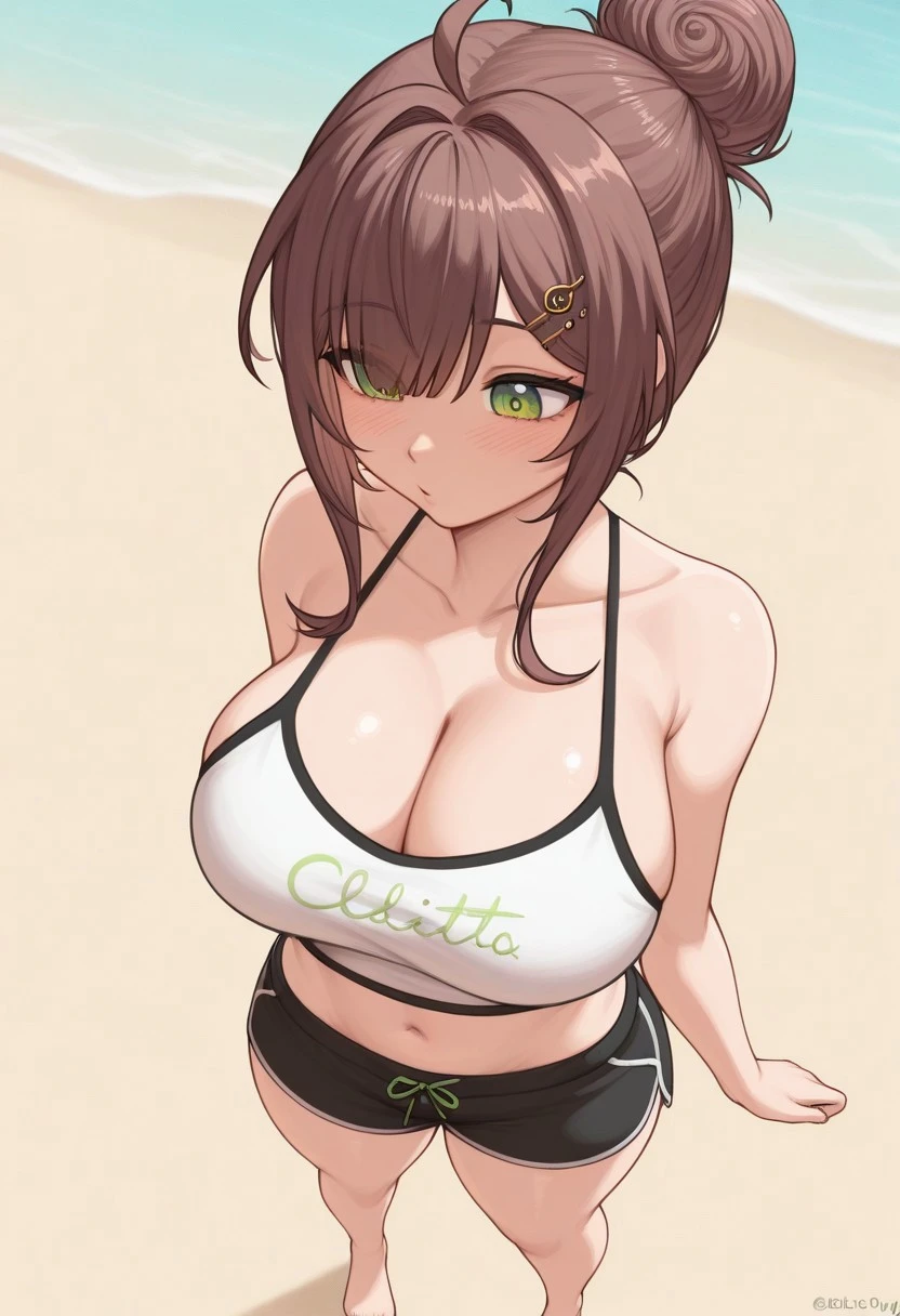mio_casual, brown hair, short hair, green eyes, musical note hair ornament, musical note, hair ornament, treble clef, ahoge, bangs, large breasts,