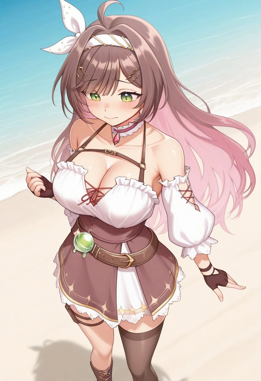 mio_guildmaster, brown hair, multicolored hair, pink hair, long hair, green eyes, blush, musical note hair ornament, musical note, hair ornament, treble clef, ahoge, bangs, large breasts, headband, bow, jewelry,
