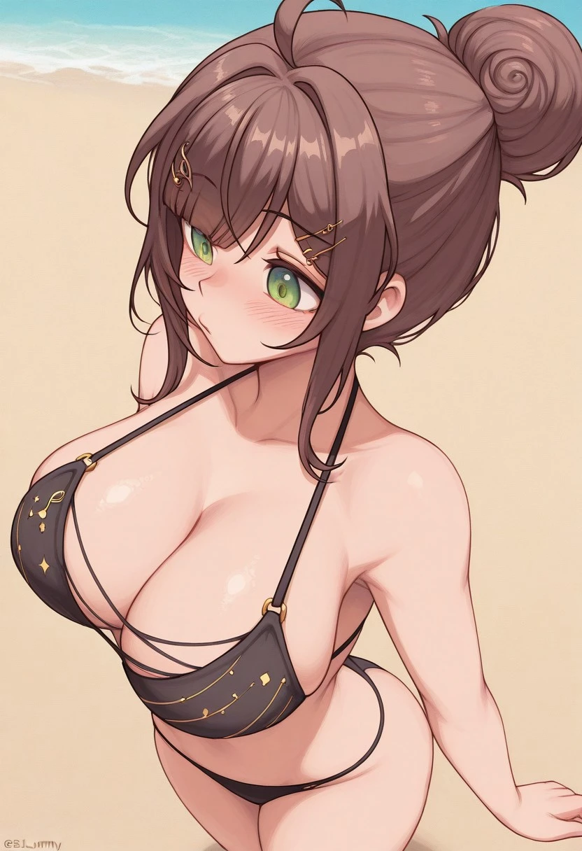 mio_comfy, brown hair, hair bun, single hair bun, green eyes, blush, musical note hair ornament, musical note, hair ornament, treble clef, ahoge, bangs, large breasts,