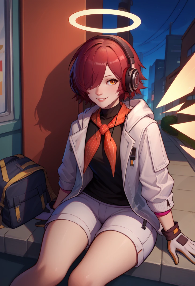 City Rider: exusiaicity, hair over one eye, headphones, halo, orange eyes, open clothes, white jacket, hooded jacket, open jacket, black shirt, red neckerchief, white gloves, white shorts, detached wings, energy wings