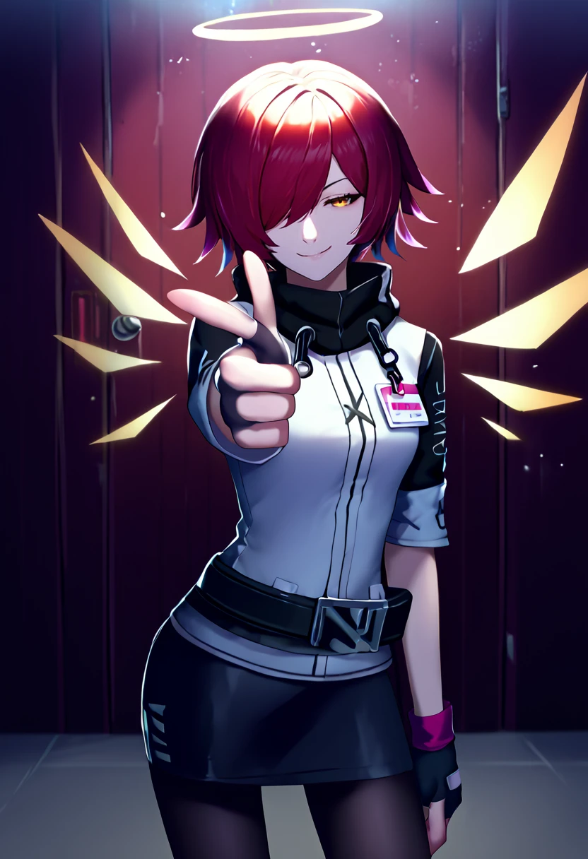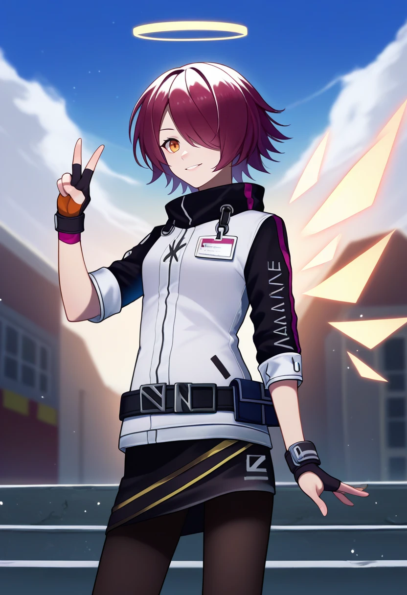 Default Outfit: exusiaidef, hair over one eye, halo, orange eyes, white jacket, id card, black belt, short sleeves, raglan sleeves, black gloves, fingerless gloves, black skirt, black pantyhose, detached wings, energy wings