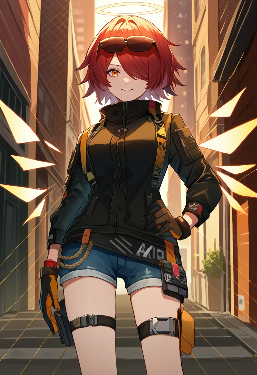 Wild Operation: exusiaiwild, hair over one eye, eyewear on head, sunglasses, halo, orange eyes, black jacket, long sleeves, black gloves, short shorts, thigh strap, detached wings, energy wings