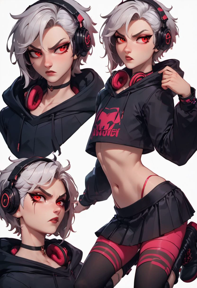 (robotic femboy, trap, crossdressing, long silver wig, glaring red eyes)
