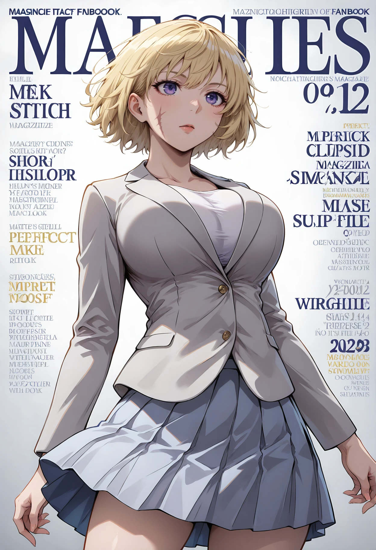 Outfit 2: skirt,breasts,jacket,hair behind ear,white jacket,white skirt,medium breasts,shirt,grey skirt,pleated skirt,white shirt,blazer,alternate costume,large breasts,blue skirt,grey jacket,formal,miniskirt,suit