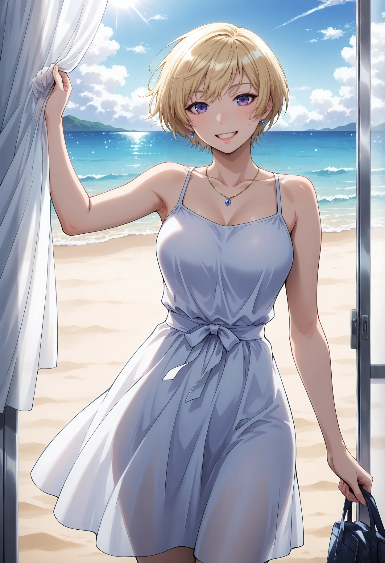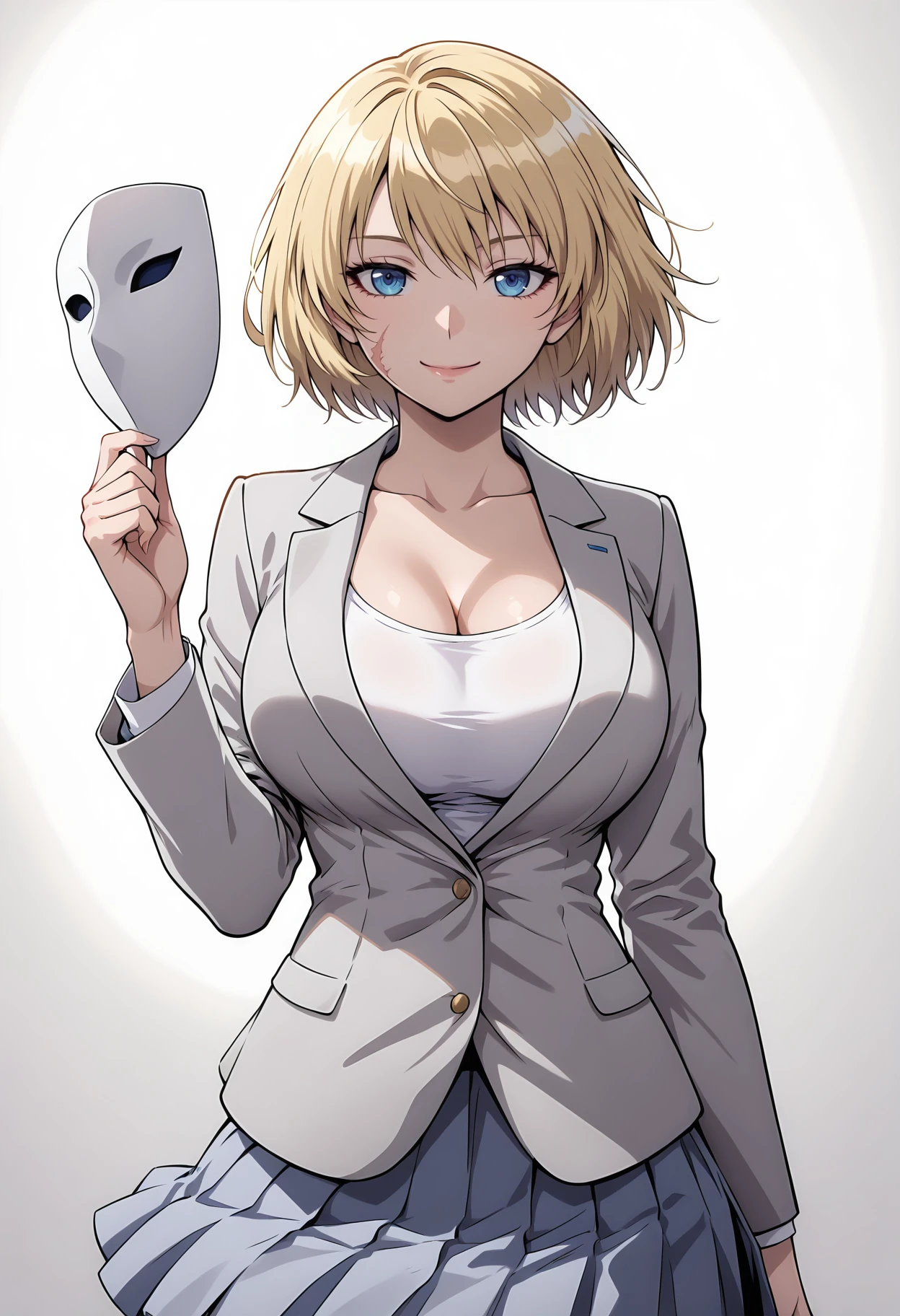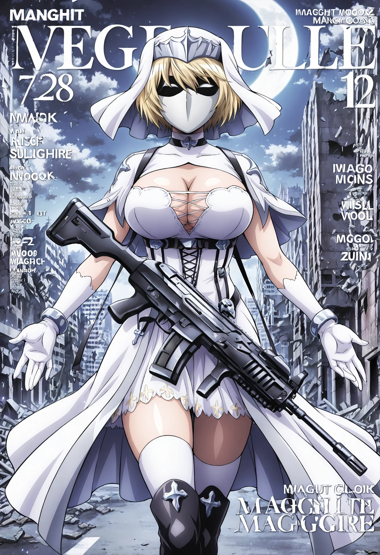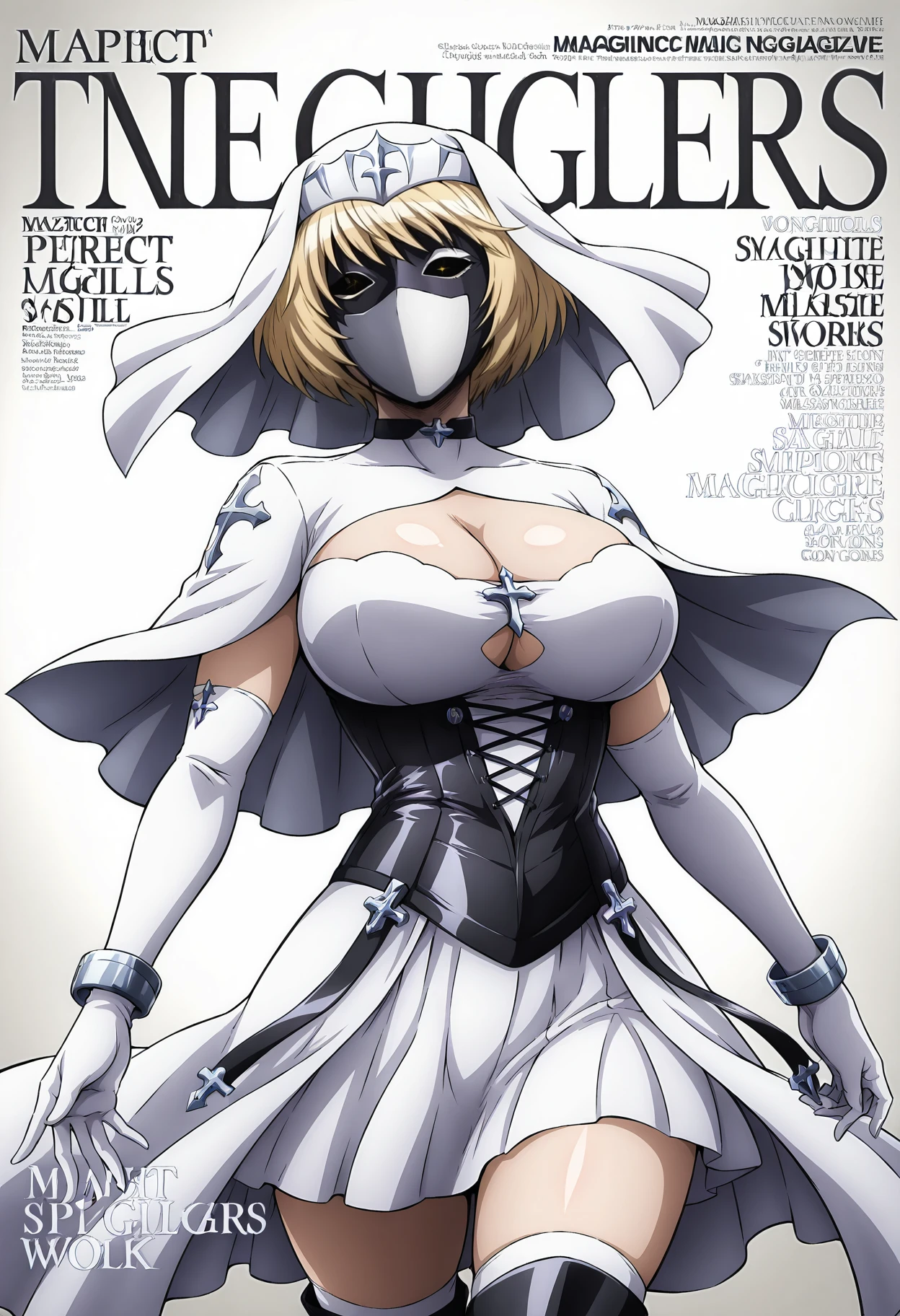 Brigadier Outfit: Brigadier1,1girl,mask,blonde hair,short hair,bangs,veil,breasts,large breasts,gloves,white gloves,elbow gloves,jewelry,choker,bracelet,capelet,white capelet,dress,white dress,clothing cutout,cleavage cutout,corset,thighhighs,white thighhighs,boots,thigh boots,knee boots,black footwear,nun