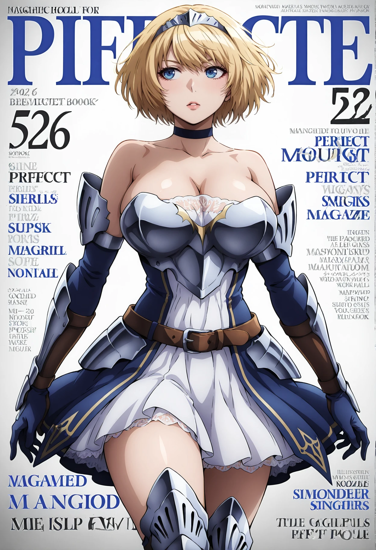 Outfit 1: bare shoulders,breasts,large breasts,thighhighs,boots,armor,gloves,choker,dress,detached sleeves,greaves,belt,hairband,zettai ryouiki,armored dress,strapless