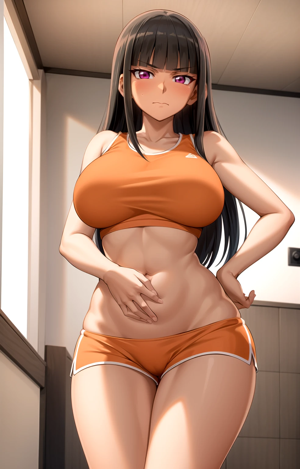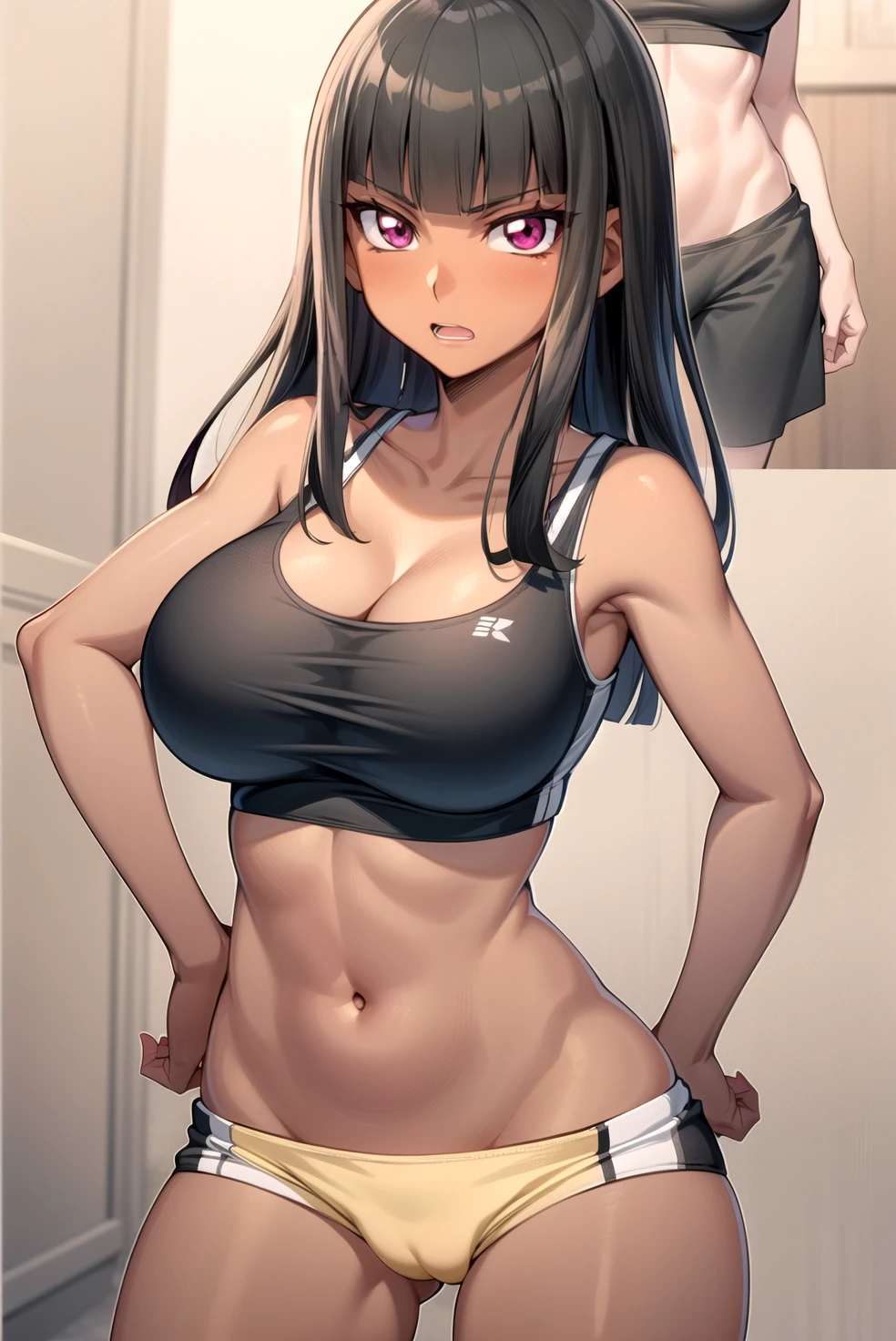 black hair, blunt bangs, purple eyes, long hair, dark skin, dark-skinned female