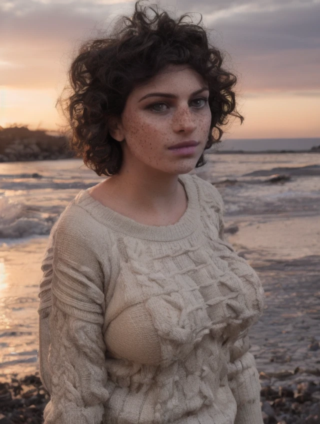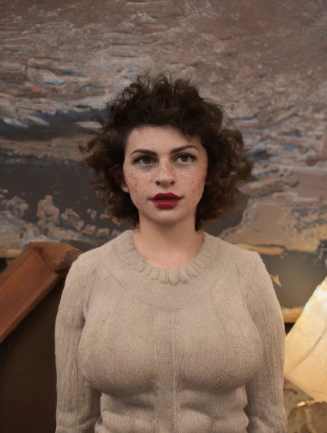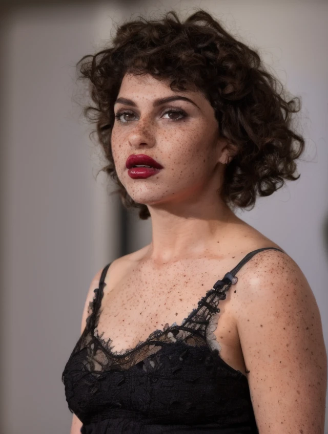 young woman, <lora:al1ash4w:0.9> (al1ash4w:1.2), (parted lips, bedroom eyes:1.2), (lipstick:0.3), (wavy hair, short hair:0.2), dark-skinned female, brown eyes, mole under mouth, freckles on breasts, square jawlineDescription