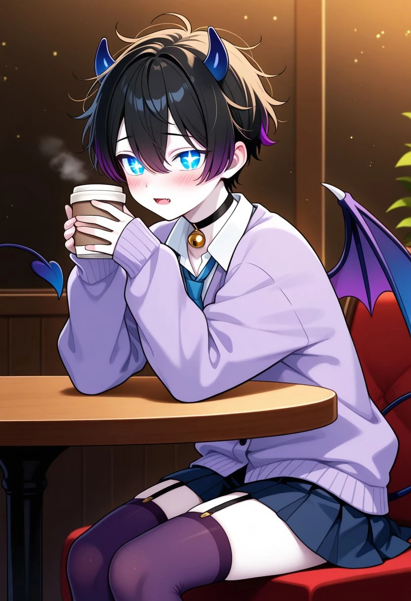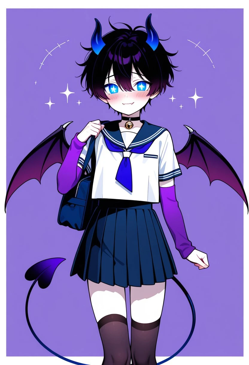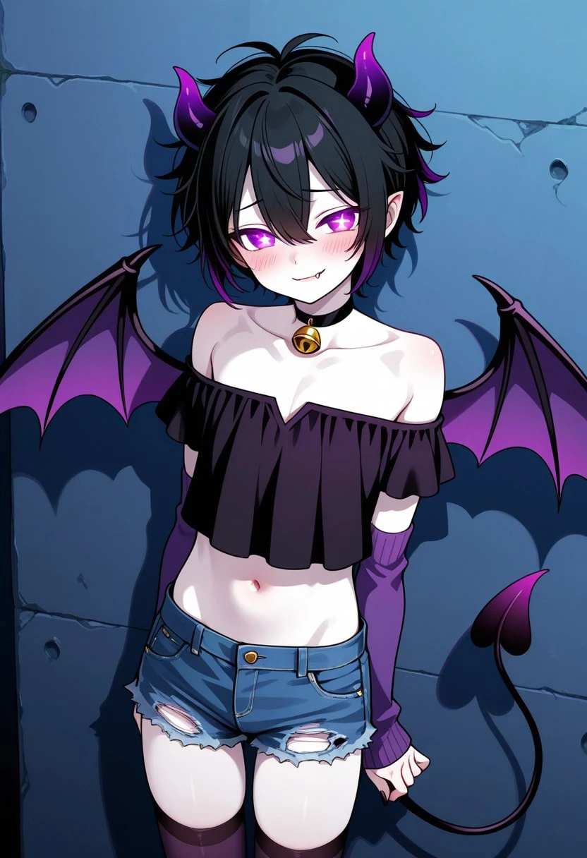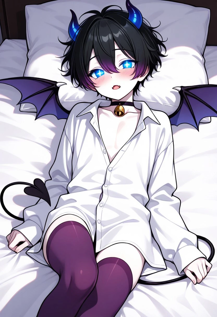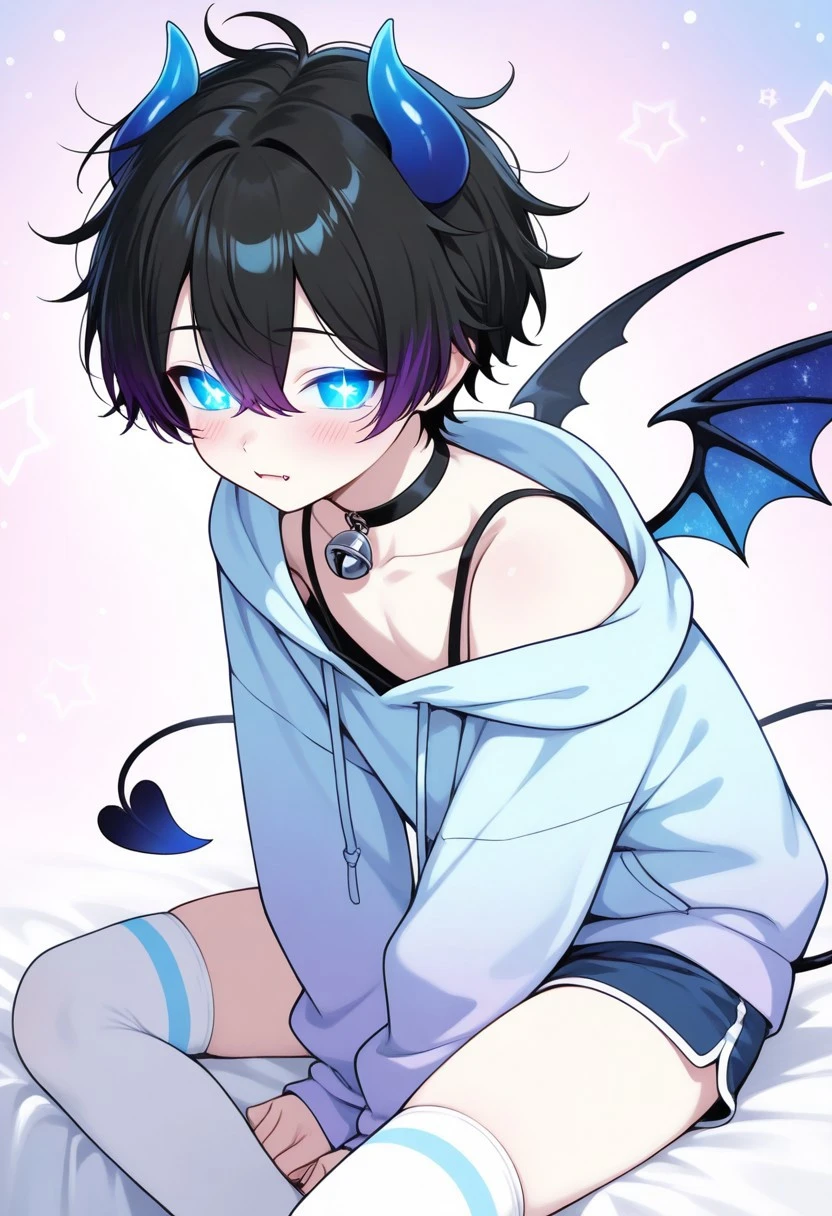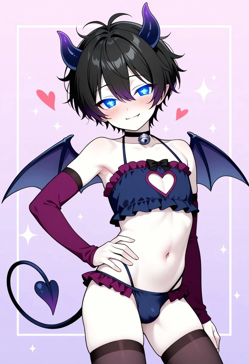 1boy, male focus, femboy, otoko-no-ko, crossdresser boy, succuboy, short hair, messy hair, black hair with purple highlight, demon horns, starry eyes, fangs, small bat wings, demon tail, Accessories :