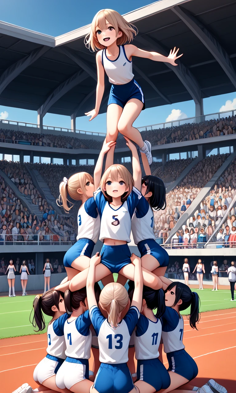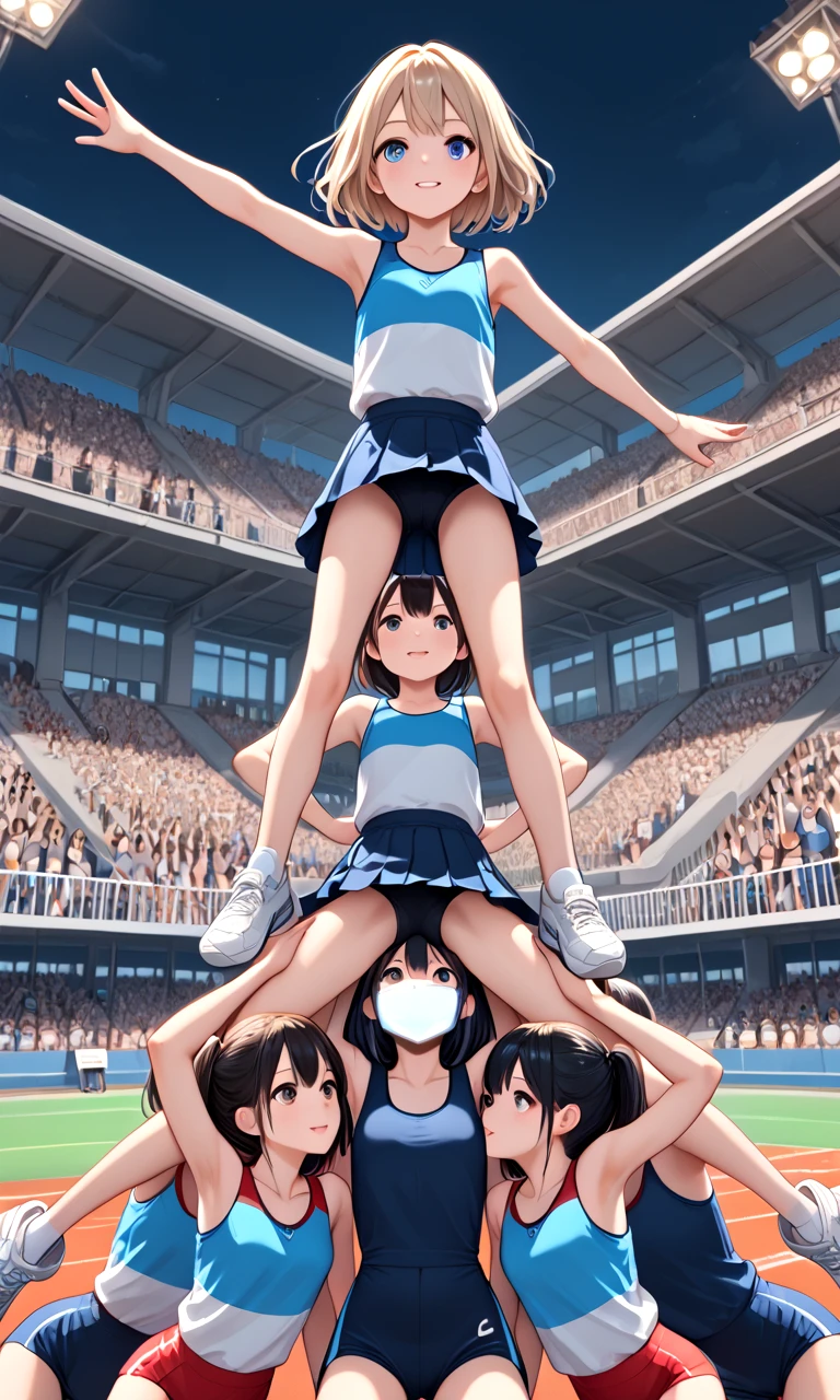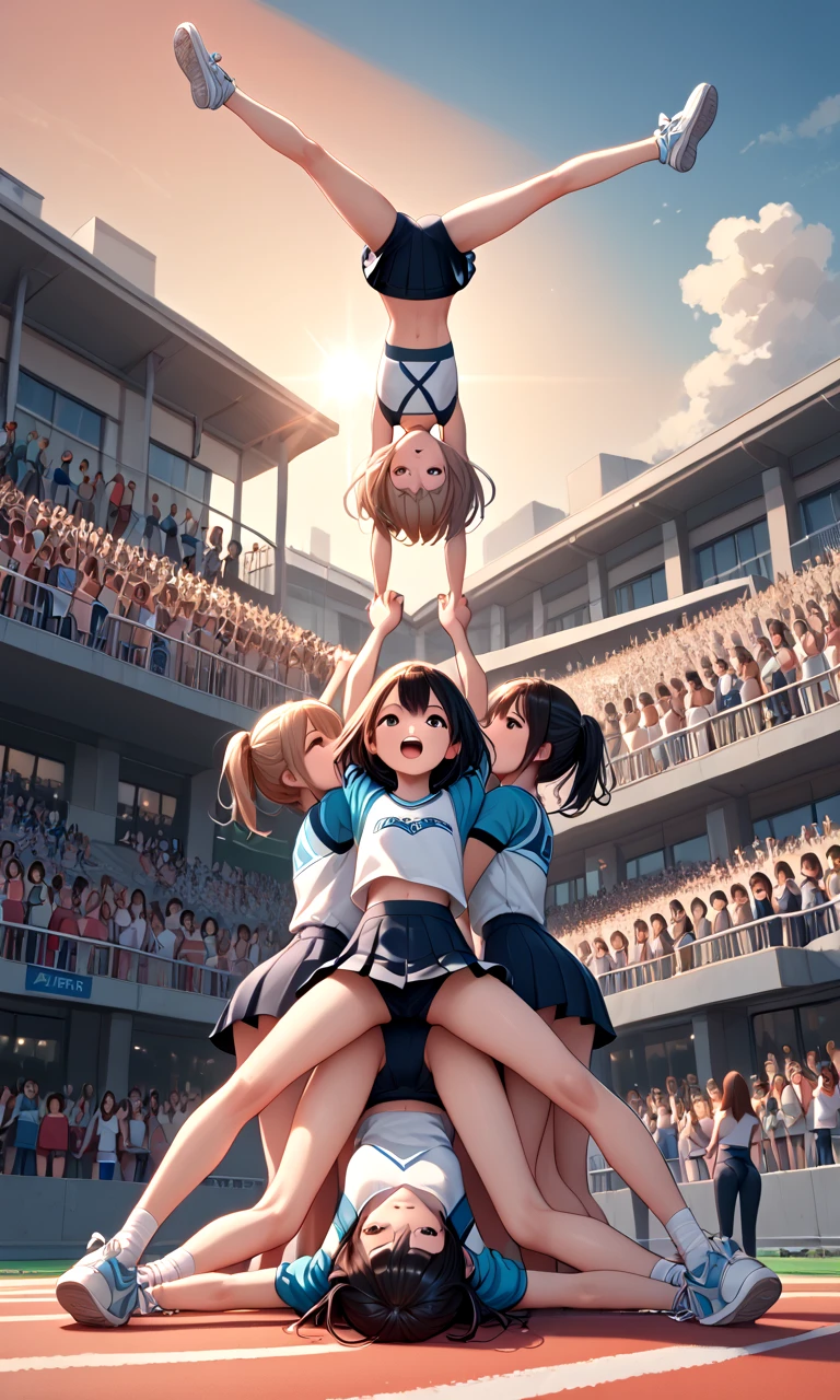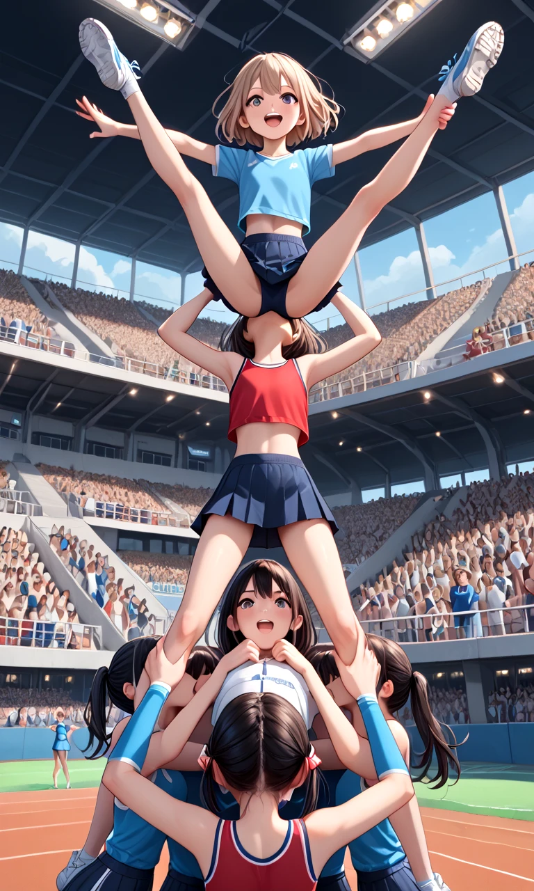 score_9, source_anime, cheerleading stunts, human towers, human stacking, multiple girls, 6+girls, outstretched arms, spread legs, lifting person, jumping, petite, audience, track and field, auditorium, upside down, handstand,