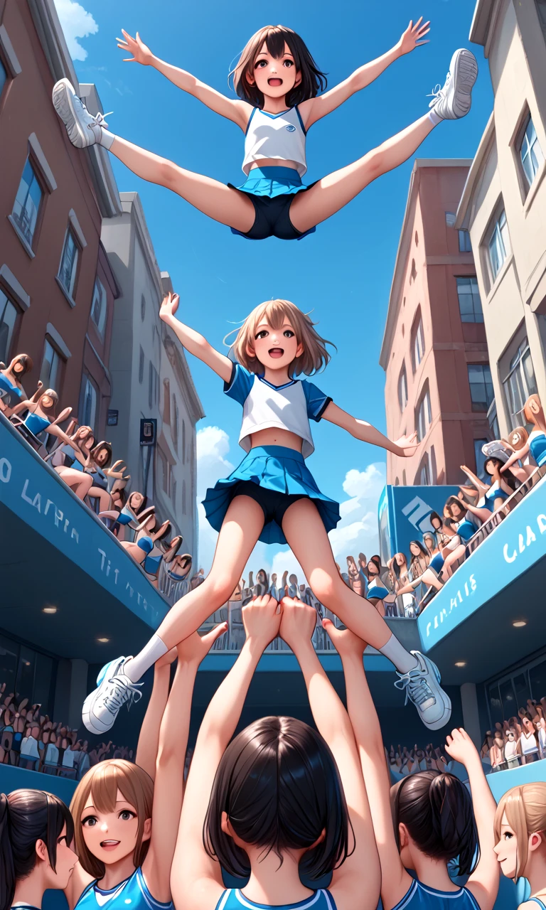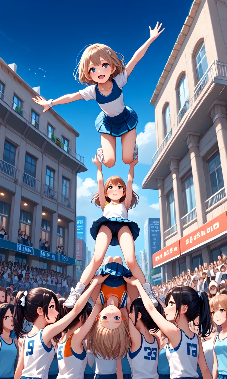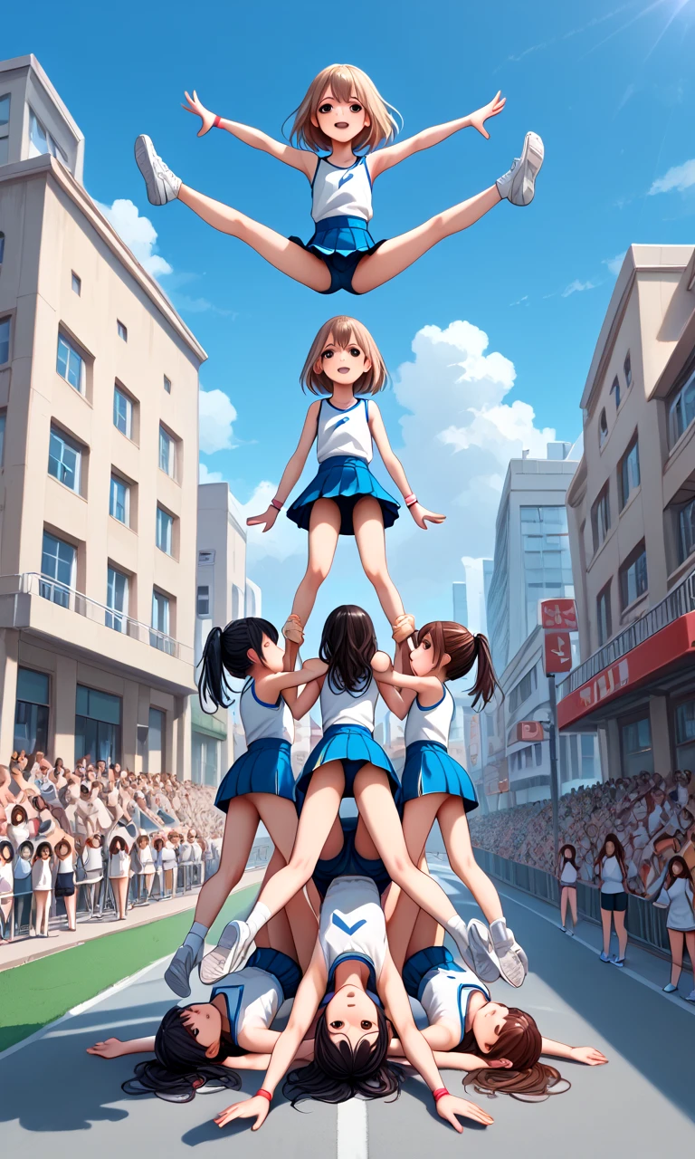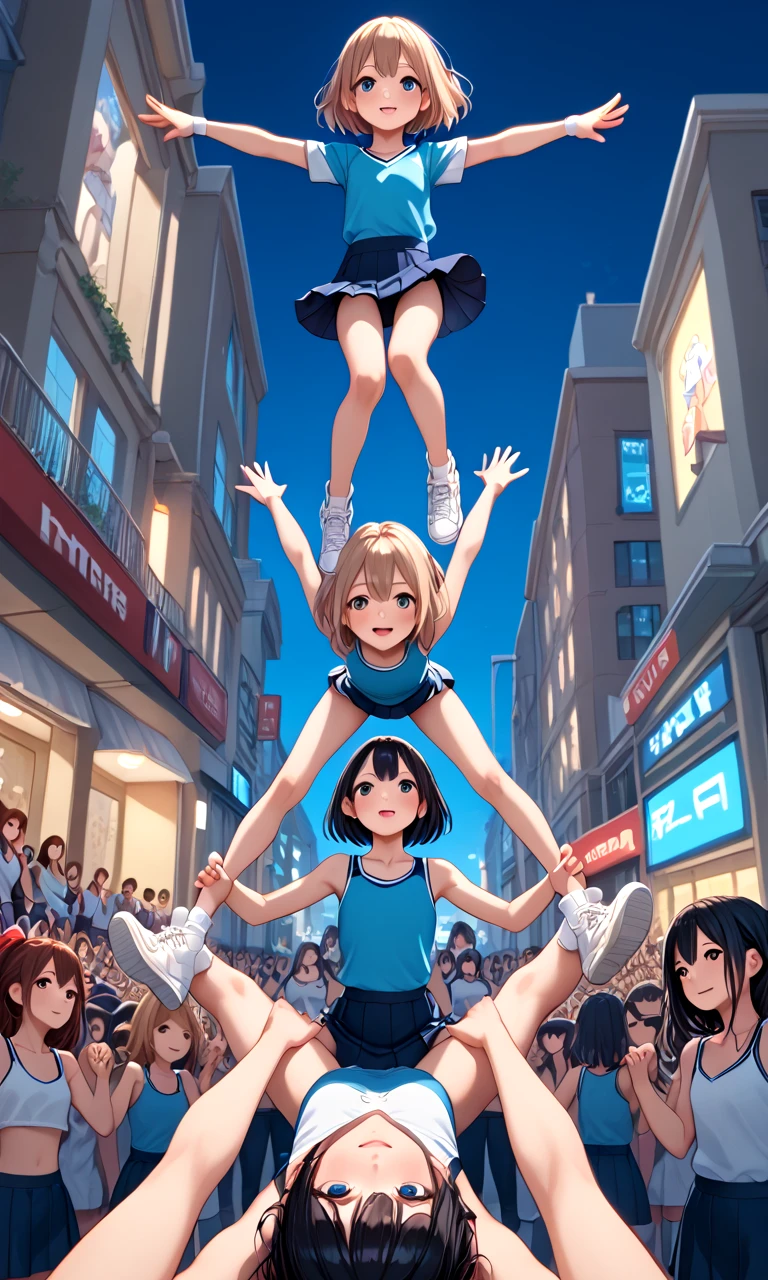 score_9, source_anime, cheerleading stunts, human towers, human stacking, multiple girls, 6+girls, outstretched arms, spread legs, lifting person, jumping, petite, audience, building, street, city, upside down, handstand,